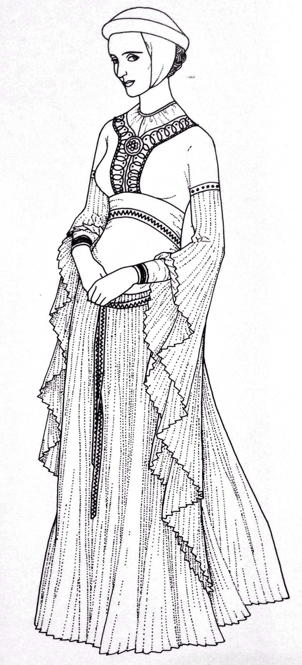 Dopo la metà del XII secolo il modo di vestire femminile divenne sempre più raffinato, la manica della veste acquisto caratteristiche importanti, si arricchì di fitte pieghette; l’abito si mutò in una complicata veste, cucita e rifinita con una gonna pieghettata oppure con una molto ampia e lunga.