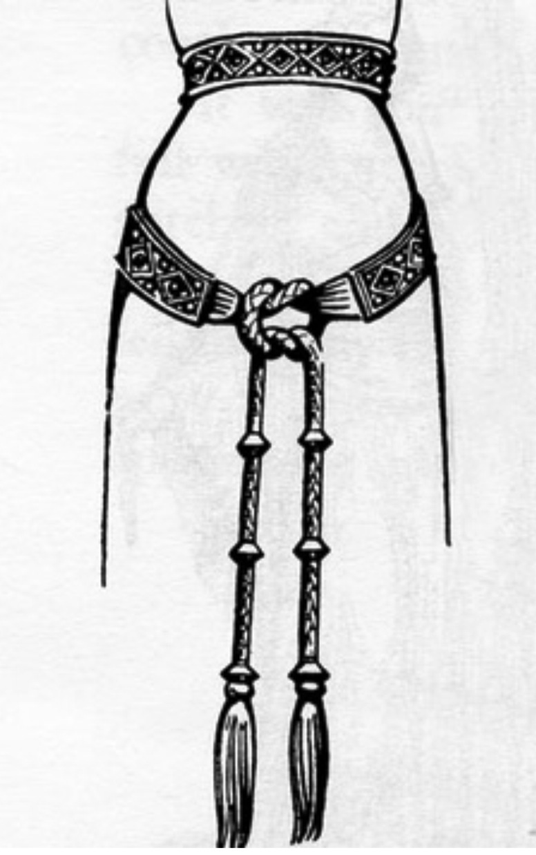 Il bliaud suggeriva l’uso di una cintura, “ceinture”, da indossare sulla vita, appoggiata ai fianchi, in stoffa o in pelle decorata con inserti di metallo e spesso veniva girata due volte attorno all’addome e annodata con un semplice nodo che le permetteva di scendere lungo la parte centrale della gonna.