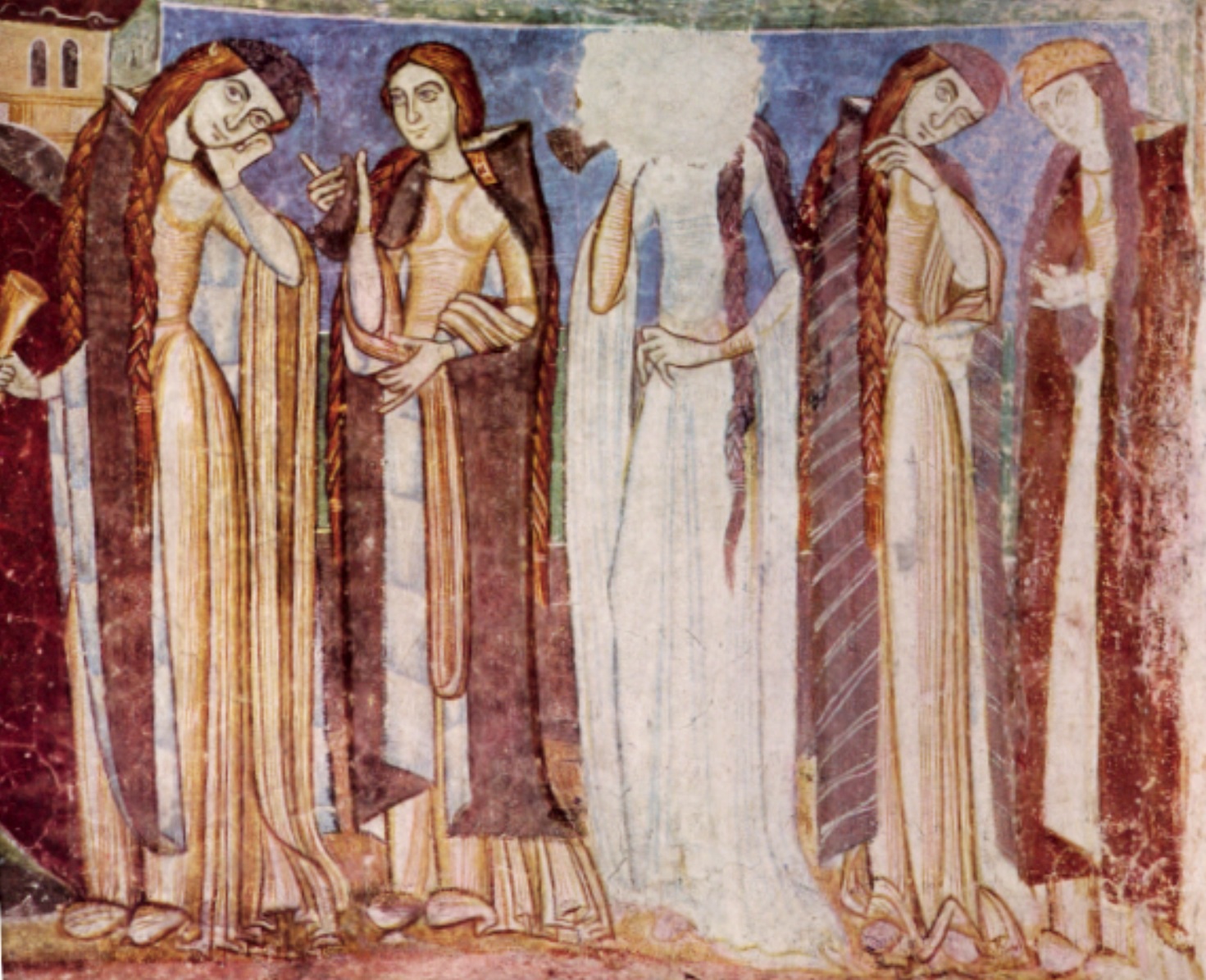 Nella storia delle vergini stolte di Castel d’Appiano in Trentino Alto Adige la figura femminile indossa un bliaud con lunghe maniche fluenti e la vita stretta.