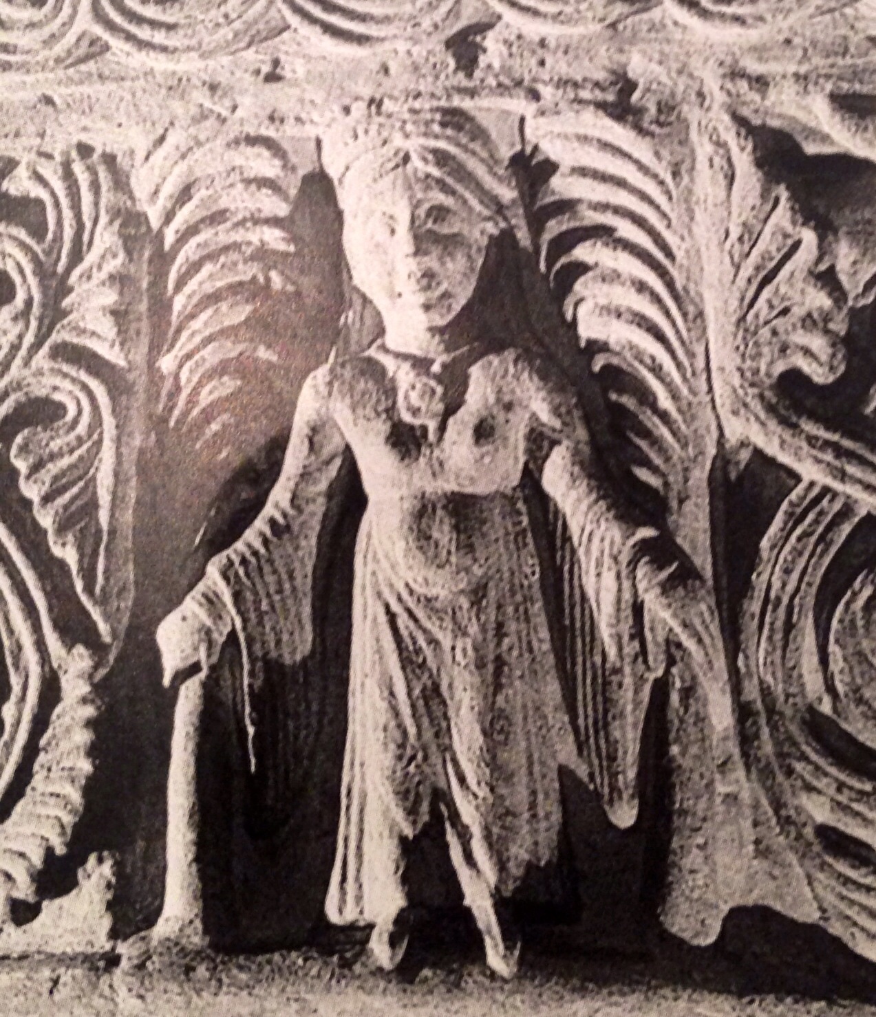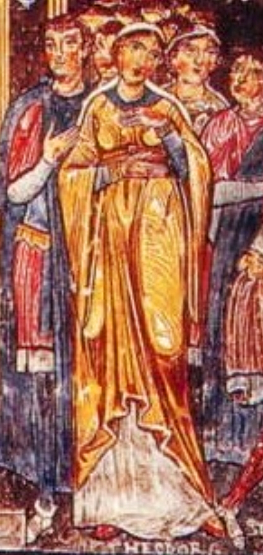 Un affresco nella Chiesa di San Clemente, a Roma, la donna indossa un bliaud con le maniche rotonde che cominciano ad allargarsi sopra al gomito e un velo legato dietro il collo.