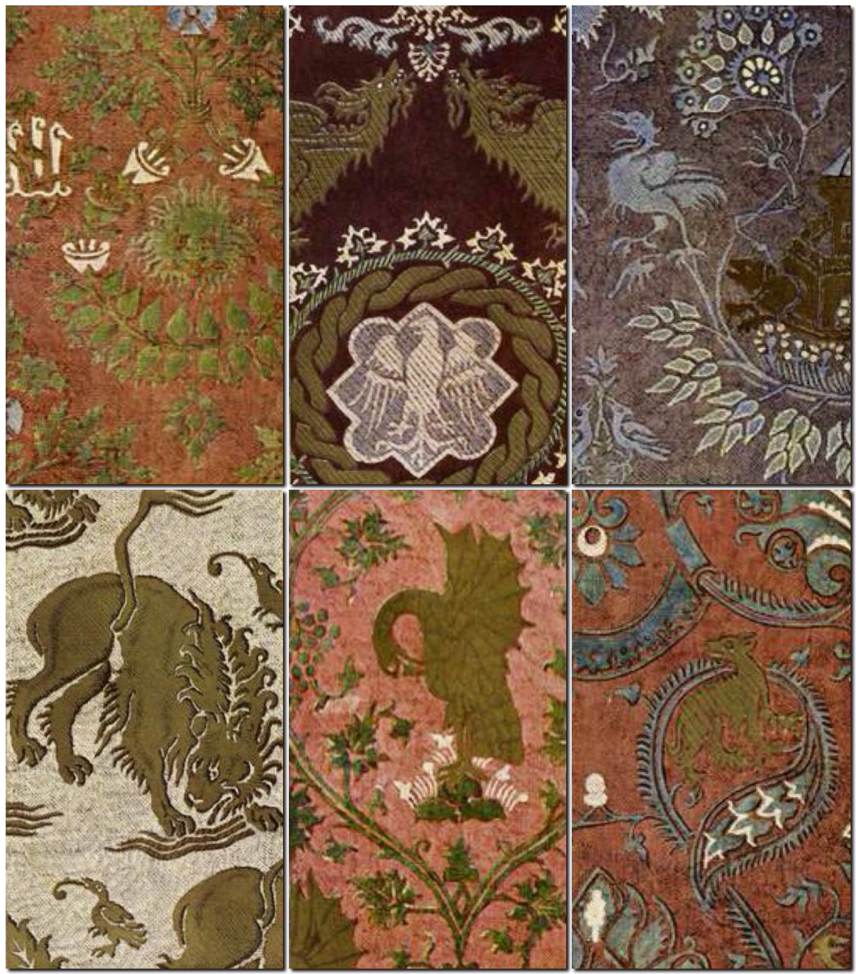 Tessuto damascato italianoI colori delle vesti erano sgargianti e contrastanti nei ranghi alti, mentre erano intonati, scuri o sbiaditi nei ranghi bassi. Il colore nero, nel XIV secolo, non era particolarmente usato in quanto veniva associato all’idea di morte e di lutto, di tristezza e di dolore, pur dovendo essere usato per gli abiti da indossare nelle cerimonie funebri, spesso non era volutamente utilizzato.