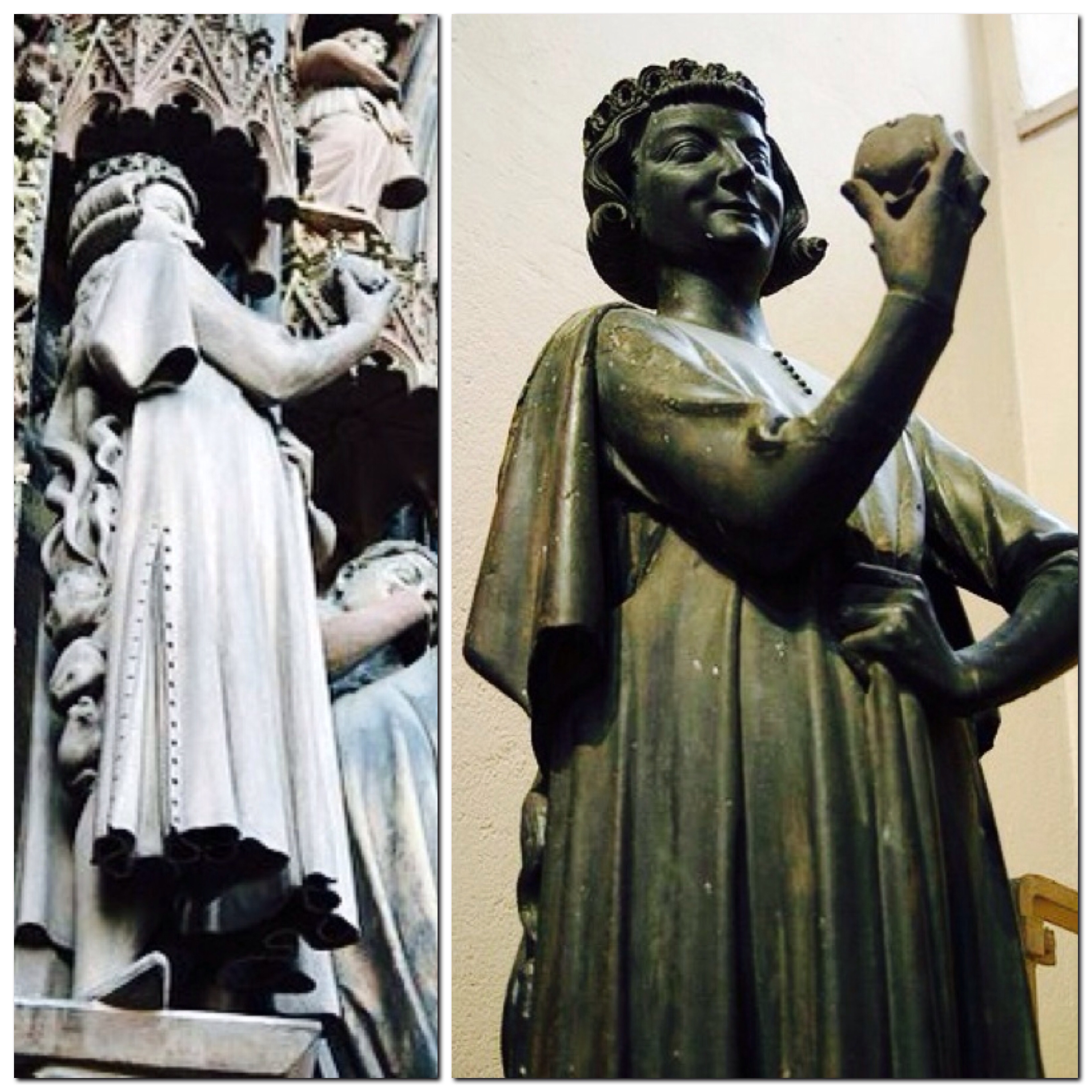 Pelicon, Cattedrale di Nostra Signora di Strasburgo, FranciaLe donne sposate nell’Europa del nord e dell’est, indossavano diversi tipi di copricapi come il “soggolo” già in uso nei decenni precedenti, si trattava di una fascia di fibra di lino o seta che passava sotto la gola e veniva fissata sulla testa circondata da una rigida fascia. In Francia era di moda che il “barbet”, simile al soggolo che, come questo, poteva essere indossato con o senza il “couvrechef” cioè il velo sopra; per le donne nubili era sufficiente intrecciare i capelli, senza coprirli.