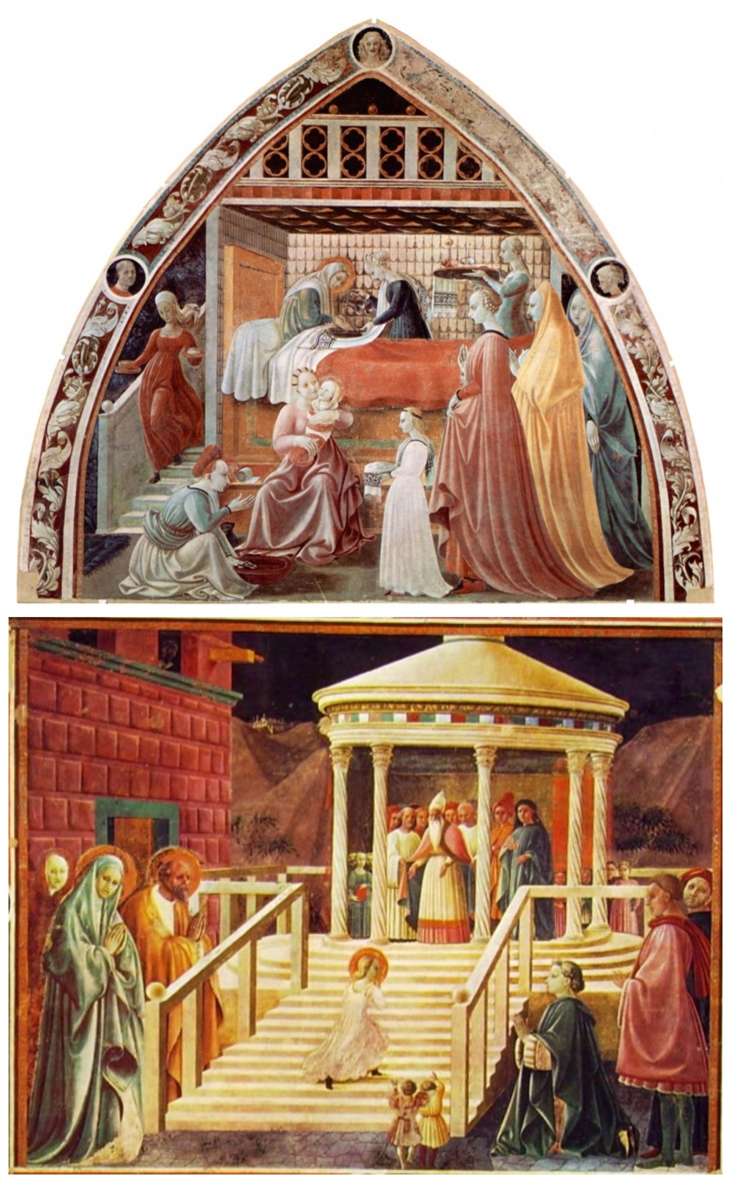 La veste, conosciuta come in passato con il nome di “gonnella”, indossata al di sopra della camicia, presentava due tipologie di scollatura: rotonda soprattutto dal 1420 e “a barchetta” ampiamente diffusa alla fine del 1300. Il taglio rotondo era più alto frontalmente e più basso sulla schiena lasciando intravedere qualche centimetro di camicia visibile nelle opere di Beato Angelico “Madonna con il Bambino e dodici angeli” del 1422, “L’imposizione del nome al Battista” del 1428 e “Predica di San Pietro alla presenza di San Marco” del 1434 o nelle opere di Paolo Uccello “Natività della Vergine” del 1435 e, con scollo ampio rotondo sulla schiena “Presentazione della Vergine al tempio” sempre del 1435 o anche nell’opera di Stefano di Giovanni di Consolo (Cortona, 1400 – Siena, 1450), conosciuto con lo pseudonimo Sassetta, “Matrimonio mistico di San Francesco” databile tra il 1437 e il 1444.
