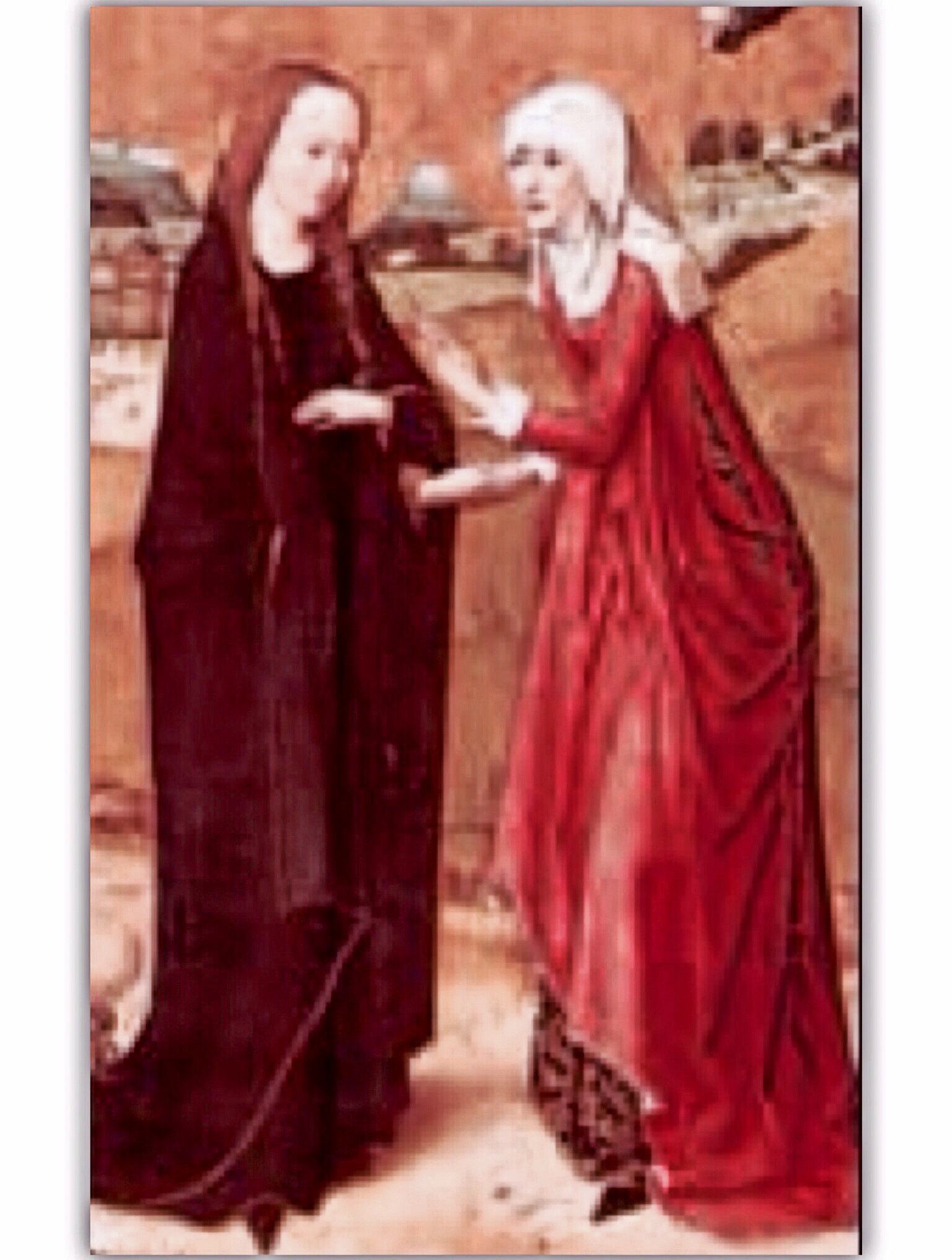 Particolari. La Visitation. Triptyque de l’Annonciation. DepostionNei ceti più bassi, come si riscontra nei Tacuinum Sanitatis, le donne sopra alla gonnella erano solite ad indossare un grembiule, sia nei lavori in casa sia fuori, per proteggere l’abito. Il grembiule era confezionato in casa con tela di canapa o lino e si allacciava in vita. Quest’uso era comune anche tra le serve di corte in quanto erano adibite alla cucina e alla pulizia.