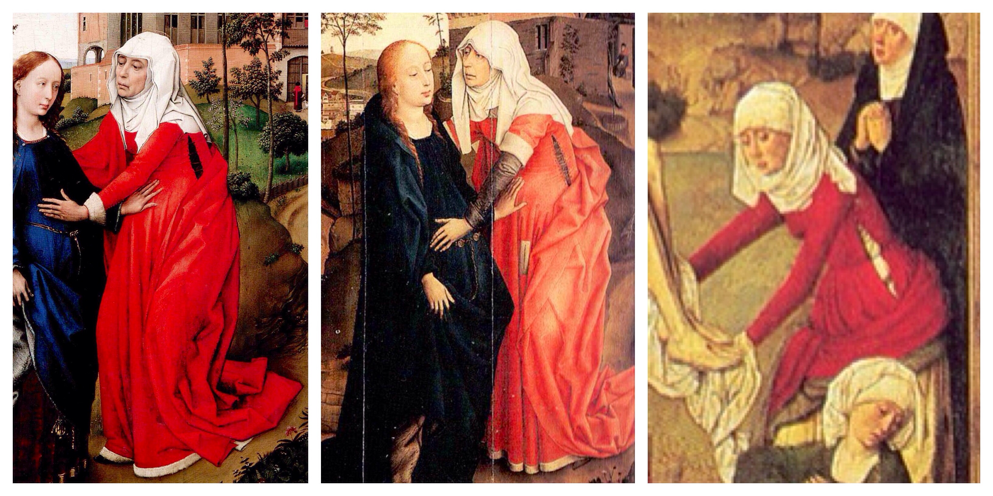 Questo tipo di allacciatura si può vedere in Italia dal Maestro della vita di Maria, conosciuto con questo nome in quando autore di un altare con scene della vita di Maria nella chiesa di Sant’Orsola (sette tavole conservate a Monaco, Alte Pinakothek, una a Londra, National Gallery) nella “Visita della Madonna ad Elisabetta” della prima metà del XV secolo esposto a Monaco, o nel 1450 in Piero della Francesca con “La Madonna del Parto” in cui è già presente l’allacciatura frontale tipica della seconda metà del secolo, ma rimane nell’abito ancora il taglio sul fianco. Sempre ben visibili anche nelle opere di Van der Weyden come ne “La Visitation” del 1435 o nella “Triptyque de l’Annonciation” del 1434 nel polittico con la Natività o ne la “Depostion” del 1440. Gli abiti sono chiusi grazie a queste fessure stringate che, una volta strette, diventavano tutt’uno con l’abito. I lacci era composti da fili di lana intrecciati, prodotti con uno strumento di legno simile ad una forcella, di derivazione anglosassone, conosciuto con il nome di “lucet” molto usato anche per l’abbigliamento maschile.
