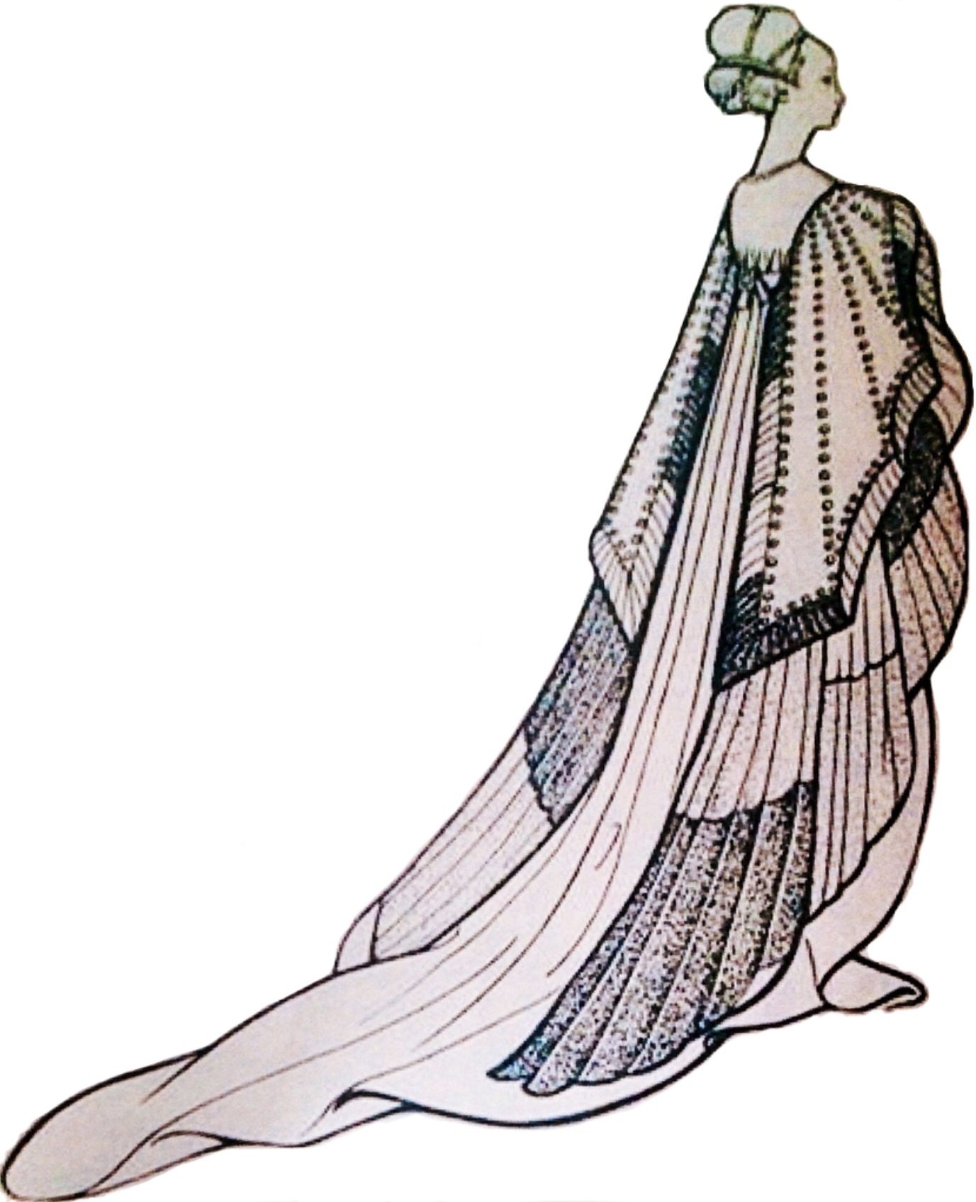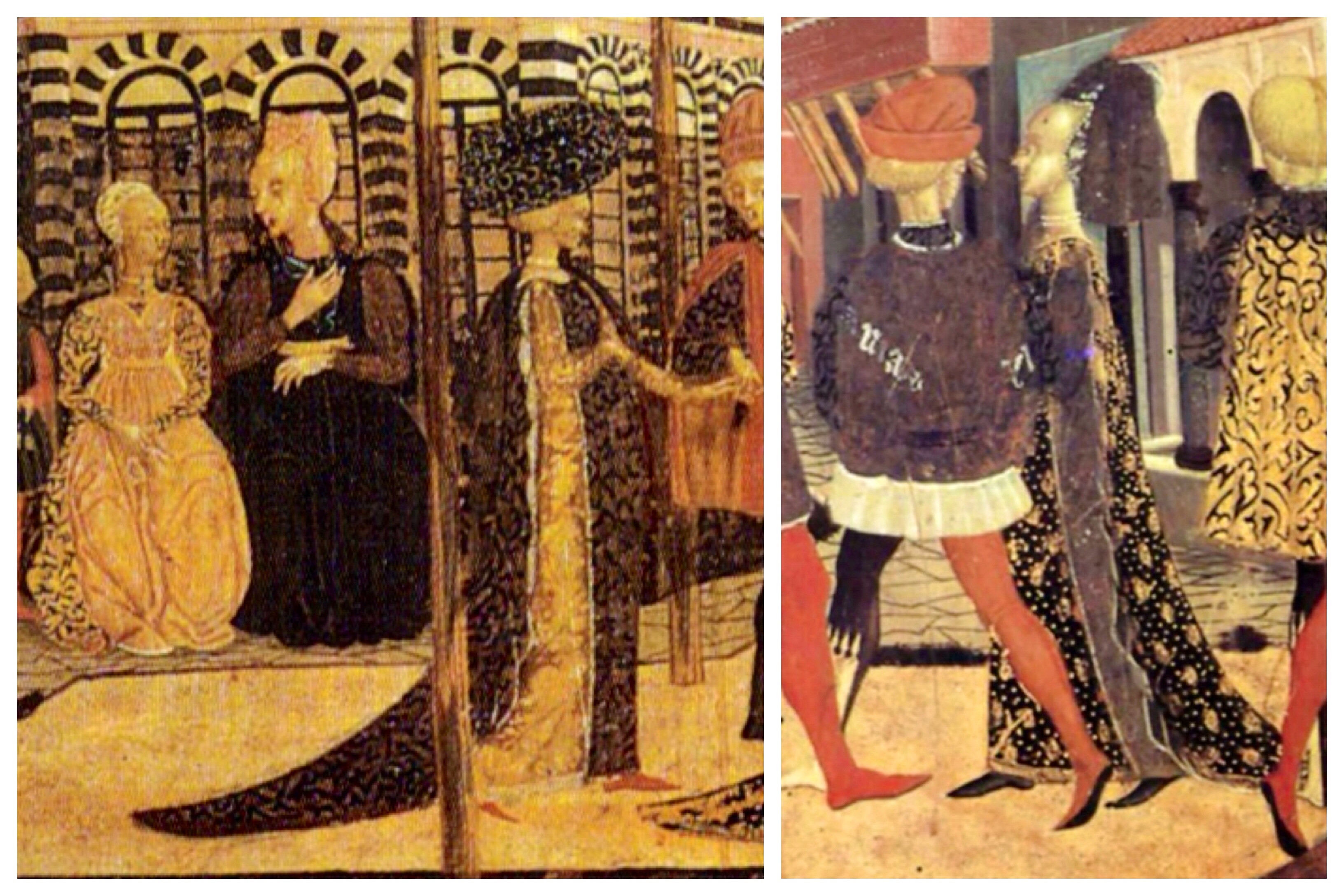 La Principessa d’Este di Pisanello del 1435 indossava una pellanda ampia ed importante con strascico con maniche a tromba a terra; la cintura era posizionata sotto al seno dalla quale la lunga coda della veste scendeva con ampie pieghe dando slancio alla figura. I capelli sono raccolti in nastri e fili di perle, lasciando la fronte completamente libera, come detta la moda di questo periodo.