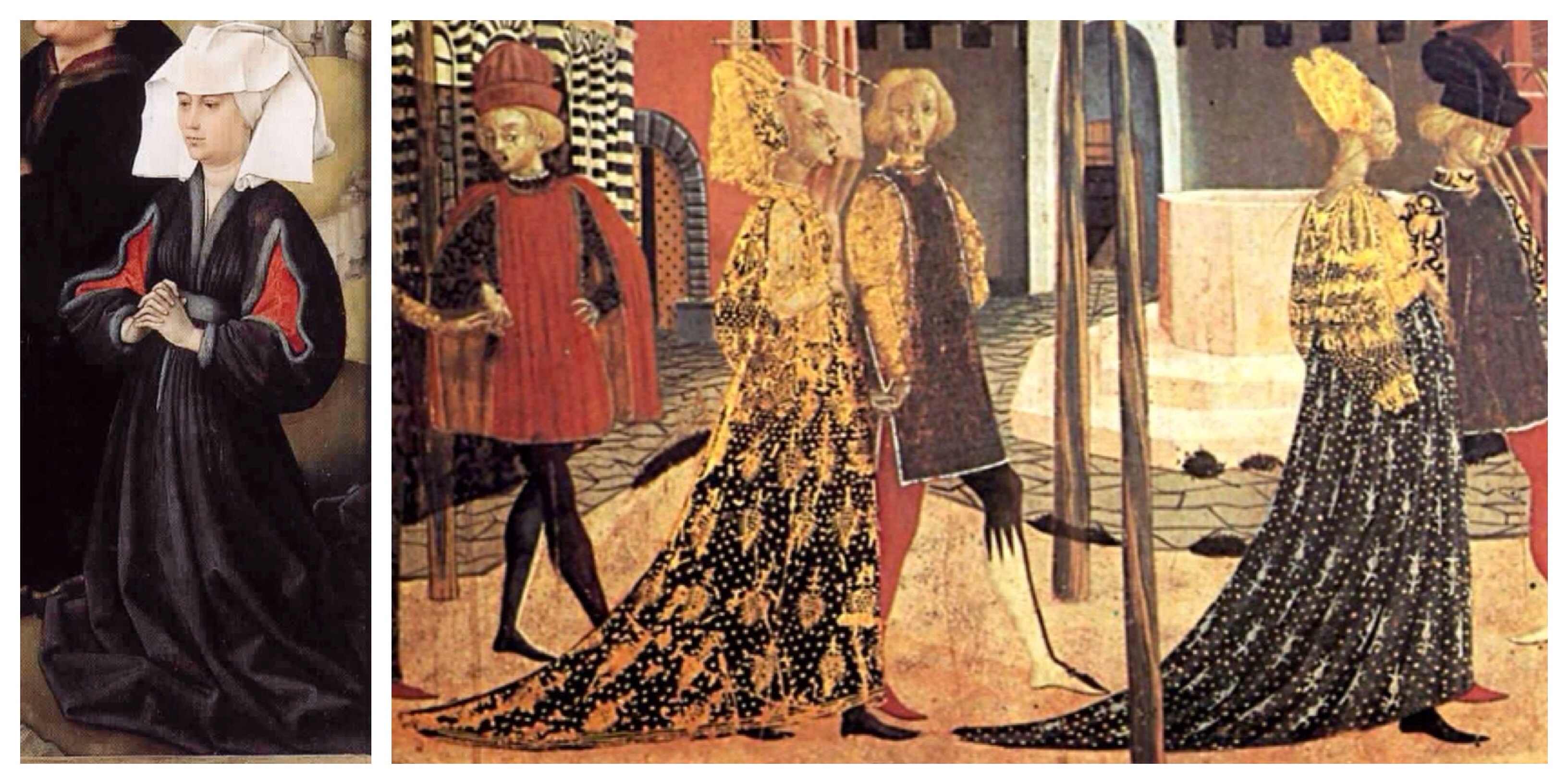 Questa tipologia di ampia scollatura diffusa alla fine del XIV secolo nelle vesti femminili, si trova nei Tacuinum Sanitatis; le immagini mostrano quanto fosse scoperta realmente la pelle come anche nell’illustrazione del 1406 tratta dall’opera di Christine de Pizan.
