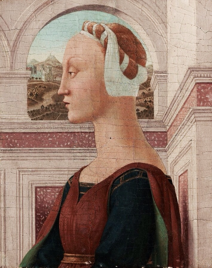 Particolari. Ritratto alla National Gallery di Londra. Dipinto alla Biblioteca Nazionale Austriaca di Vienna. Affresco al Palazzo Borromeo di MilanoNelle opere pittoriche sopra elencate, si mettono in luce vari stili di acconciature; le donne della prima metà del Quattrocento avevano ampia scelta sulle pettinature, da semplici chignon sul sommo capo a quelli intrecciati con nastri e perle e solitamente tenuti da crespine (reticelle che sorreggevano l’acconciatura già in uso alla fine del Trecento) o alti copricapi come quelli “a sella” indossati dalle donne in “Christine de Pizan presenta il suo libro ad Isabella di Baviera” o nel “Corteo nuziale”, utilizzati anche finissimi veli di seta. Una caratteristica fondamentale del periodo era la fronte alta pertanto risultava oppurtuno rasarsi la parte alta della fronte, particolare ben visibile in “Dama che gioca a palla” e nei ritratti della principessa estense di Pisanello o come in “Ritratto di donna” del 1450 di Paolo Uccello in cui l’acconciatura è arricchita da gioielli o poteva essere semplicemente una treccia come nel particolare “Testa maschile e testa femminile” di Masaccio del 1425 in cui i capelli scendono liberamente lungo la schiena. Nelle immagini inerenti ai Tacuinum Sanitatis, anche le donne dei ceti più bassi portavano i capelli in diverse acconciature.