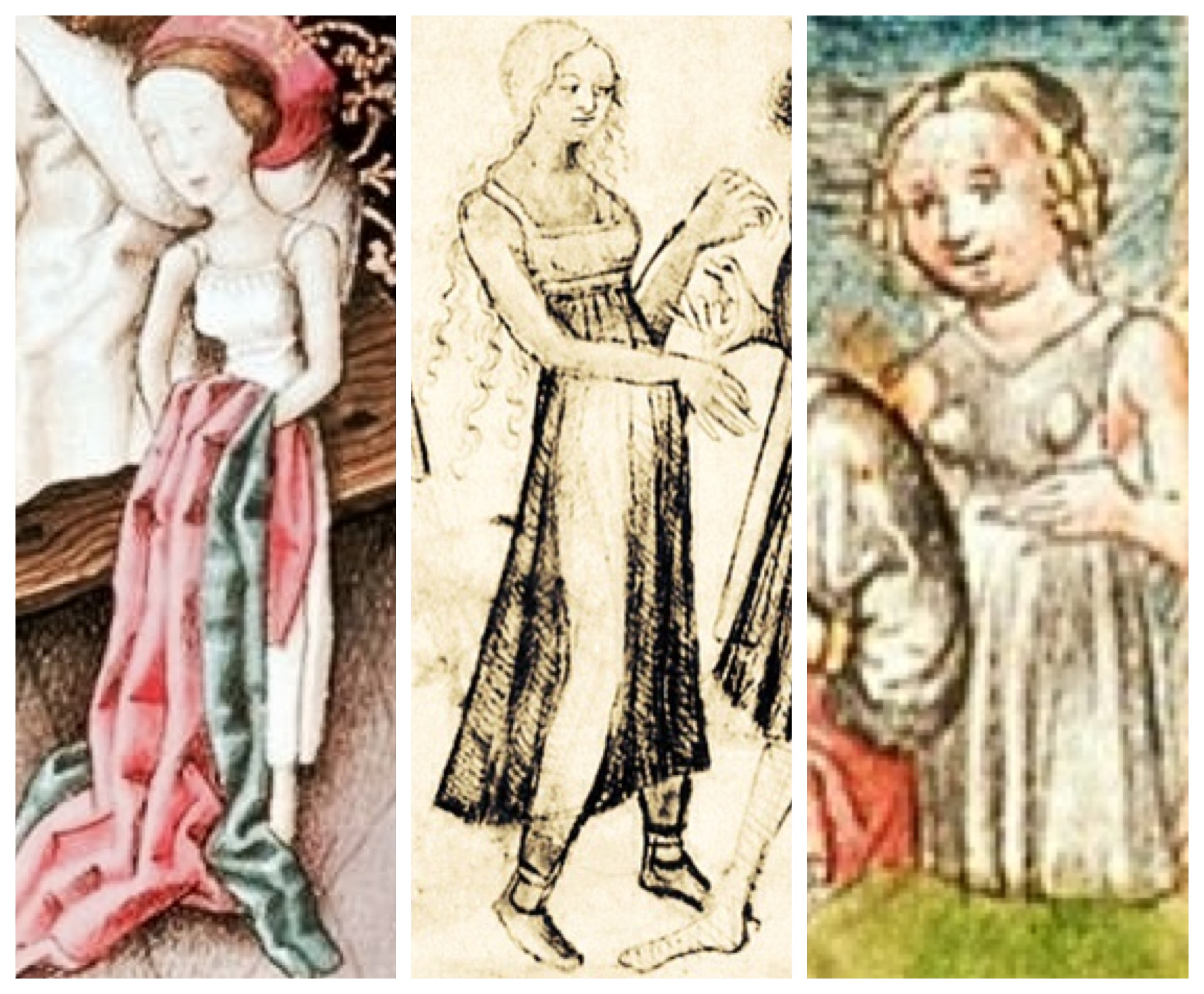 La camicia ha riferimenti illustrativi nei Tacuinum Sanitatis, negli Affreschi nel Castello della Manta come ne “La fontana della Giovinezza” del 1411/16, nell’opera dei primi del Quattrocento “Dionisio I umilia le donne di Locri” e riferimenti scritti, come nelle penitenze di Elena di Udine, che da vedova prese un voto di silenzio per espiare una vita peccaminosa, da cui si legge che possedeva una camicia usata per vestire se stessa o dal registro dei possedimenti del 1397 di Margherita Datini di Prato in cui si trovano anche camicie di lana per l’inverno.