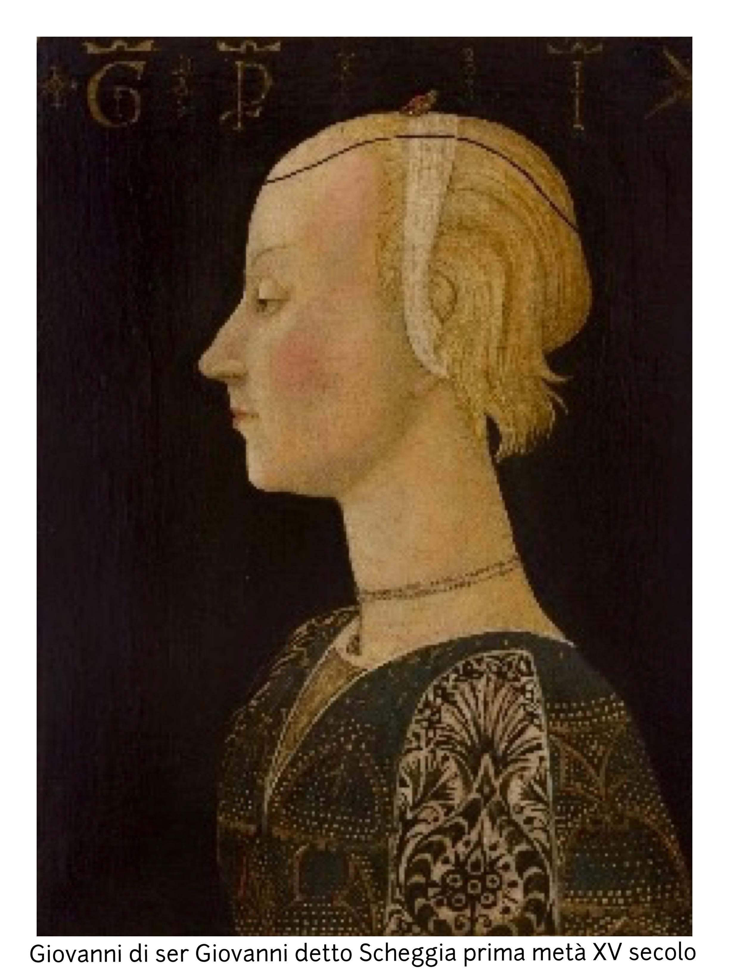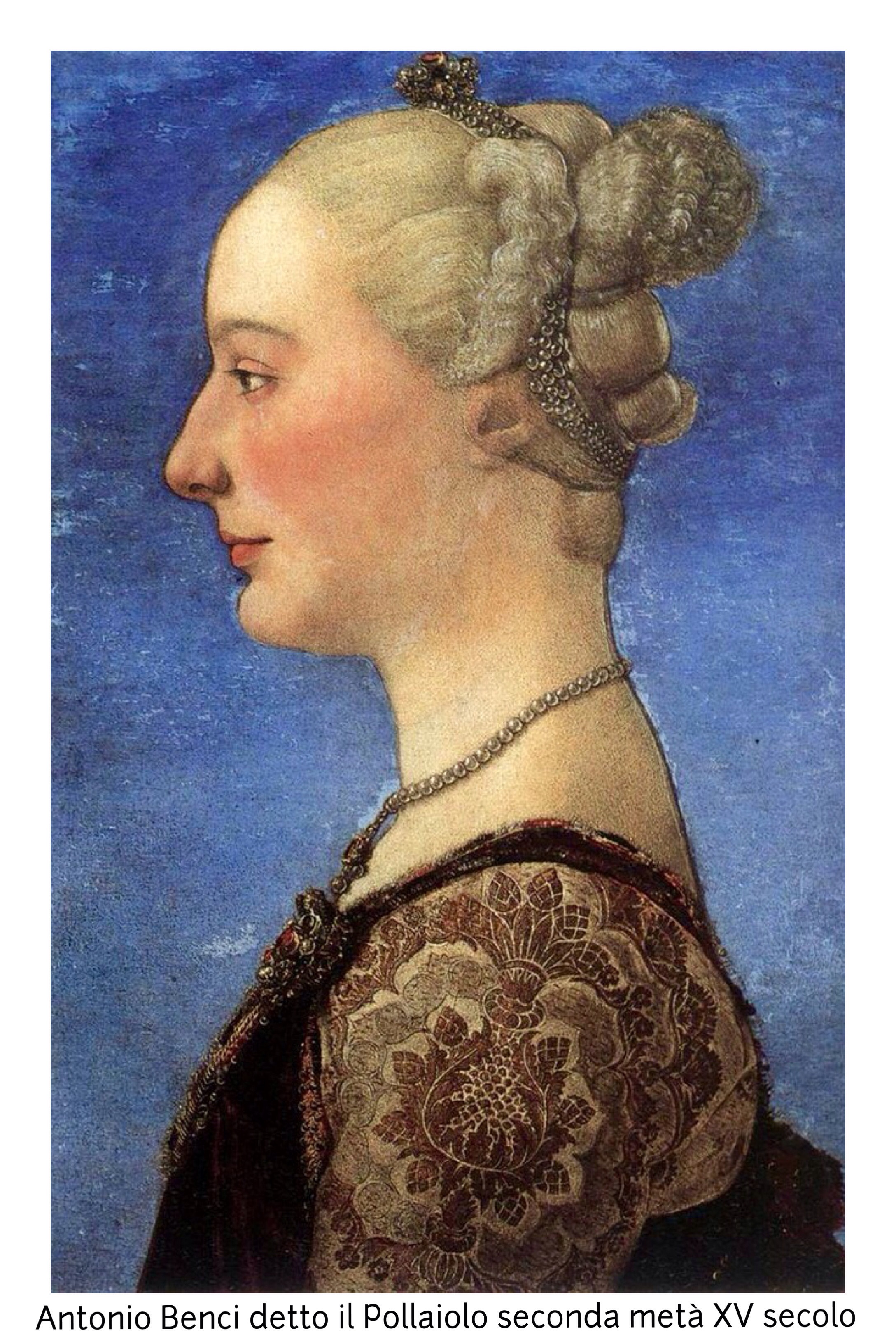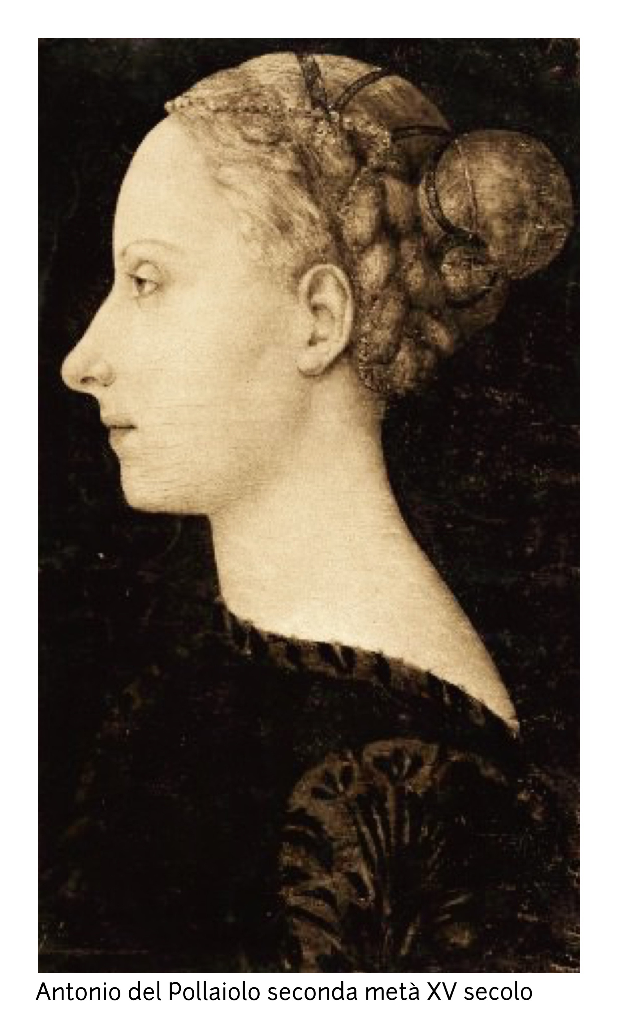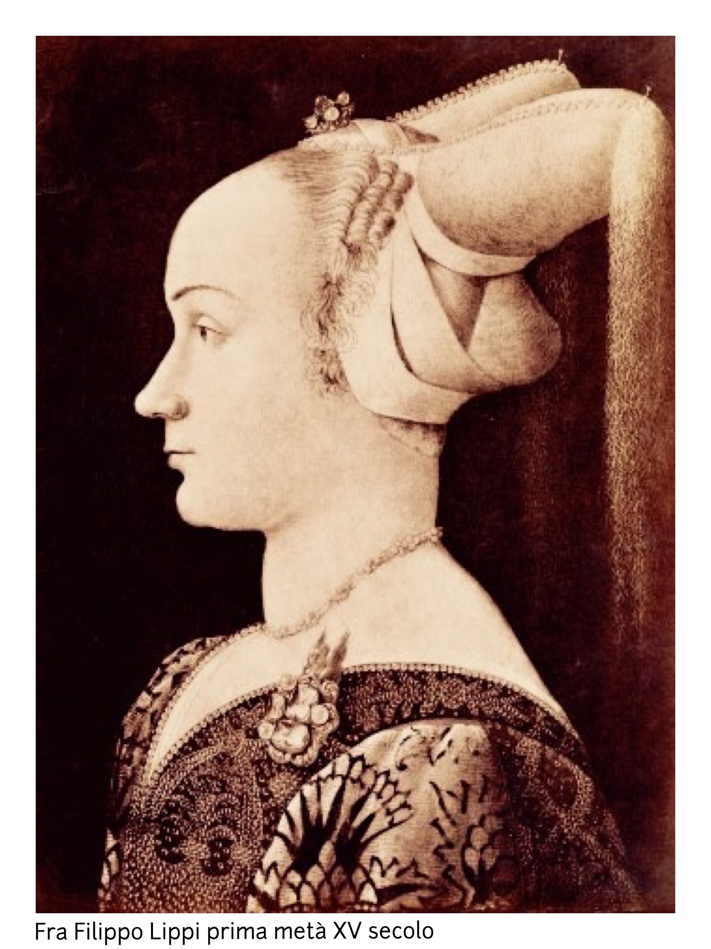 Con il 1400 sono apparse in Italia molte tipologie di acconciature ed ornamenti rendendo “i capelli” una vera e propria moda del periodo. Attraverso accessori (come piume e ricami, veli e nastri) e gioielli (come perle e pietre preziose, fermagli e oggetti di oreficeria) la testa diveniva emblema del proprio rango, del gusto e della sensibilità alla moda.