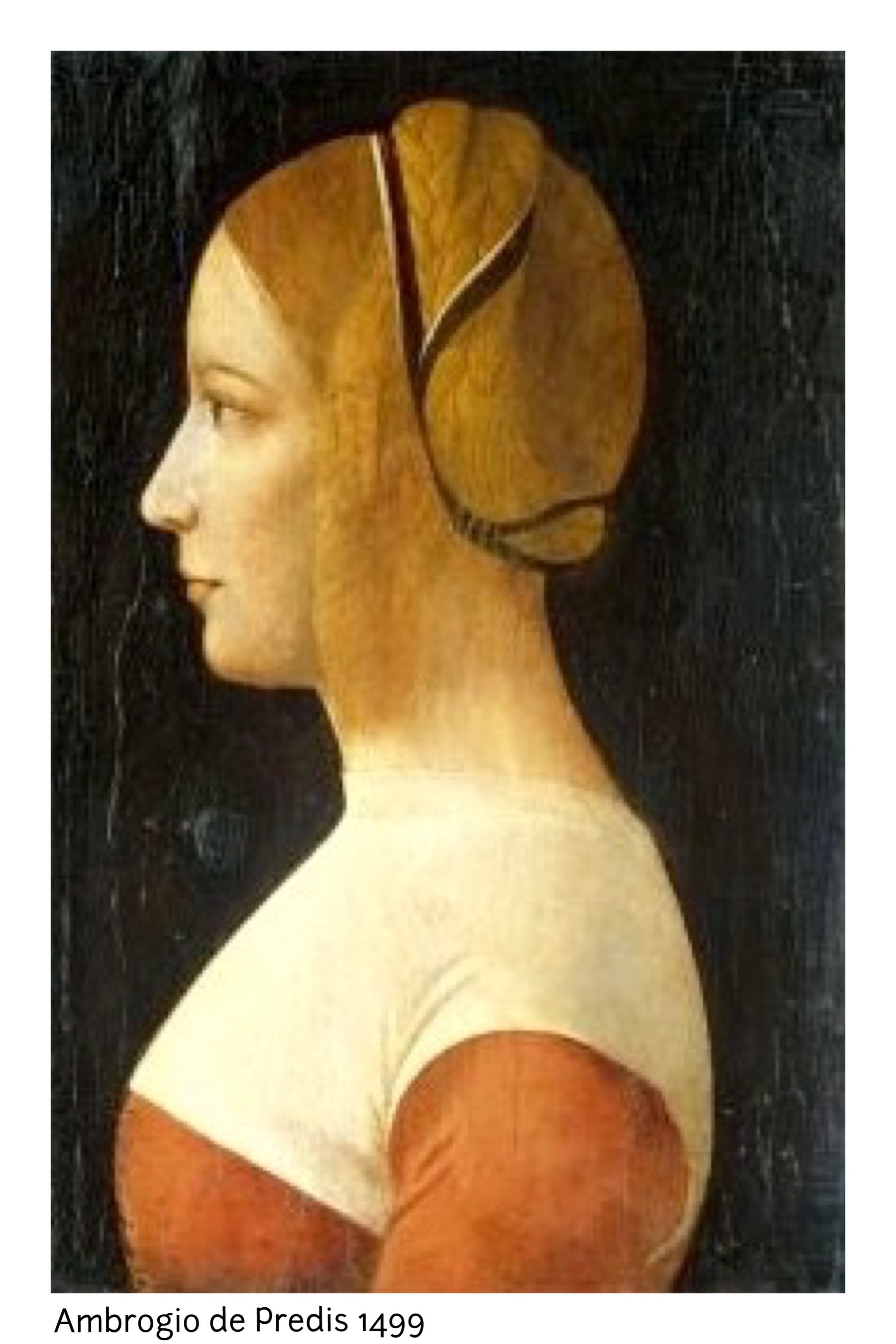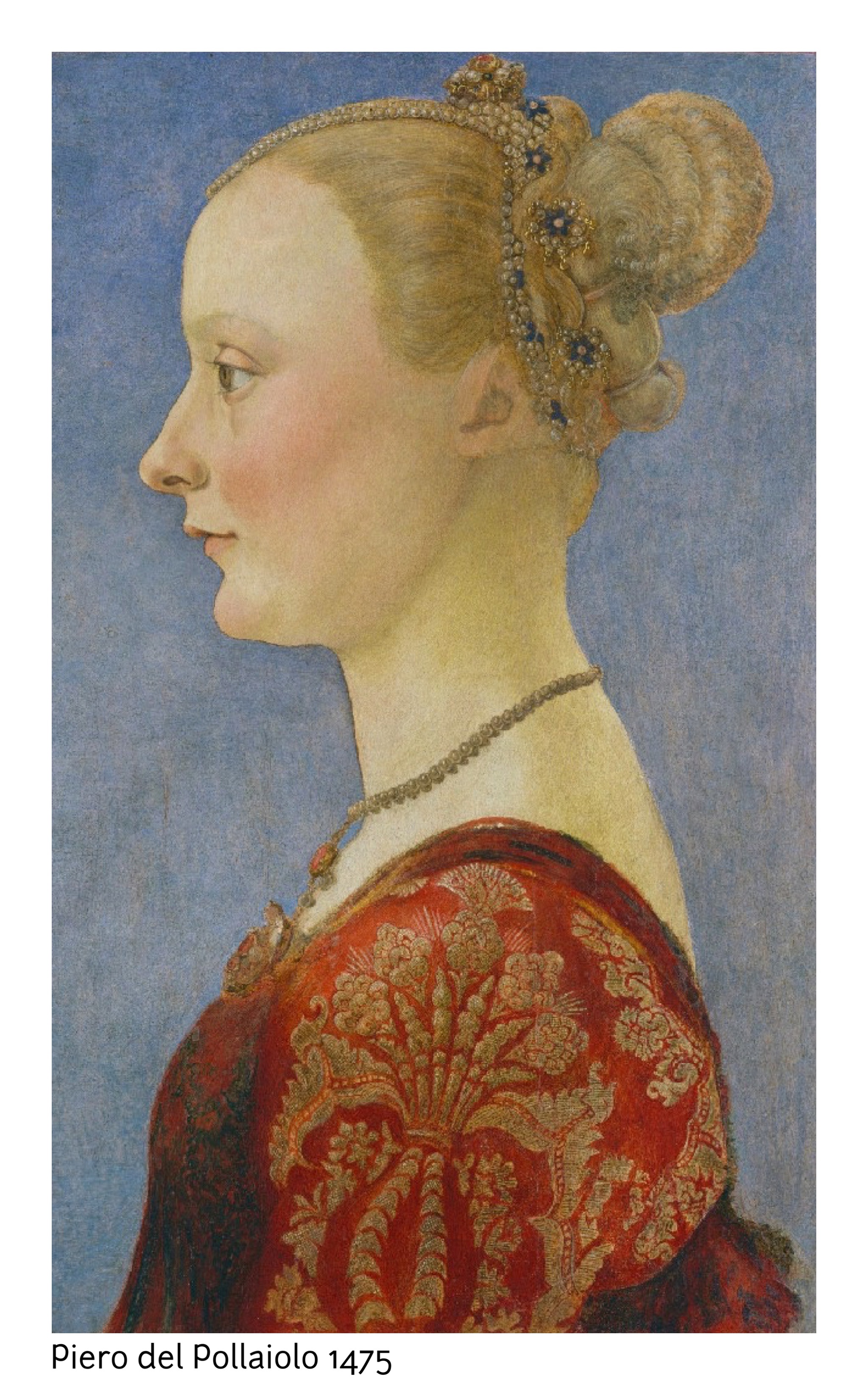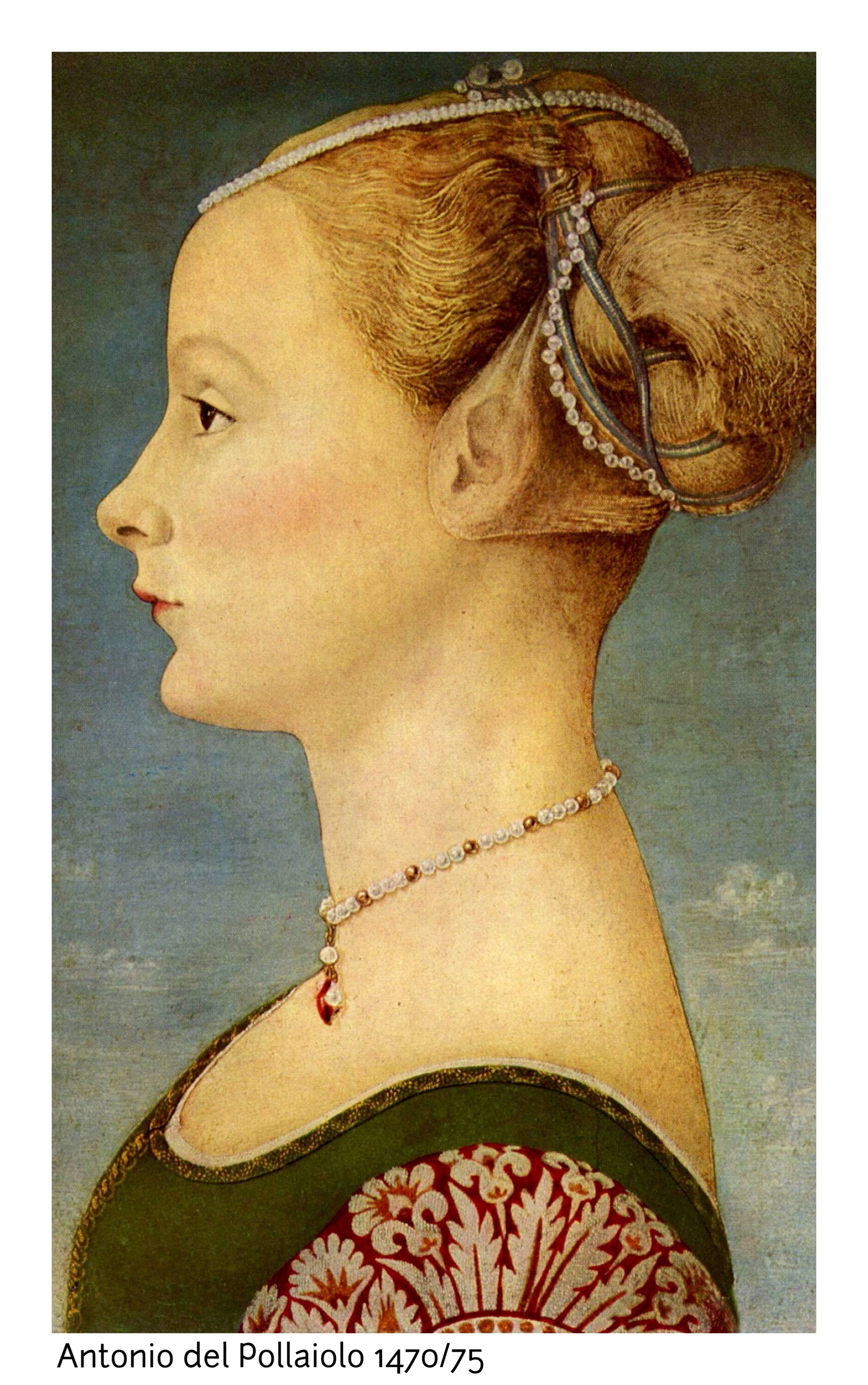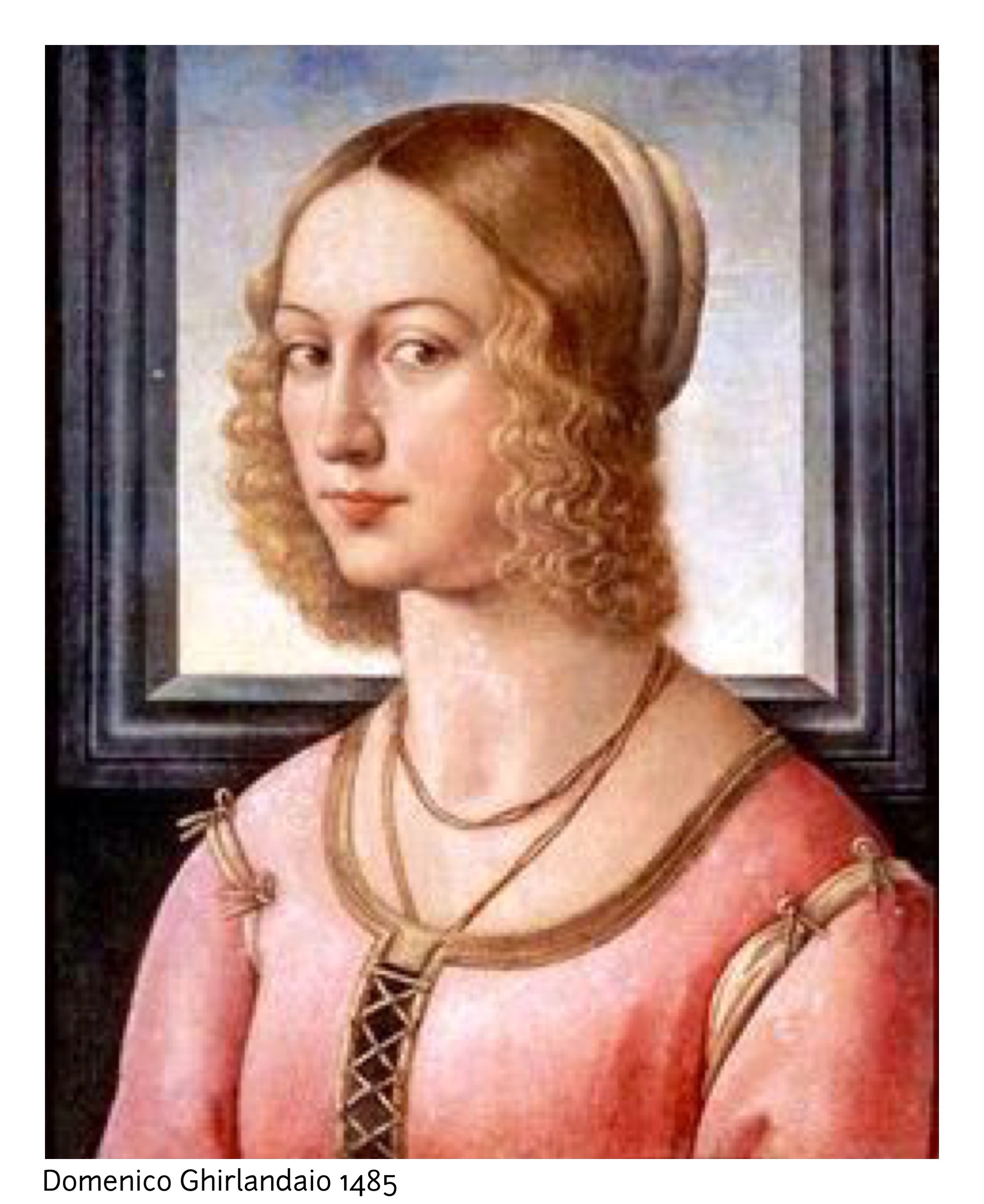 Con il 1400 sono apparse in Italia molte tipologie di acconciature ed ornamenti rendendo “i capelli” una vera e propria moda del periodo. Attraverso accessori (come piume e ricami, veli e nastri) e gioielli (come perle e pietre preziose, fermagli e oggetti di oreficeria) la testa diveniva emblema del proprio rango, del gusto e della sensibilità alla moda.