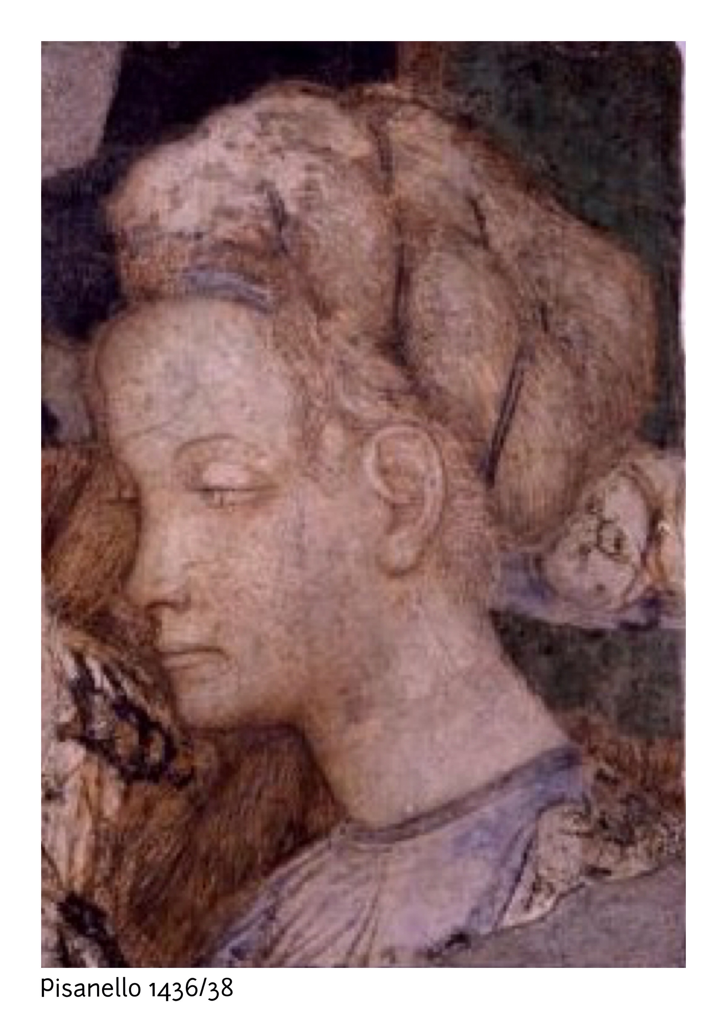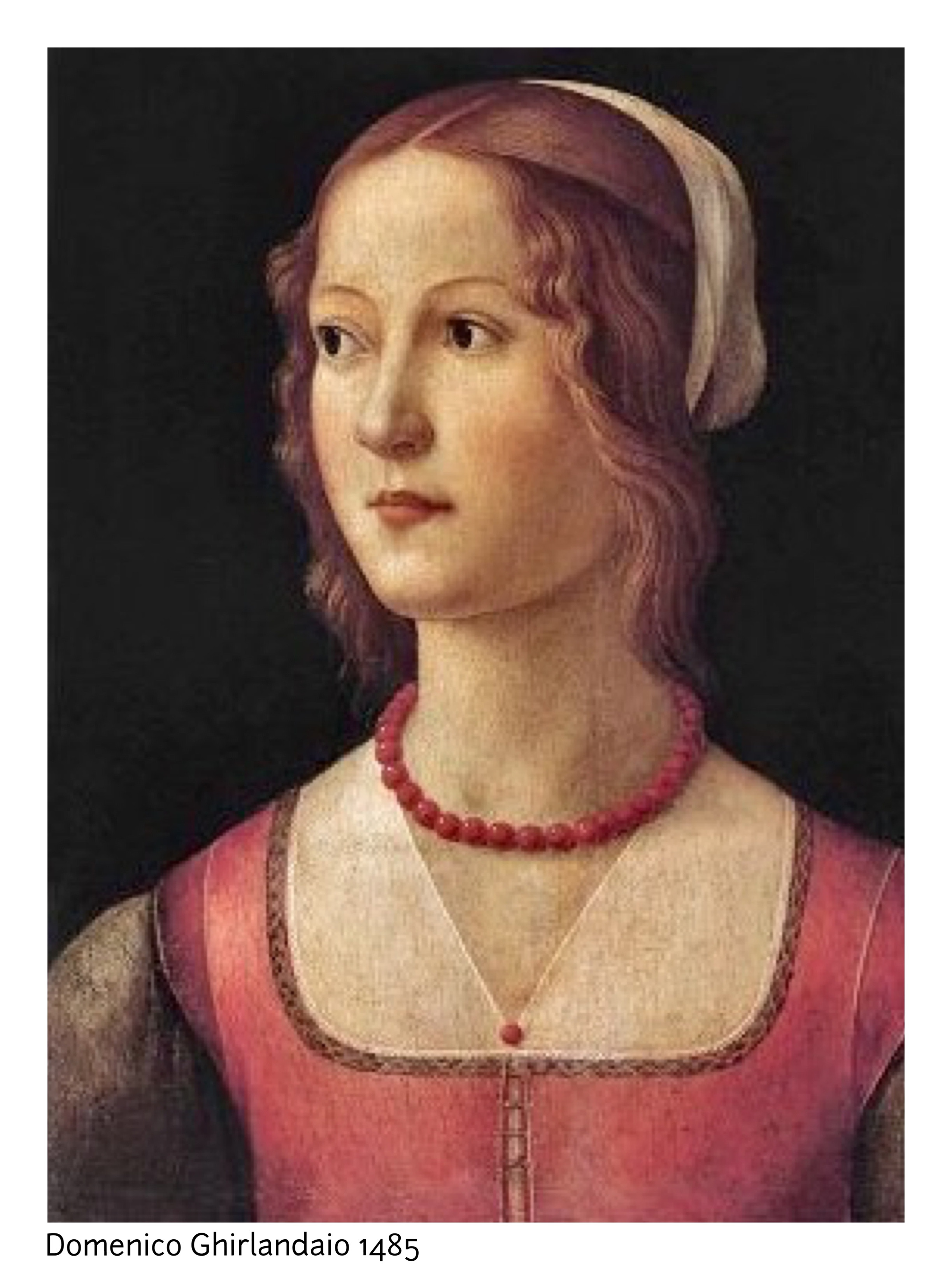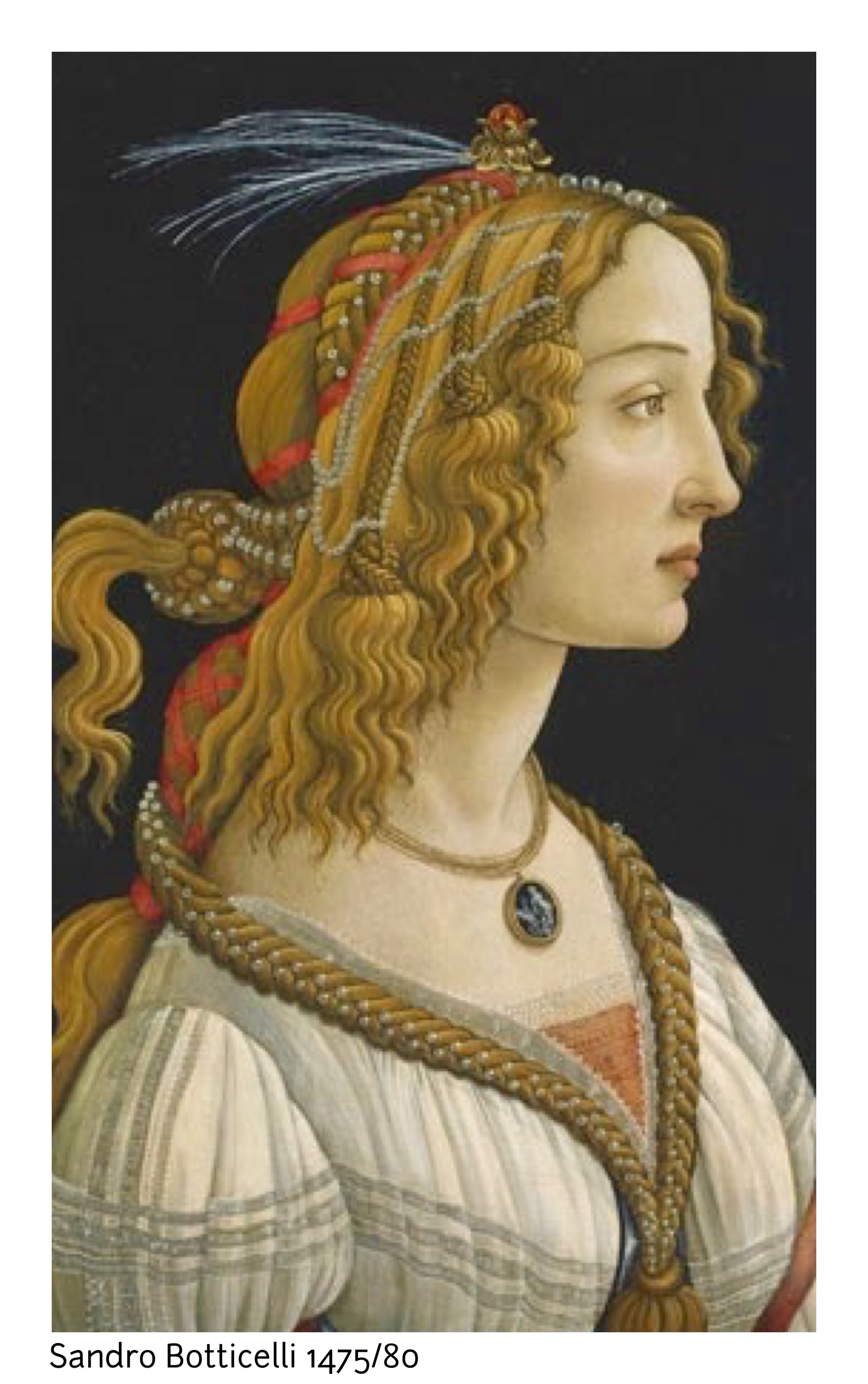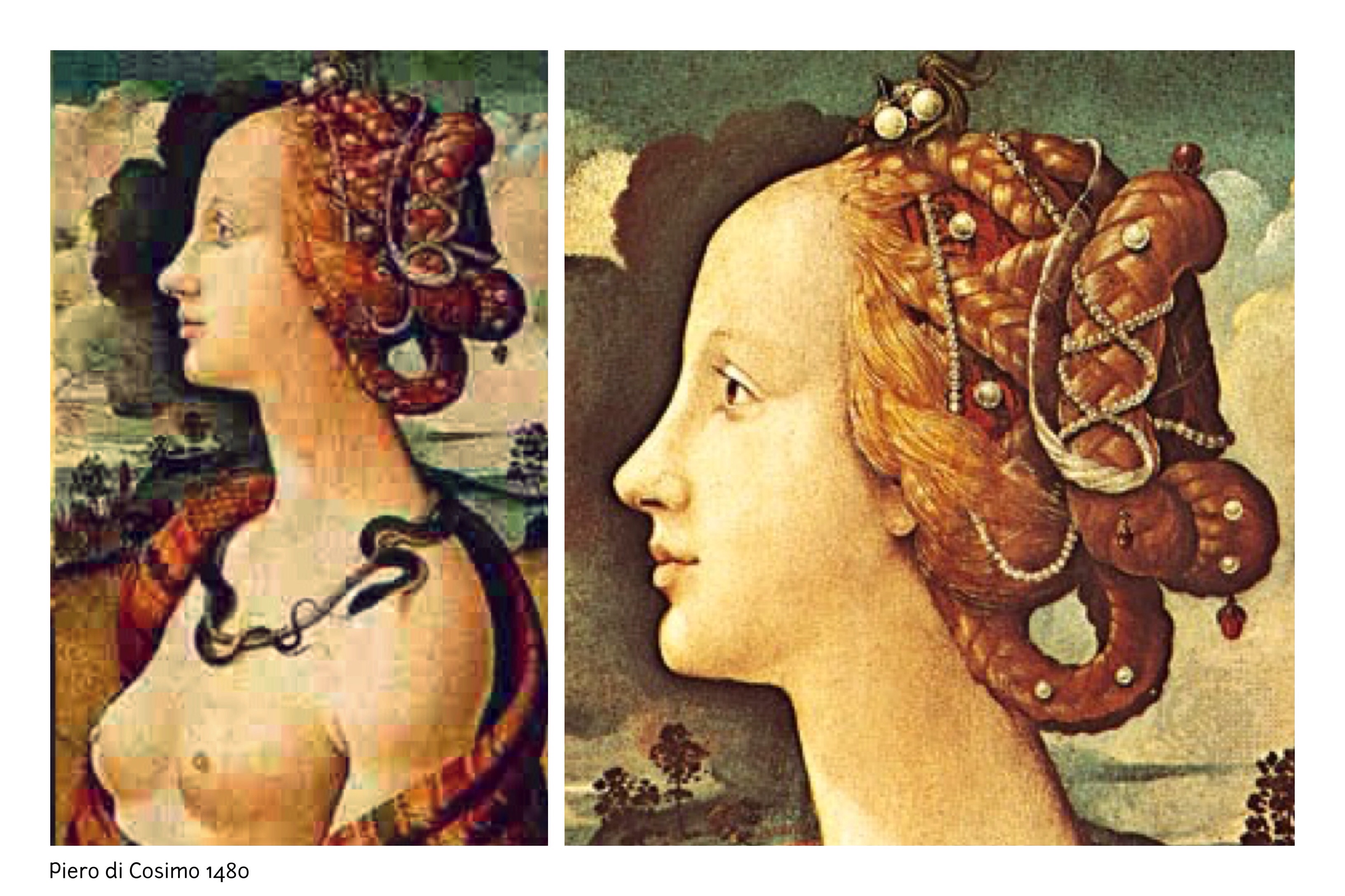 Con il 1400 sono apparse in Italia molte tipologie di acconciature ed ornamenti rendendo “i capelli” una vera e propria moda del periodo. Attraverso accessori (come piume e ricami, veli e nastri) e gioielli (come perle e pietre preziose, fermagli e oggetti di oreficeria) la testa diveniva emblema del proprio rango, del gusto e della sensibilità alla moda.