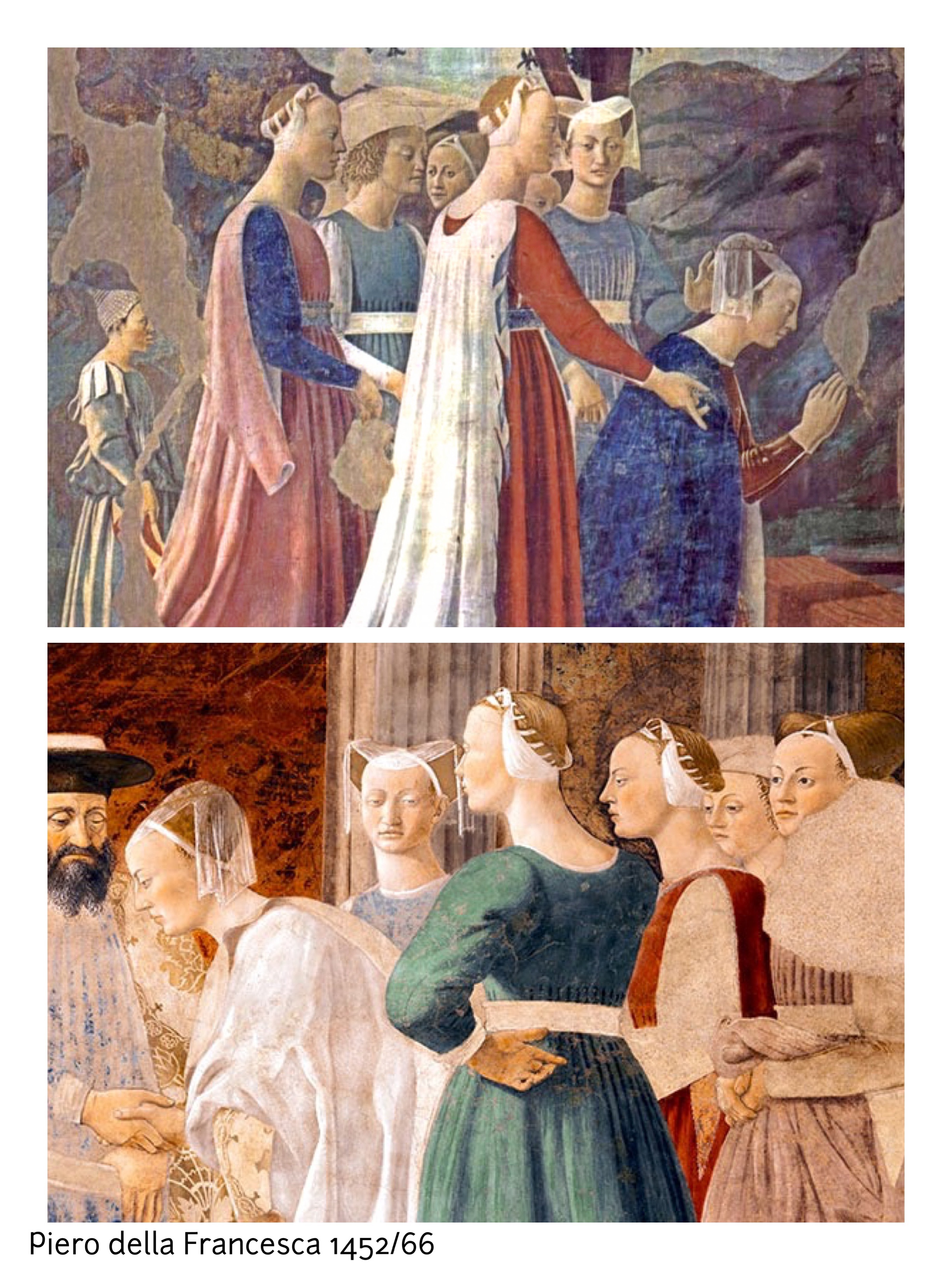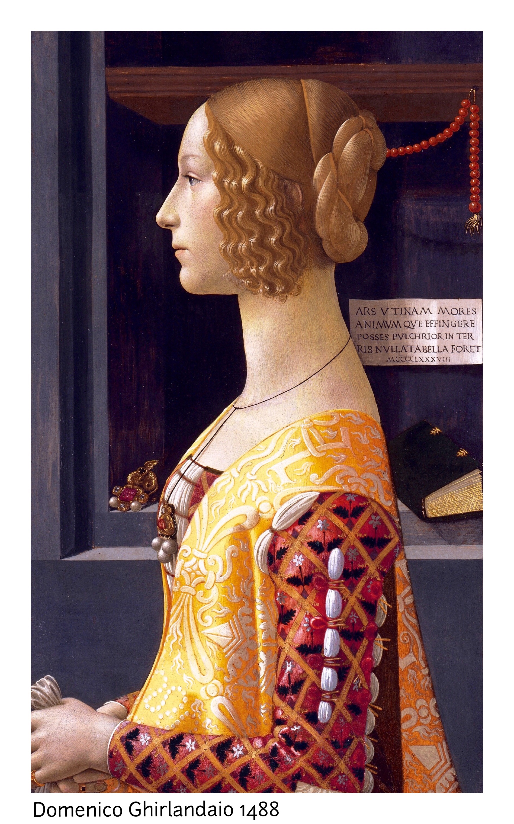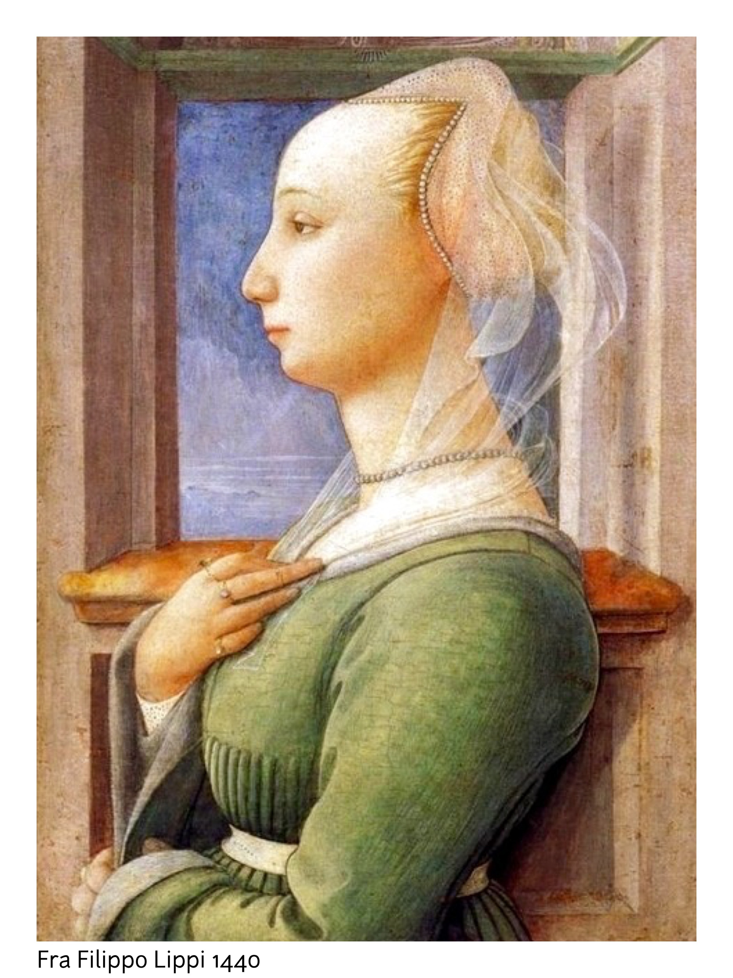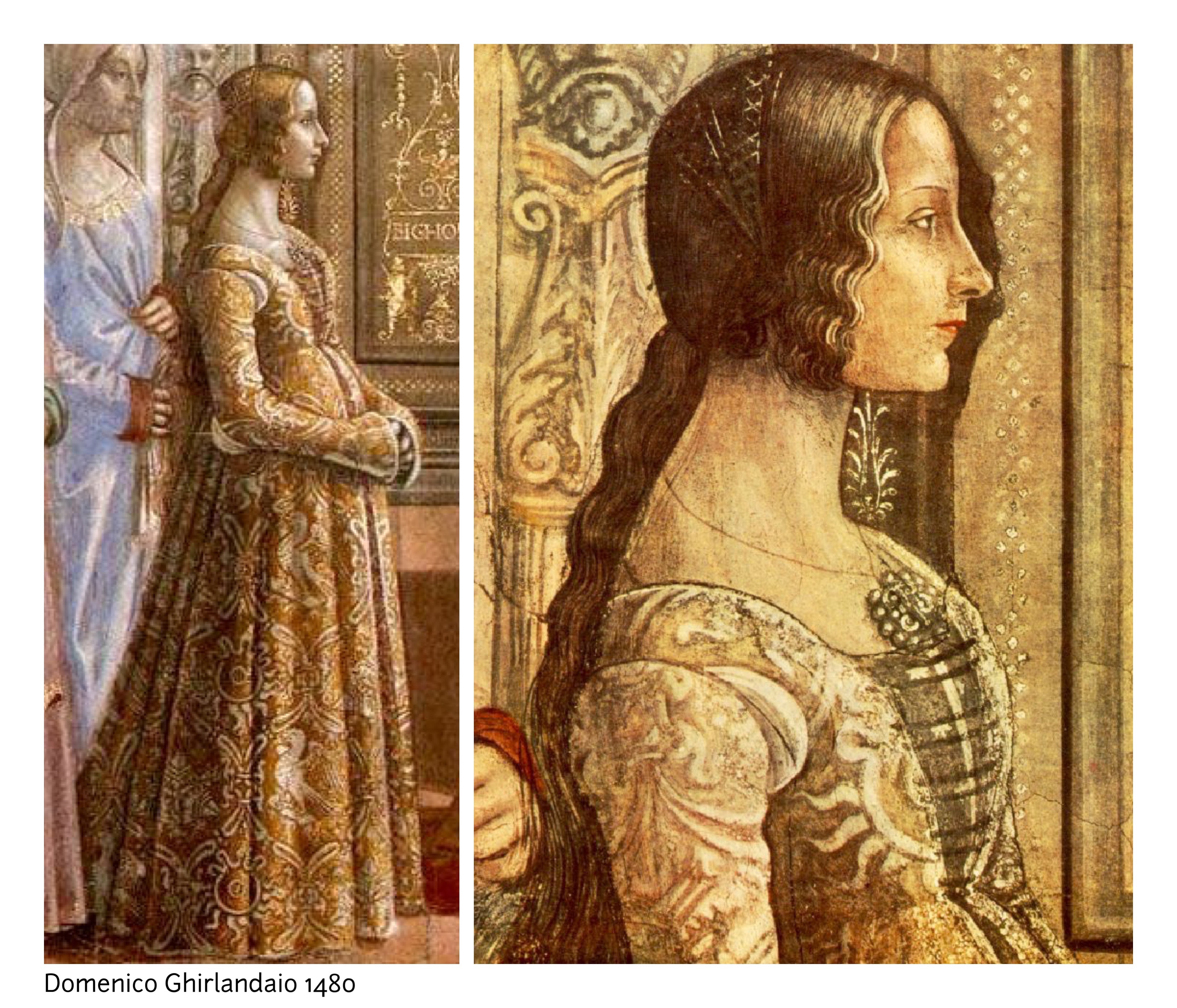 Insieme a questi veli tagliati e decorati in svariati modi, vi erano delle “bende” diffuse dal Trecento, ovvero strisce di tessuto generalmente bianche che venivano intrecciate ai capelli usate come nastri completate con reticelle o fili d’oro.