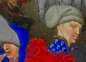 L’uomo a sinistra (n. 3) porta una pellanda verde dal collo alto borato in pelliccia e mostra un’ampia manica affrappata decorata con ricami e disegni floreali dorati; come copricapo indossa un capperone rosso frangiato a modi turbante indossato allo stesso modo dal suo contemporaneo Filippo III di Borgogna, ritratto in diversi dipinti con il copricapo a turbante. L’uomo completa l’eleganza con una collana composta da placche e ciondolo ovale dorati. Dietro di lui, si trova un uomo (n. 4) che indossa un “cappello a sacco” (diffuso tra la fine del 1200 e il 1500) in panno grigio ripiegato sull’orecchio destro. Lo scrittore Paul Durrieu, studioso francese in particolare delle opere dei fratelli Limbourg, ha ipotizzato che quella figura potesse essere un autoritratto proprio di Pol Limbourg, ipotesi che è resa peraltro più accettabile se si pensa che lo stesso ritratto compare in altri due Libri d’ore miniati dai Limbourg: Les petites Heures (Parigi, Bibliothèque nationale de France) e Les belles Heures (New York, Metropolitan Museum, Cloisters Museums). Quest’ipotesi potrebbe essere ulteriormente confermata identificando la donna a sinistra (n. 2), seminascosta dal cappello dell’uomo (n. 1) come la moglie di Pol, Gillette le Mercier. La donna indossa una pellanda rosa scuro e un capperone blu in testa, lasciando cadere il “liripipe” (punta del cappuccio) alla sua sinistra.