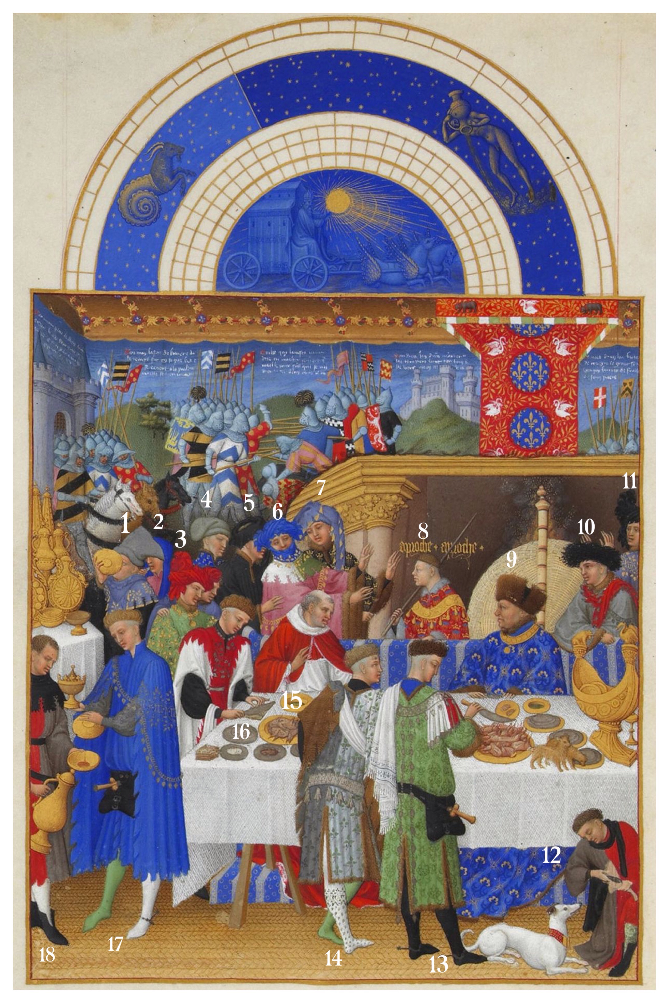Jean de Berry (n. 9) indossa una pellanda dai colori del proprio casato, dalle ampie maniche dal brillante colore blu impreziosito da damascature dorate e bordi in pelliccia. Completa l’eleganza con un copricapo in pelliccia e una collana composta da importanti placche in oro fissate su una base dorata. Altro tipo di copricapo in pelliccia nera è indossato dall’uomo a destra (n. 10) il quale lascia cadere sulle spalle un capperone (dal francese “chaperon”) affrappato rosso. Il Duca siede alla sua ricca mensa abbondantemente ed elegantemente fornita e allestita, sulla quale due piccoli cani vagano liberamente.