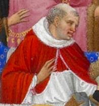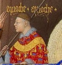 Alla sinistra del Duca, siede il vescovo di Chartres, (n. 15) lo si vede nel tipico abito religioso: veste bianca per la purezza dello spirito e mantellina rossa per il sangue versato da Cristo per gli uomini e per la regalità dello Spirito. Lo stesso abbigliamento infatti si ritrova in Papa Gregorio XII in carica fino al 1415 e nel successore Papa Martino V dal 1417. Nei suoi scritti si legge dell’amicizia che lo legava al duca.