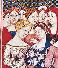 In secondo piano, osservando la scena le donne, la caratteristica in vista è la differenza tra le acconciature, generalmente nel XIV secolo erano raccolti in retine, oltre che a ostentare ricchezza nelle loro decorazioni, come perle, queste servivano anche per motivi igienici, ma con l’arrivo del XV secolo le decorazioni non erano solo pregio per gli abiti, ma anche per il capo.