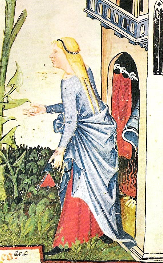 Tacuinum SanitatisI tagli nell’abito sia maschile, sia femminile, all’altezza del bacino che si osservano nei dipinti del XIV secolo, avevano il solo scopo decorativo, erano infatti solo “tagli” o avevano la funzione di “scaldamani” in quanto, oltre ad essere orlati con ricami, si presentavano anche con orli in pelliccia; solo nel tardo Cinquecento la tasca, più o meno nascosta, entra a far parte dell’abito maschile.