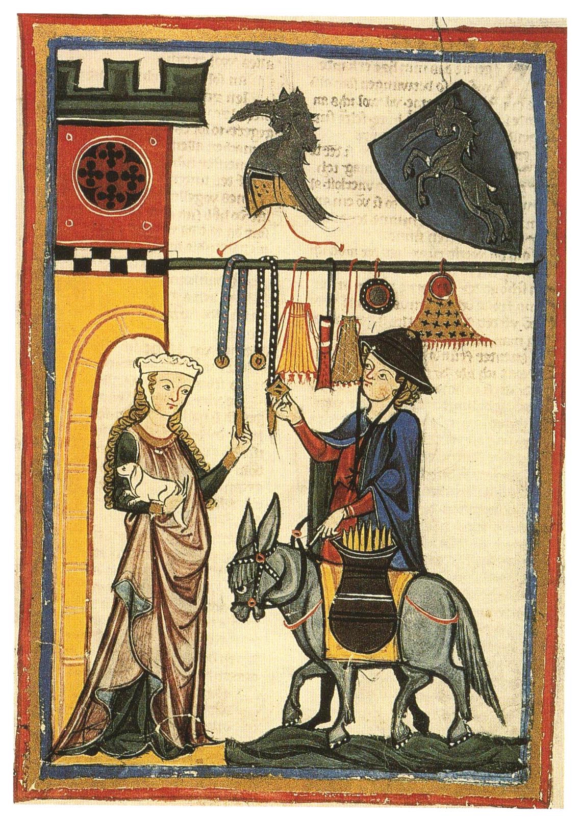 Miniatura dal «Codex Manesse», 1305-1340, Heidelberg, UniversitätsbibliothekL’introduzione del lavoro a maglia fece sì che si producessero tasche “laborate ad acum”, alle quali, per indicare il casato di appartenenza, vi si poteva applicare lo stemma: particolare riportato nell’Inferno di Dante Alighieri, quando descrisse gli usurai che camminavano sotto una pioggia di fuoco con le borse attaccate al collo. Vi era anche l’usanza, da parte dell’uomo, di regalare una borsa alla donna, pertanto si trovavano borse con ricamate immagini del proprio amato.