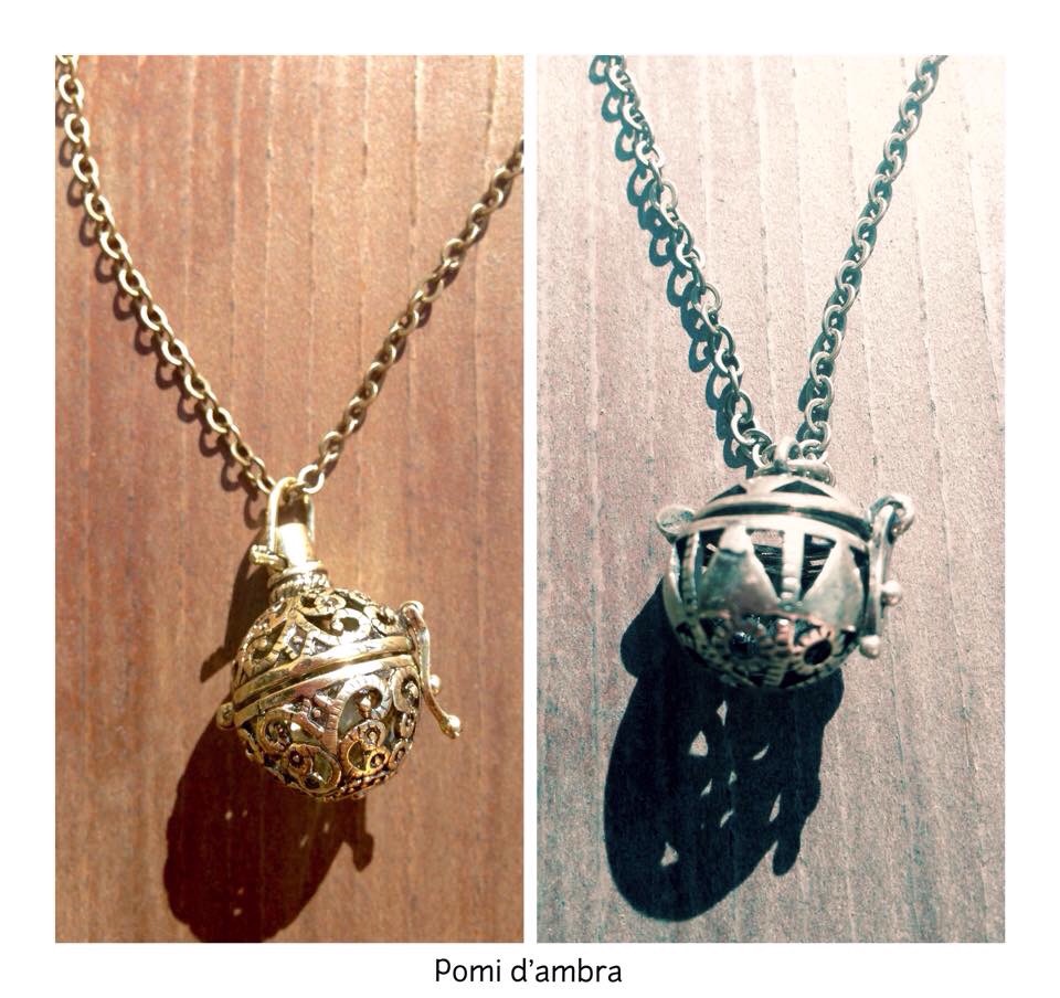 Nel Basso Medioevo il profumo si trovava in contenitori di metallo prezioso, prodotti da orafi specializzati, a forma di globo traforato per consentire al profumo delle erbe contenute di esalare al meglio; quest’oggetto era conosciuto con il termine di “Pomo d’Ambra” in quanto inizialmente era una sfera di ambra grigia e poi impreziosito da altre essenze come muschio, zibetto, lavanda, rosa, mughetto….