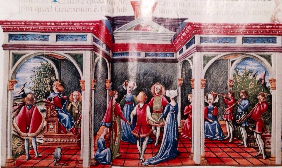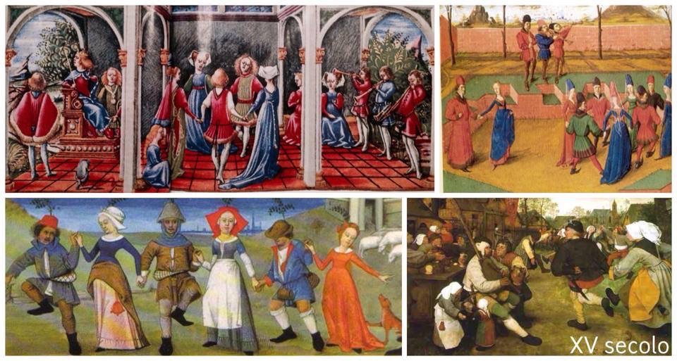 Nel Quattrocento in palazzi, castelli e residenze nobiliari si trovavano raffigurazioni riguardanti feste e danze a corte; questi ricevimenti erano molto diffusi tra le famiglie ricche ed erano anche un mezzo per mostrare il proprio lusso.