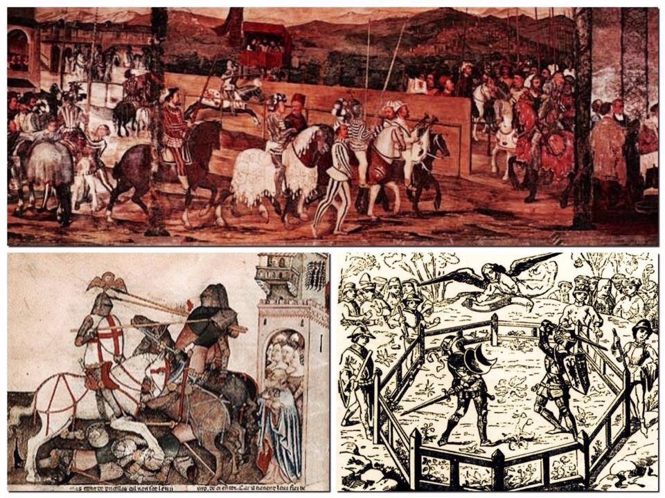 Durante i festeggiamenti organizzati a corte, si poteva assistere ad un momento di autoesaltazione e di affermazione di ideali e valori ormai in declino nel resto della società con un torneo “a tema”. Via via che la cavalleria perdeva d’importanza, negli ultimi anni del Trecento nacque il “torneo a tema”, nel quale i partecipanti scendevano in lizza, delimitata da paletti in legno, travestiti da personaggi dell’epica cavalleresca, in una cornice di ispirazione volutamente letteraria e fiabesca, dando vita ad un “combattimento a due”: il pas d’armes o “passo díarmi”. Diffuso in Italia nel Quattrocento il passo d’arme consisteva in una sfida lanciata da uno o più cavalieri, che s’impegnavano a “difendere” una località, ovvero “passo”, contro chiunque volesse misurarsi con loro.