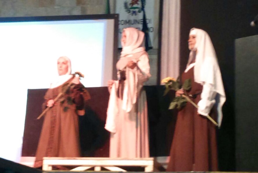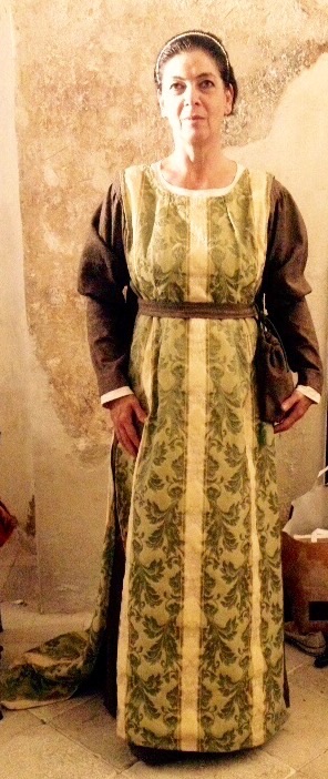 Abito della seconda metà del XIV secolo composto da una camicia in lino, una veste in lana detta “gonnella” e una sopravveste con delle aperture laterali molto ampie conosciute come “finestre del diavolo” in quanto per la Chiesa erano fonte di peccato, sia per le donne che manifestavano un senso di libertà, sia per gli uomini a cui provocavano pensieri viziosi. L’abito ripropone le caratteristiche stilistiche del ritratto di Maria d’Enghien contessa di Lecce dal 1384. Sul capo una coroncina di fiori e i capelli sono raccolti in una treccia; in vita una cintura e una borsa in damascato detta “tasca”.
