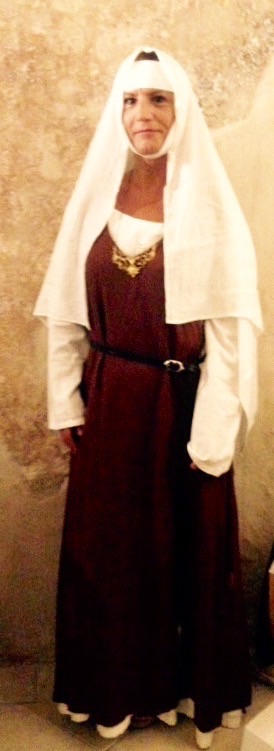 Abito del XIII secolo composto da una camicia in lino a maniche lunghe estesa alle caviglie, al di sopra una tunica che riprende le caratteristiche della surcotte maschile cioè una veste militare che si portava sopra la cotta di maglia. La versione femminile presenta un’apertura dall’ascella al fianco provvista di lacci per stringere il tessuto al corpo e fermato in vita da una cinturina in pelle la cui lunghezza ricade sulla coscia. L’abito ripropone gli aspetti stilistici suggeriti nelle miniature del Codice Manesse, un famoso canzoniere del 1300. Sul capo è indossato il soggolo: un velo fermato da una fascia e da un sottogola in lino.
