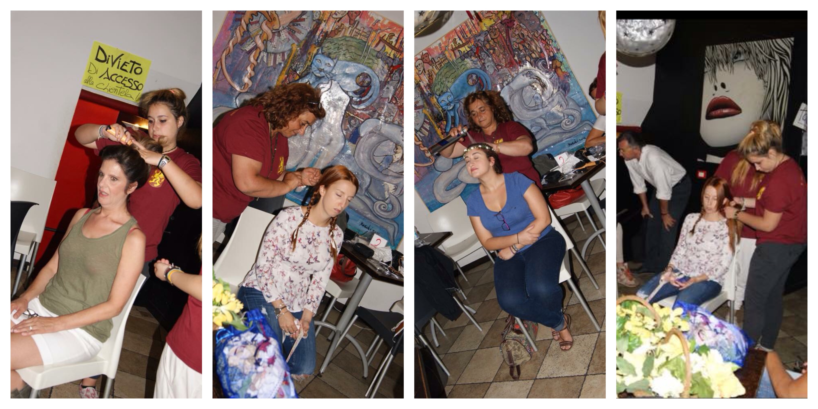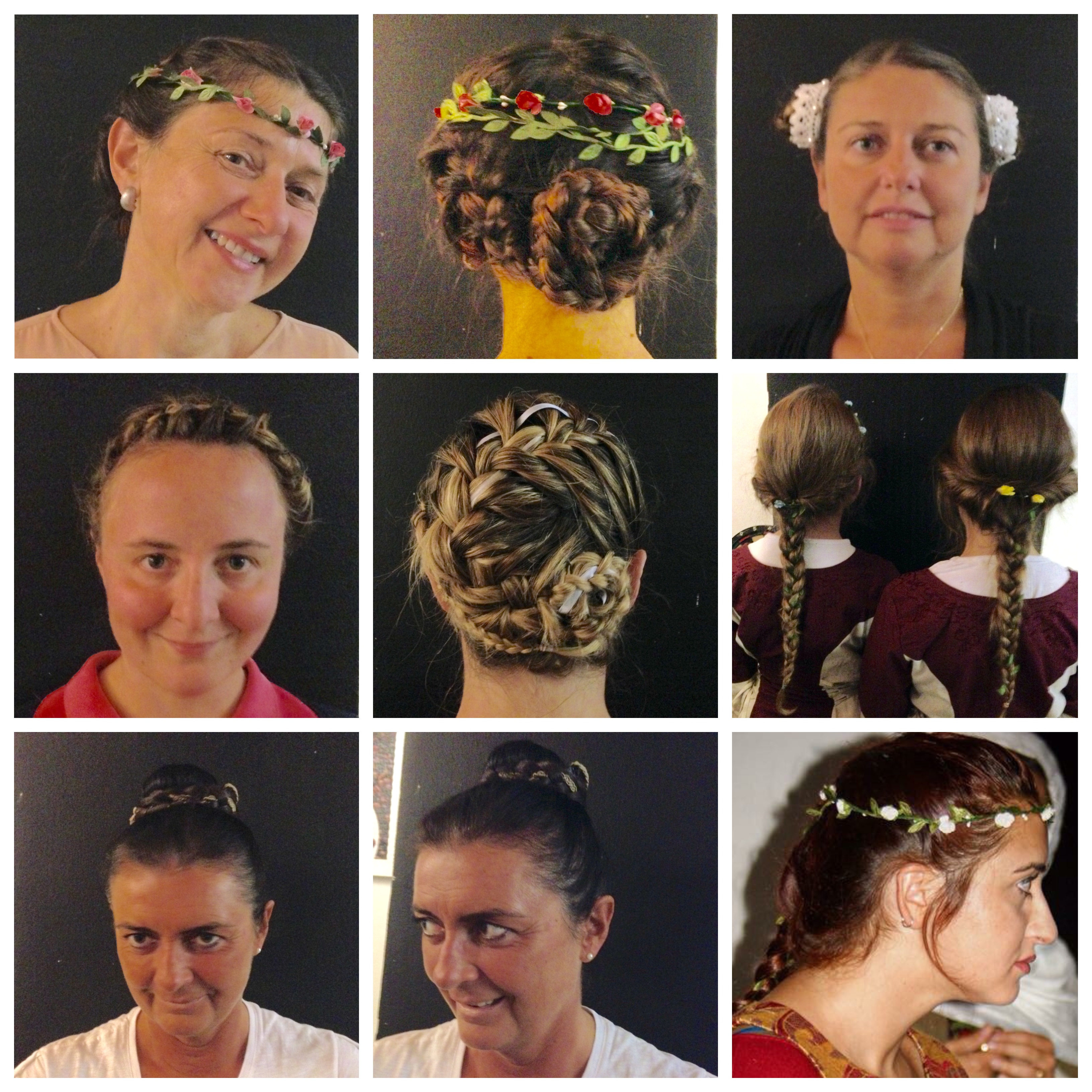 Le acconciature storiche, da semplici trecce a chignon sempre più elaborati e ricchi, sono state realizzate dalla parrucchiera Alessandra Cavallo di Pavia.