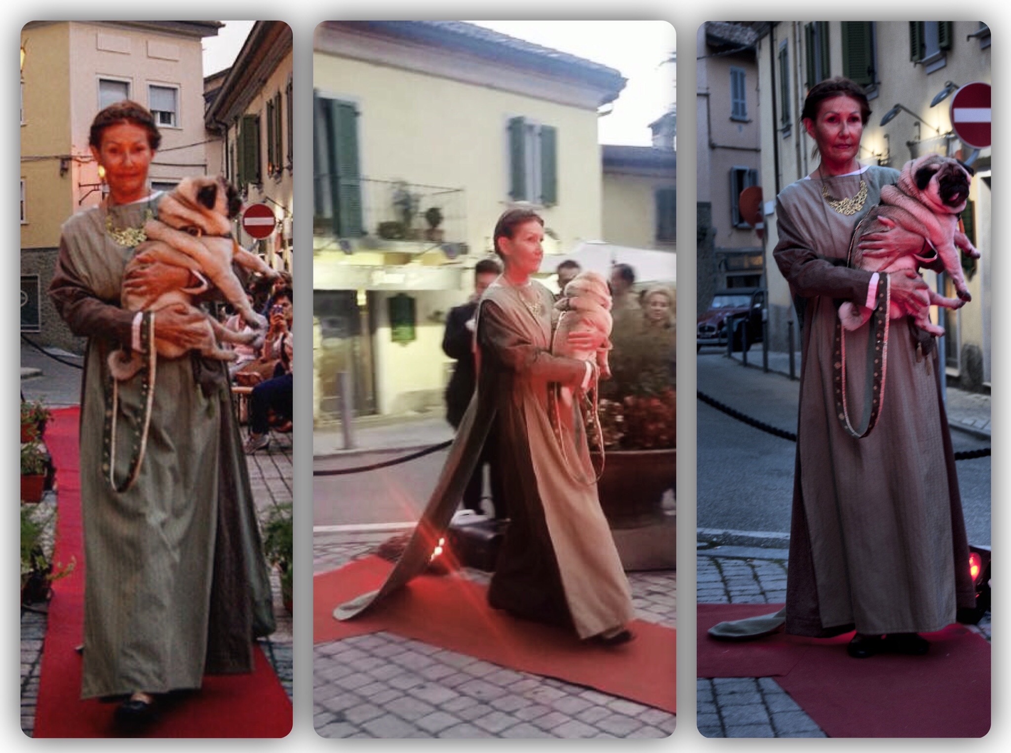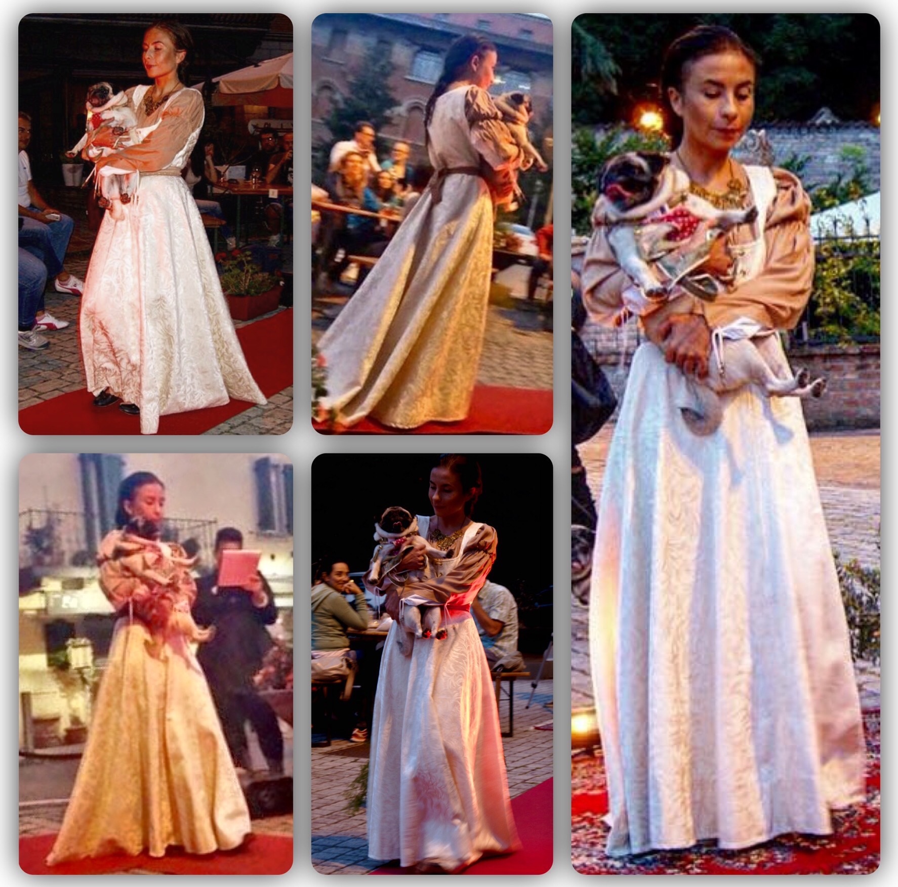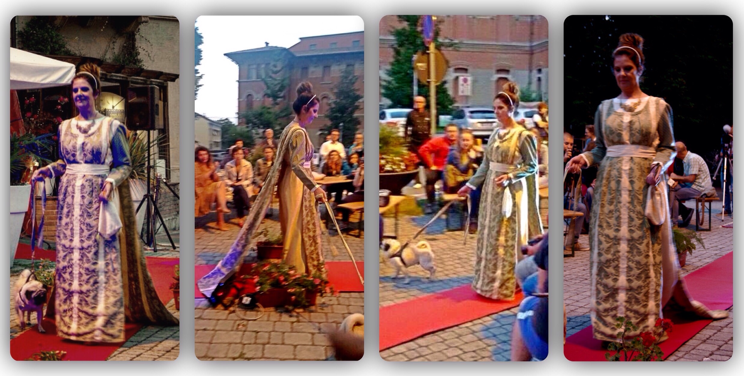 Vestioevo di Michela Renzi, in occasione della decima edizione di Rivivi il Medioevo a Castell’Arquato, ha presentato “La dama col carlino”, pubblicizzata dall’Ufficio Turistico di Castello e promossa dal Sindaco Ivano Rocchetta. Si trattava di un’allegoria del famoso dipinto di Leonardo da Vinci “La dama con l’ermellino” attraverso una suggestiva sfilata di moda medievale con abiti realizzati personalmente, lungo una linea del tempo “vivente” in collaborazione con Pimp My Pug, di Simona Trecordi per gli amanti dei carlini. Il tutto si è svolto venerdì sera 11 settembre, come apertura al weekend medievale, presso il Lolly’s che per l’occasione è stato addobbato con nastri, candele, decorazioni floreali, giochi di luci e fumo e non poteva mancare il tappeto rosso lungo il quale hanno sfilato le modelle accompagnate da simpatici cani carlini e da un sottofondo musicale a tema.