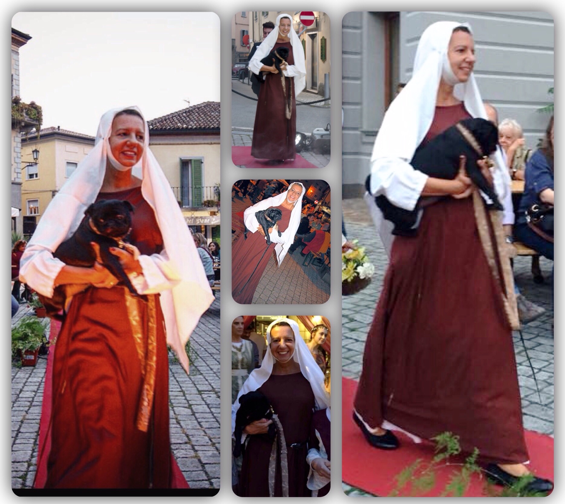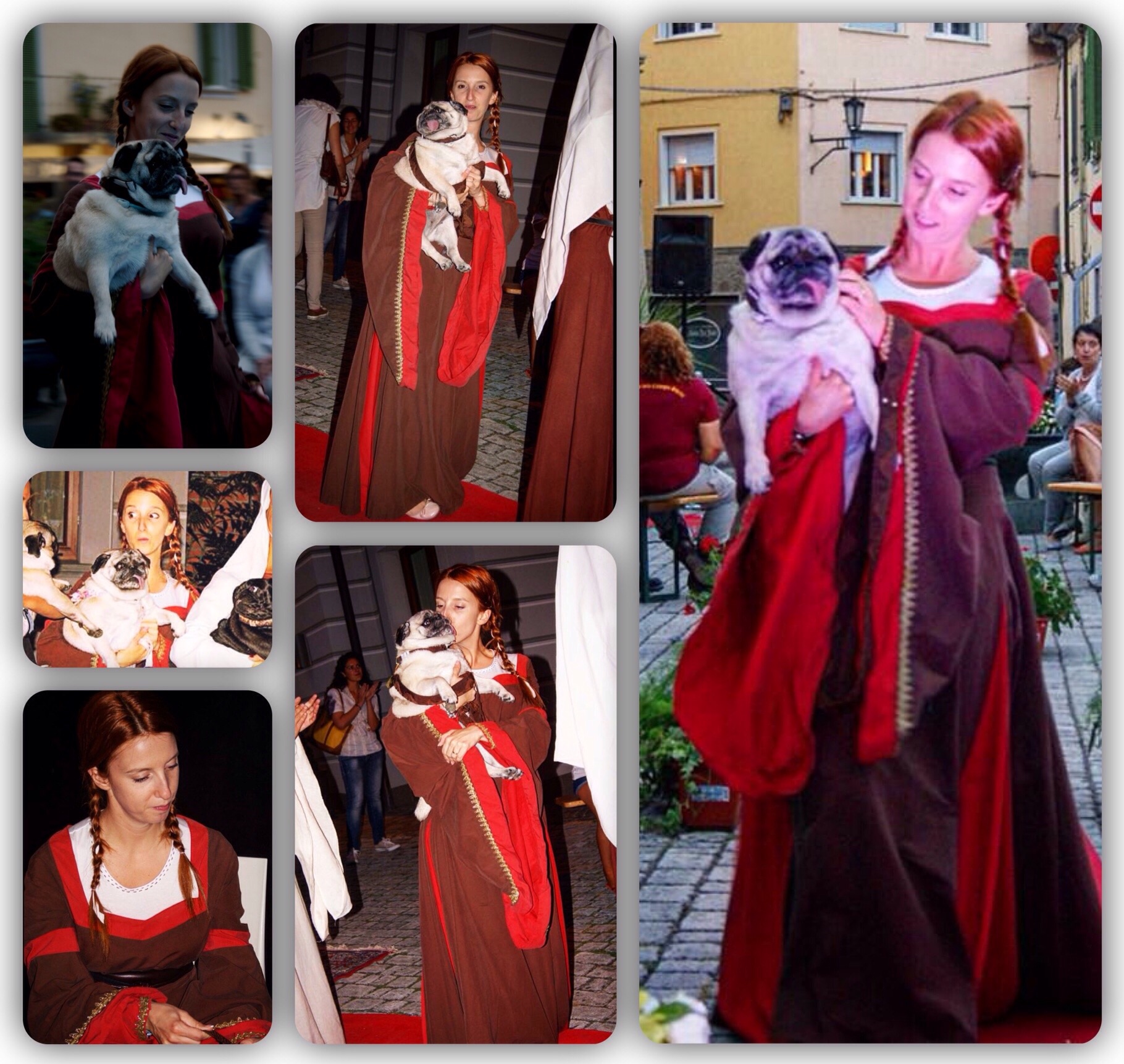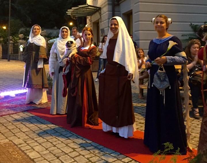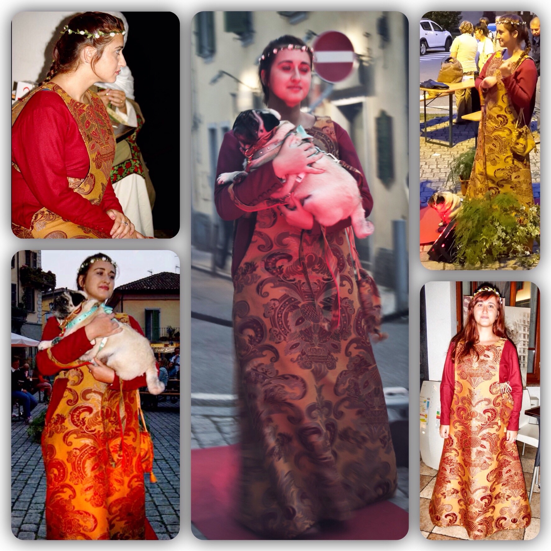 Vestioevo di Michela Renzi, in occasione della decima edizione di Rivivi il Medioevo a Castell’Arquato, ha presentato “La dama col carlino”, pubblicizzata dall’Ufficio Turistico di Castello e promossa dal Sindaco Ivano Rocchetta. Si trattava di un’allegoria del famoso dipinto di Leonardo da Vinci “La dama con l’ermellino” attraverso una suggestiva sfilata di moda medievale con abiti realizzati personalmente, lungo una linea del tempo “vivente” in collaborazione con Pimp My Pug, di Simona Trecordi per gli amanti dei carlini. Il tutto si è svolto venerdì sera 11 settembre, come apertura al weekend medievale, presso il Lolly’s che per l’occasione è stato addobbato con nastri, candele, decorazioni floreali, giochi di luci e fumo e non poteva mancare il tappeto rosso lungo il quale hanno sfilato le modelle accompagnate da simpatici cani carlini e da un sottofondo musicale a tema.