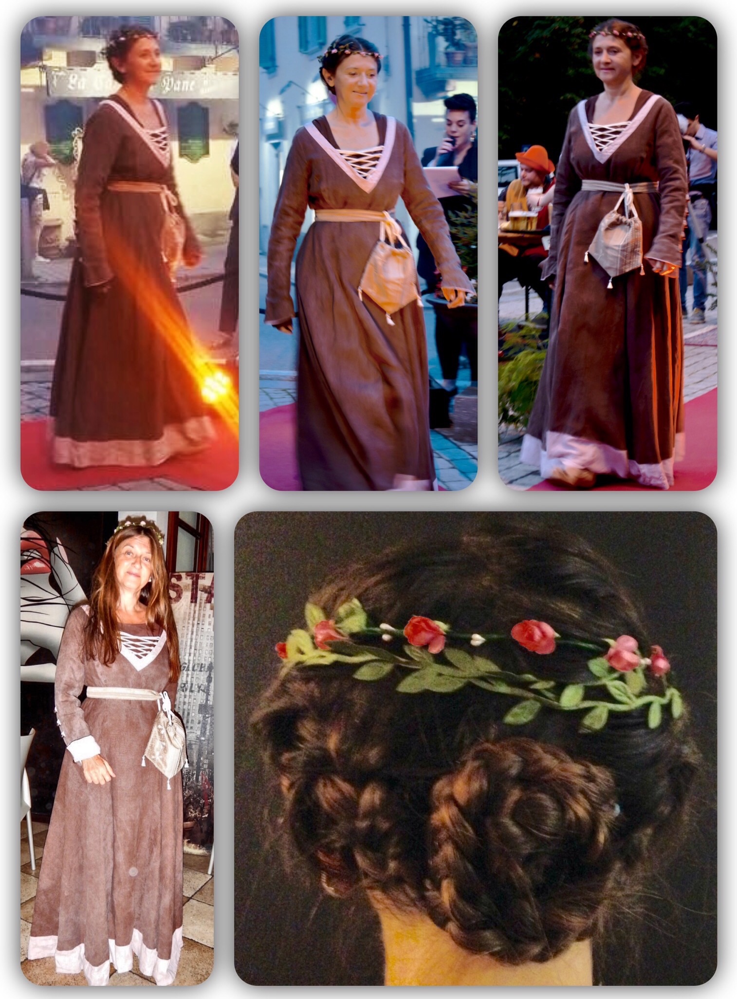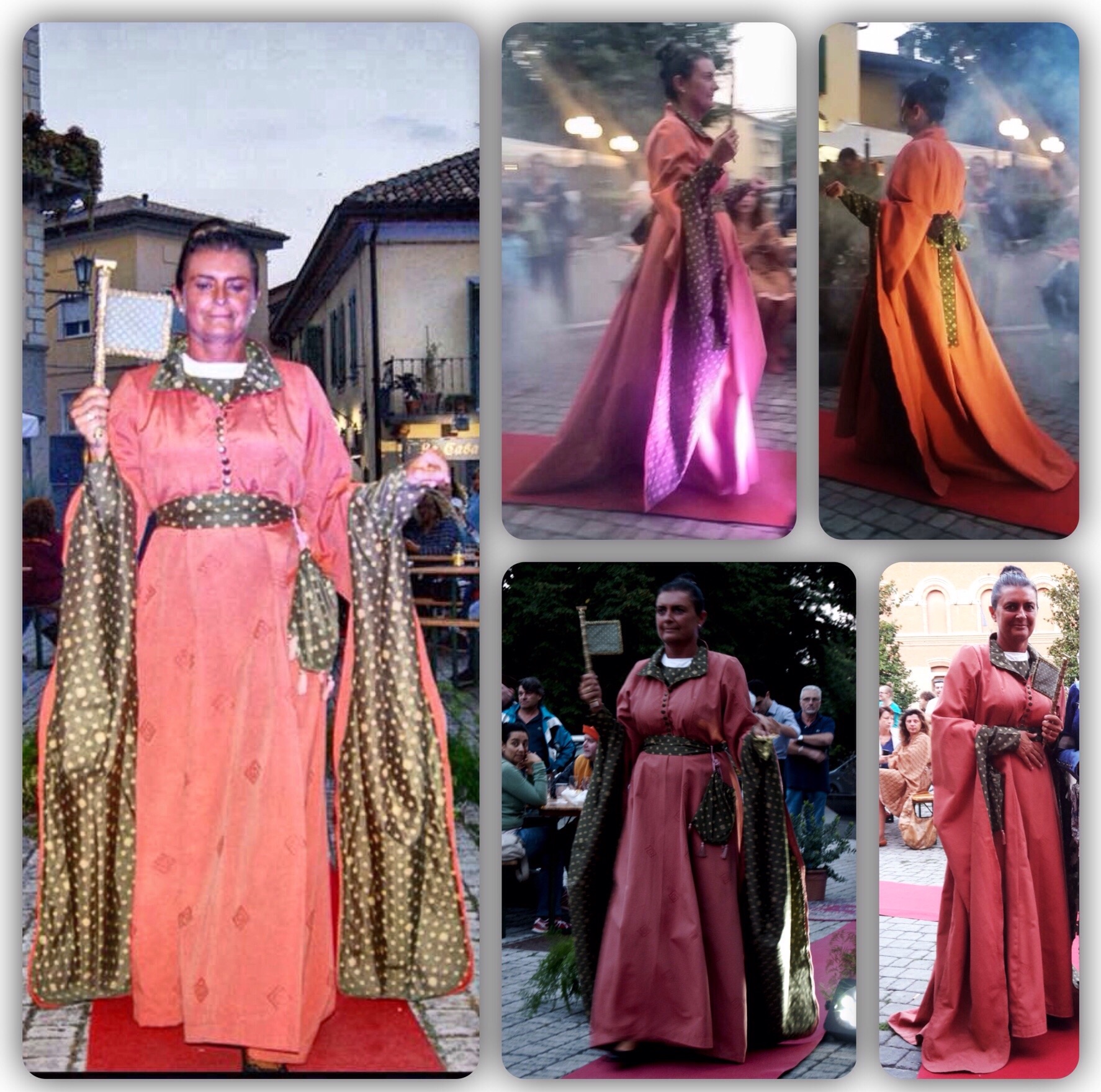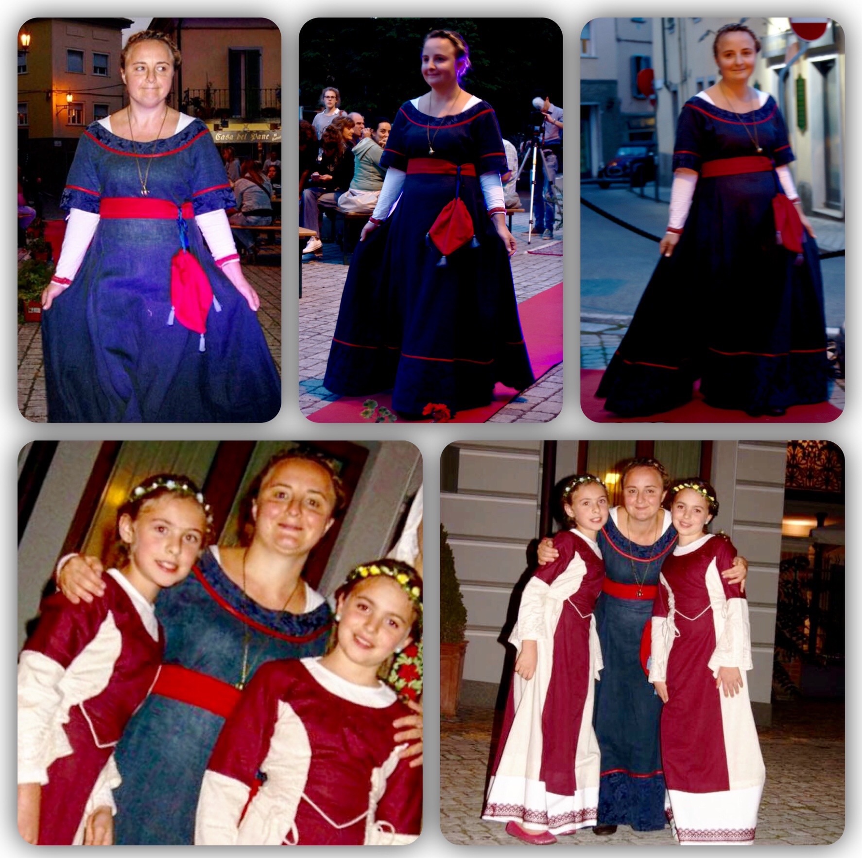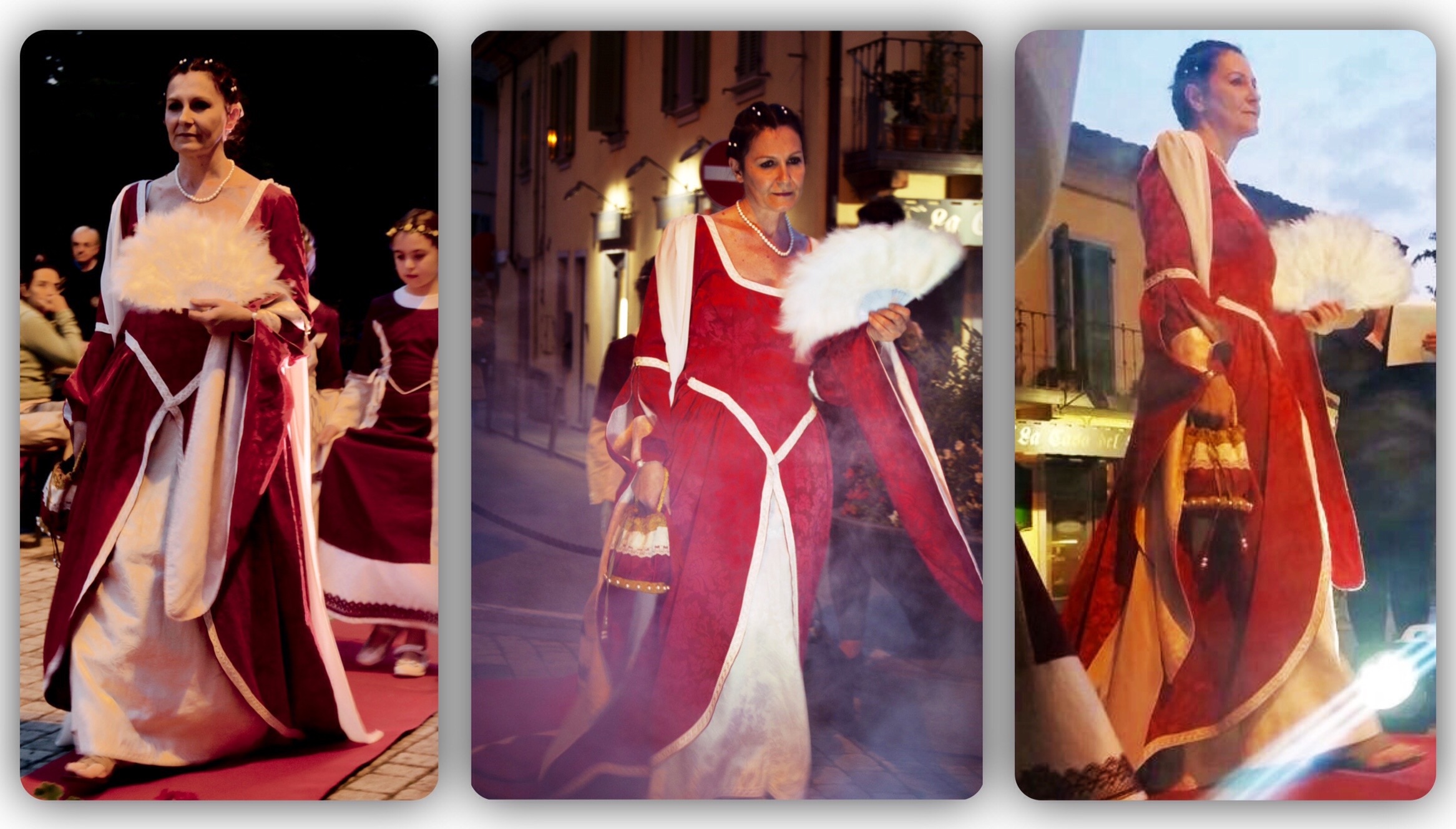 Gli abiti sono stati proposti lungo una linea del tempo dal 1000 al 1500 attraverso vesti ispirate a miniature, affreschi, ritratti e varie fonti; dalle tuniche indossate sopra ad una lunga camicia, accessoriate di velo per la testa dell’anno Mille, passando per rappresentativi “bliaut” con ampie maniche fino alle strette “cottardite” abbottonate frontalmente della seconda metà del Trecento per arrivare ad ampie sopravvesti come “pellande” e quattrocentesche “giornee” damascate arricchite da copricapi come inizialmente il velo o il “soggolo” per poi passare a nastri e acconciature decorati insieme ad accessori del periodo come borse, gioielli e il ventaglio a banderuola; abiti, accessori e curiosità del periodo, attraverso fonti storiche, ad esempio le aperture laterali nella sopravveste trecentesca conosciute come “finestre del diavolo” o termini di uso comune come “un altro paio di maniche” per l’abito quattrocentesco, sono stati presentati dalla stupenda voce di Elisa Brugnoni.
