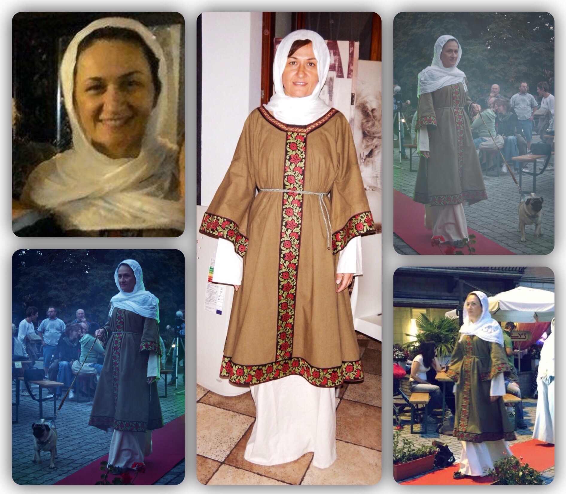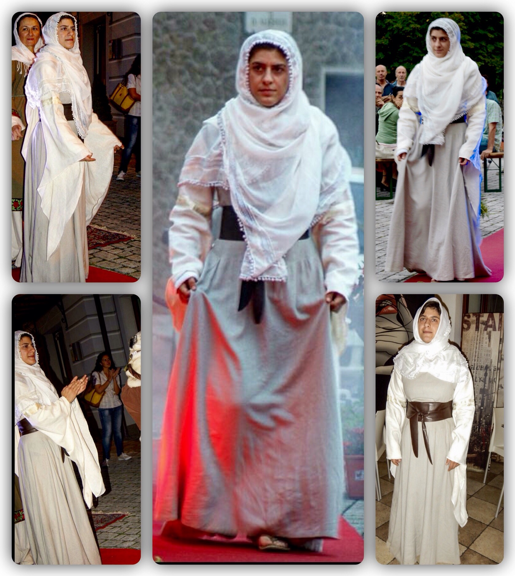 Apre la sfilata la dama con indosso un abito dell’XI secolo, composto da una lunga camicia in lino con maniche tubolari e da una tunica più corta e svasata con ampie maniche e bordi decorati con ricami floreali; lo scollo mantiene una linea geometrica, sempre orlato. L’abito è stretto in vita da cordoncino di stoffa con doppio giro è fissato con un semplice nodo. Tipici dell’epoca il decoro frontale e il velo che copre tutto il capo e il collo.