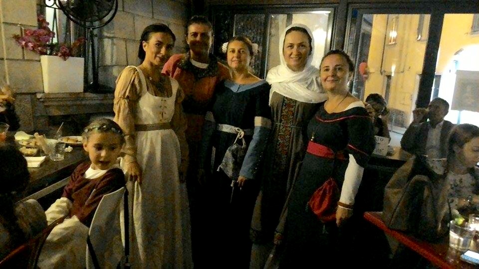Si passa ad un’elegante dama con indosso un abito della seconda metà del XIV secolo composto da una camicia in lino, una veste in lana detta “gonnella” chiusa da bottoni rivestiti della stessa lana e una sopravveste con delle aperture laterali molto ampie conosciute come “finestre del diavolo” perché per gli uomini di chiesa erano fonte di peccato: per le donne erano sinonimo di libertà, negli uomini provocavano pensieri viziosi in quanto lasciavano intravedere le forme del corpo. Sul capo una coroncina di fiori come decorazione ad una semplice treccia.