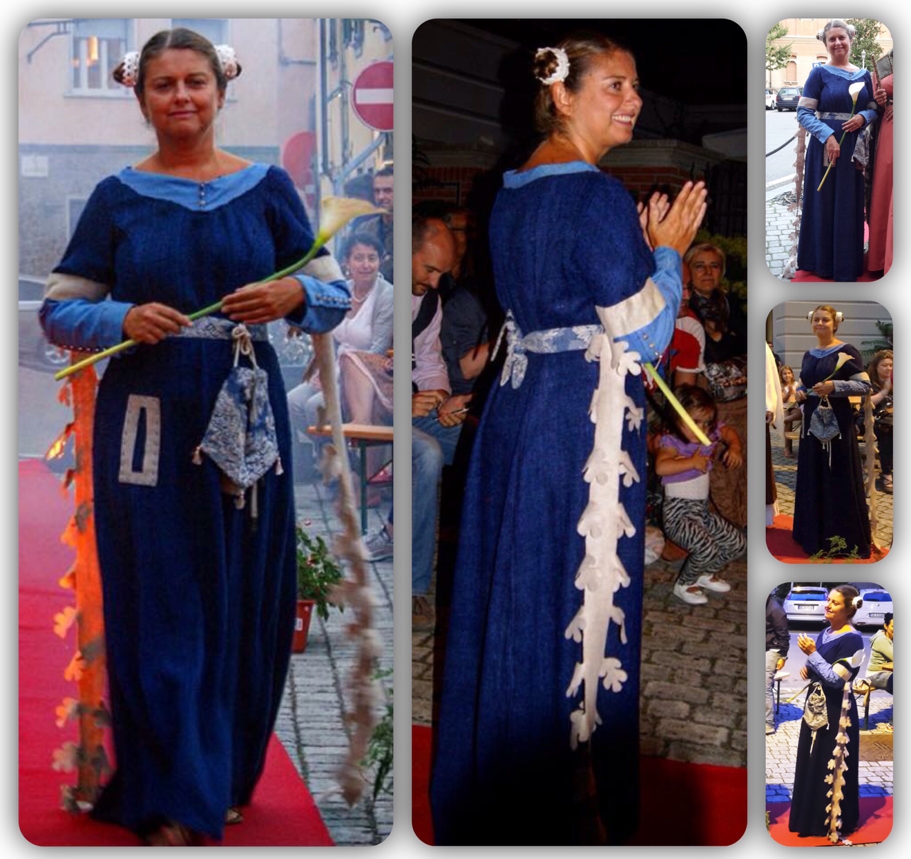 La modella indossa un abito della seconda metà del XV secolo. Al di sopra della camicia porta una in lino blu dagli orli damascati. Quest’abito segnò l’inizio diuna moda “comoda”: la manica corta. Al collo porta il “pomo d’ambra”, un ciondolo in bronzo portaprofumo, un vero e proprio amuleto per il benessere finisco e mentale oltre che un deodorante usato sia da uomini sia da donne.