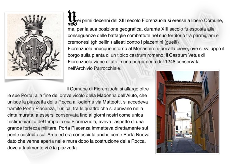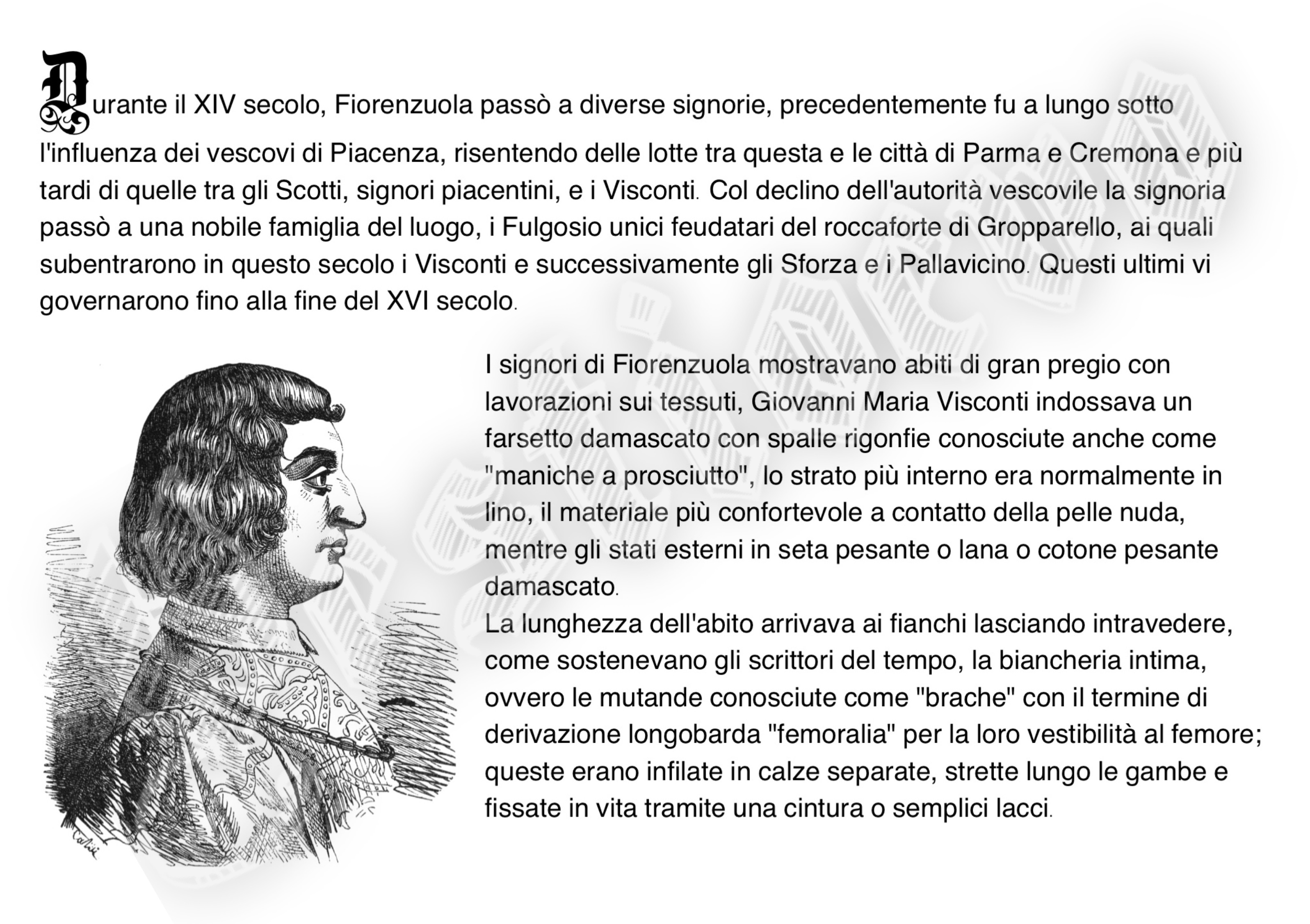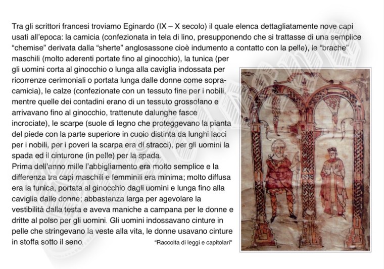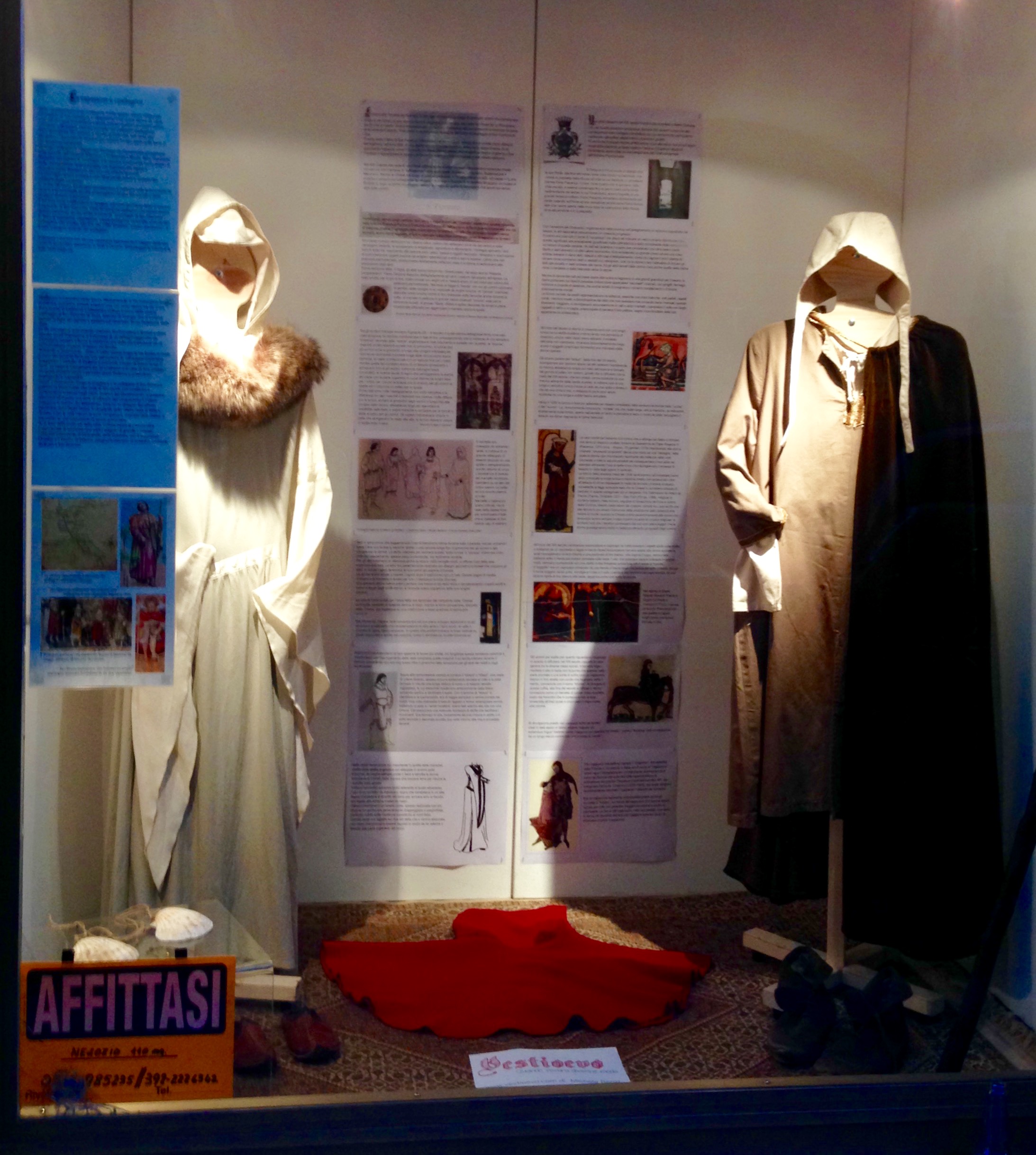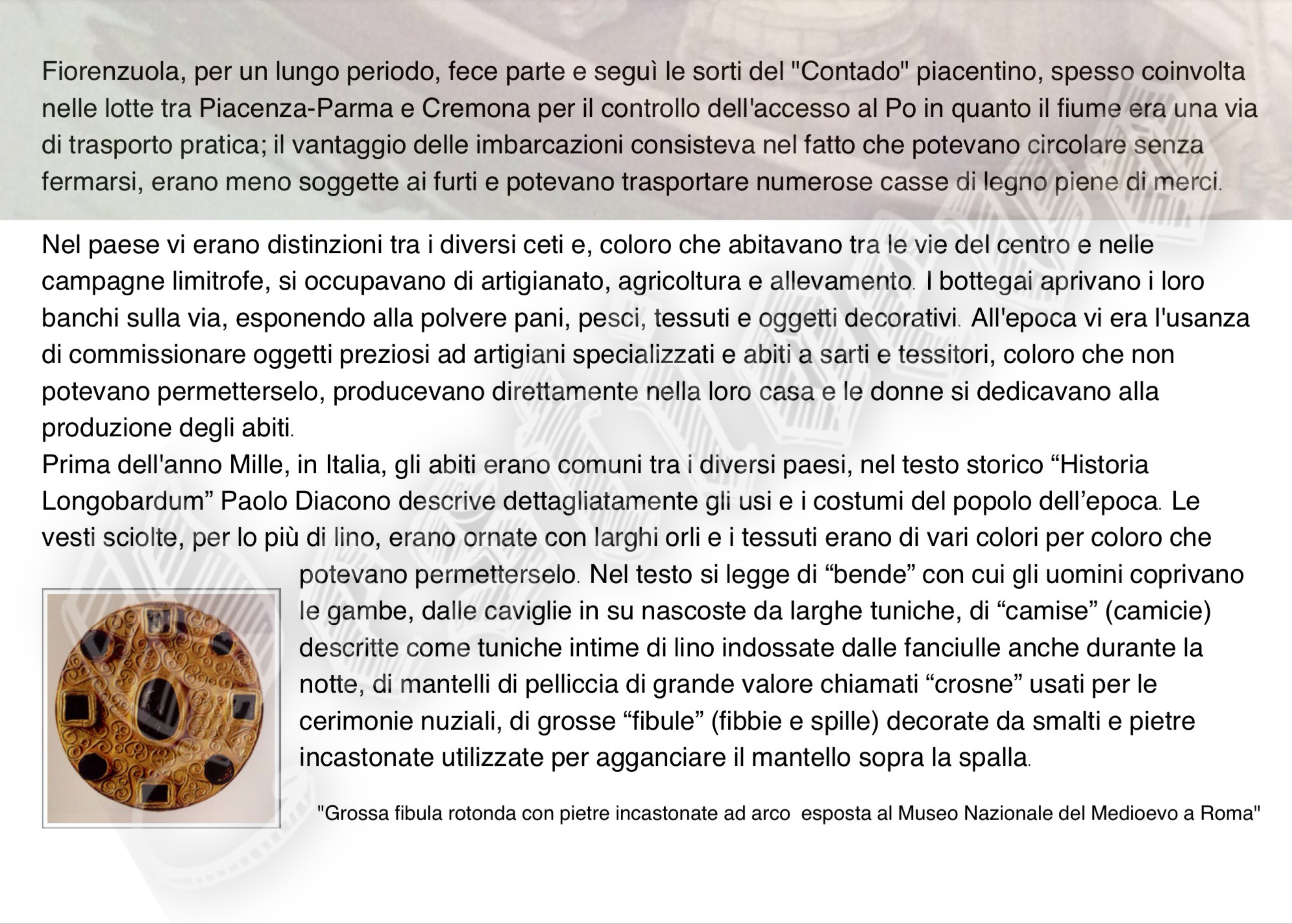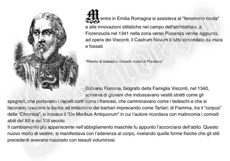 La storia di Fiorenzuola esposta attraverso i cambiamenti e le innovazioni stilistiche medievali, dalle tuniche, bliaut, alle giornee, pellande e farsetti; dalla Via Francigena al Rinascimento con oggetti, abiti, informazioni e curiosità.