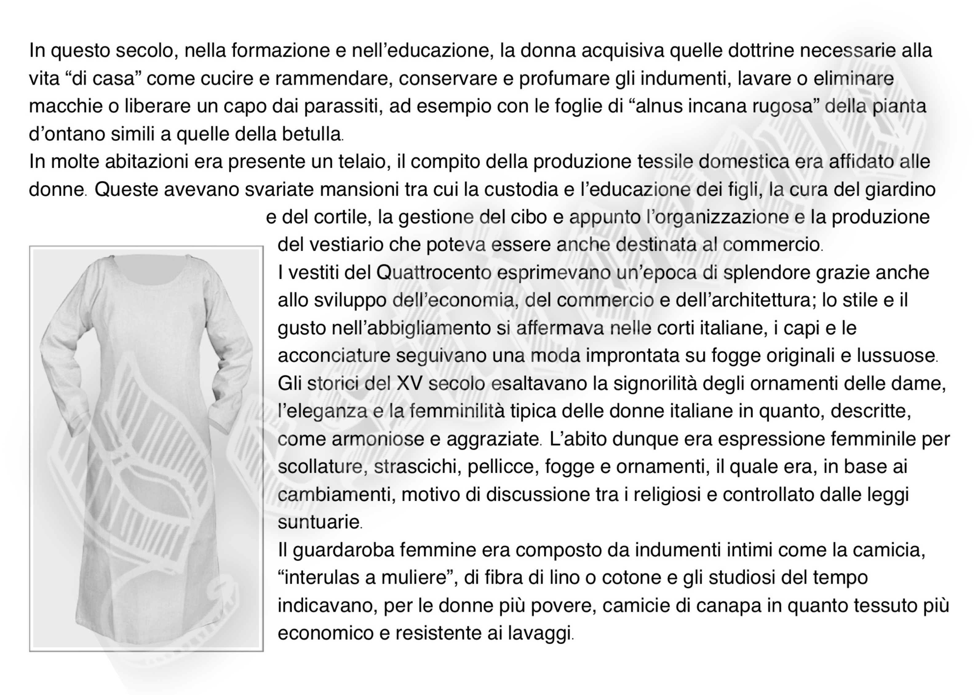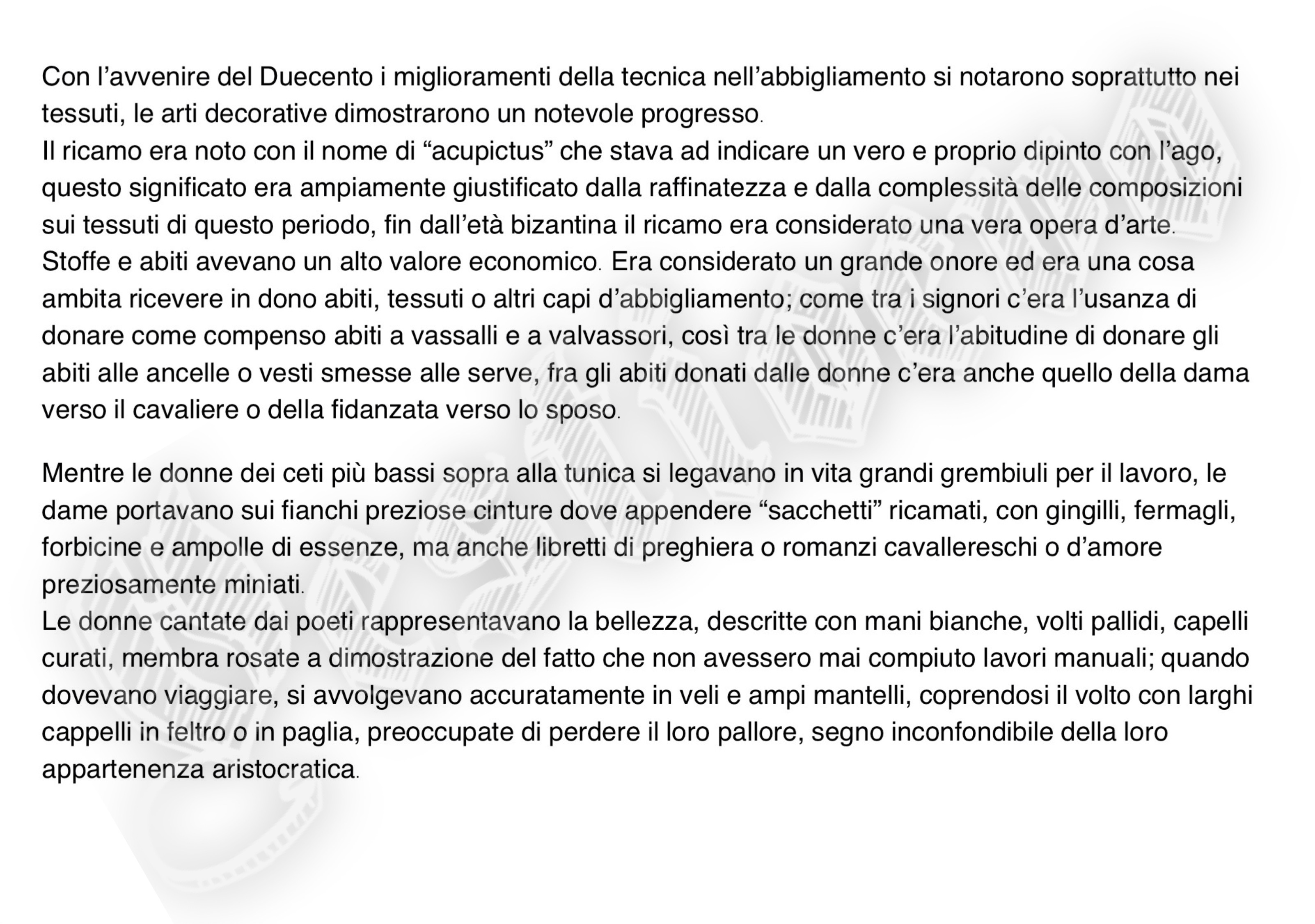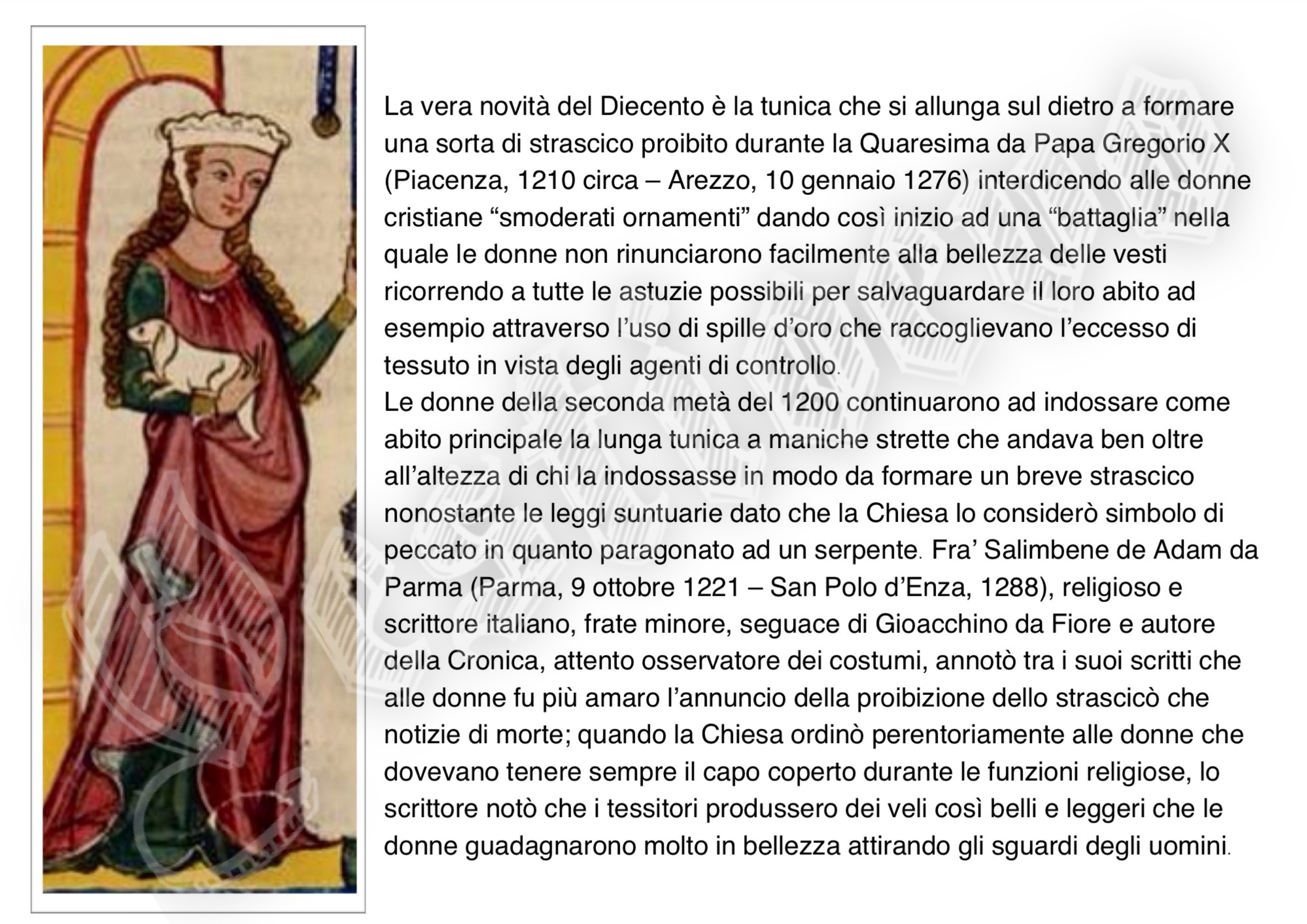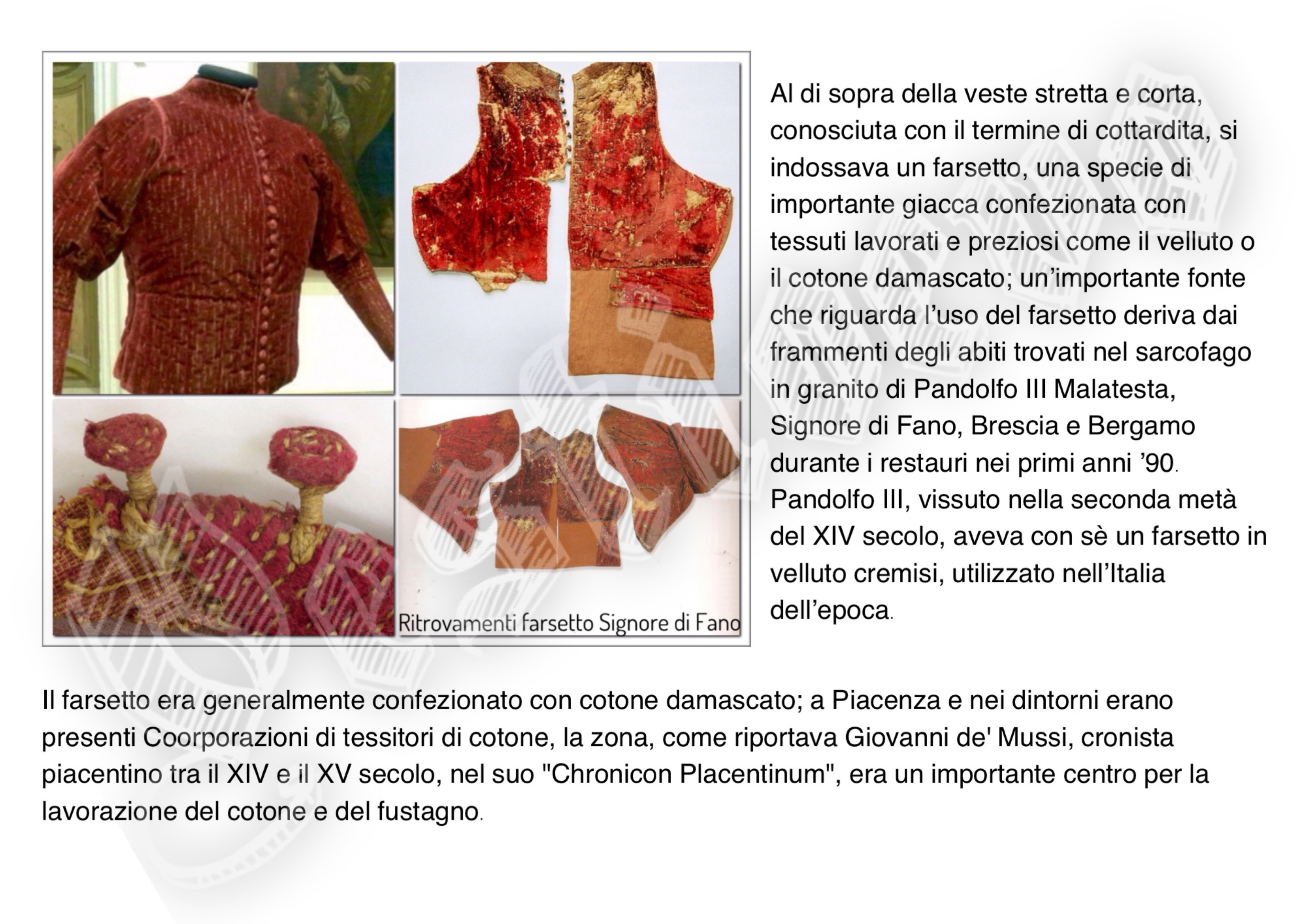 La storia di Fiorenzuola esposta attraverso i cambiamenti e le innovazioni stilistiche medievali, dalle tuniche, bliaut, alle giornee, pellande e farsetti; dalla Via Francigena al Rinascimento con oggetti, abiti, informazioni e curiosità.