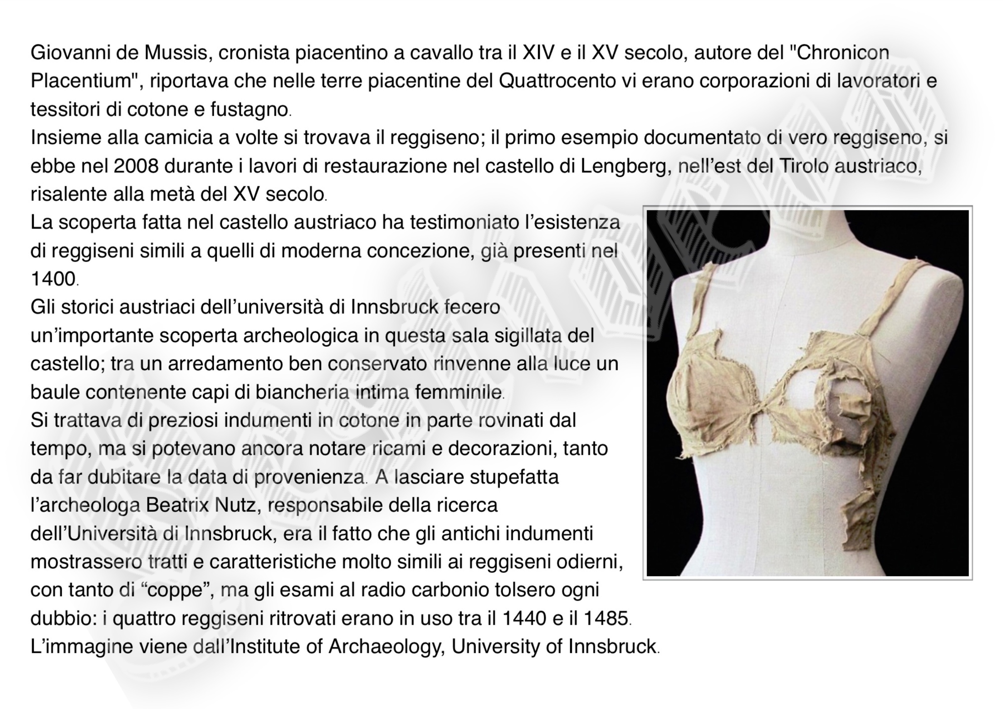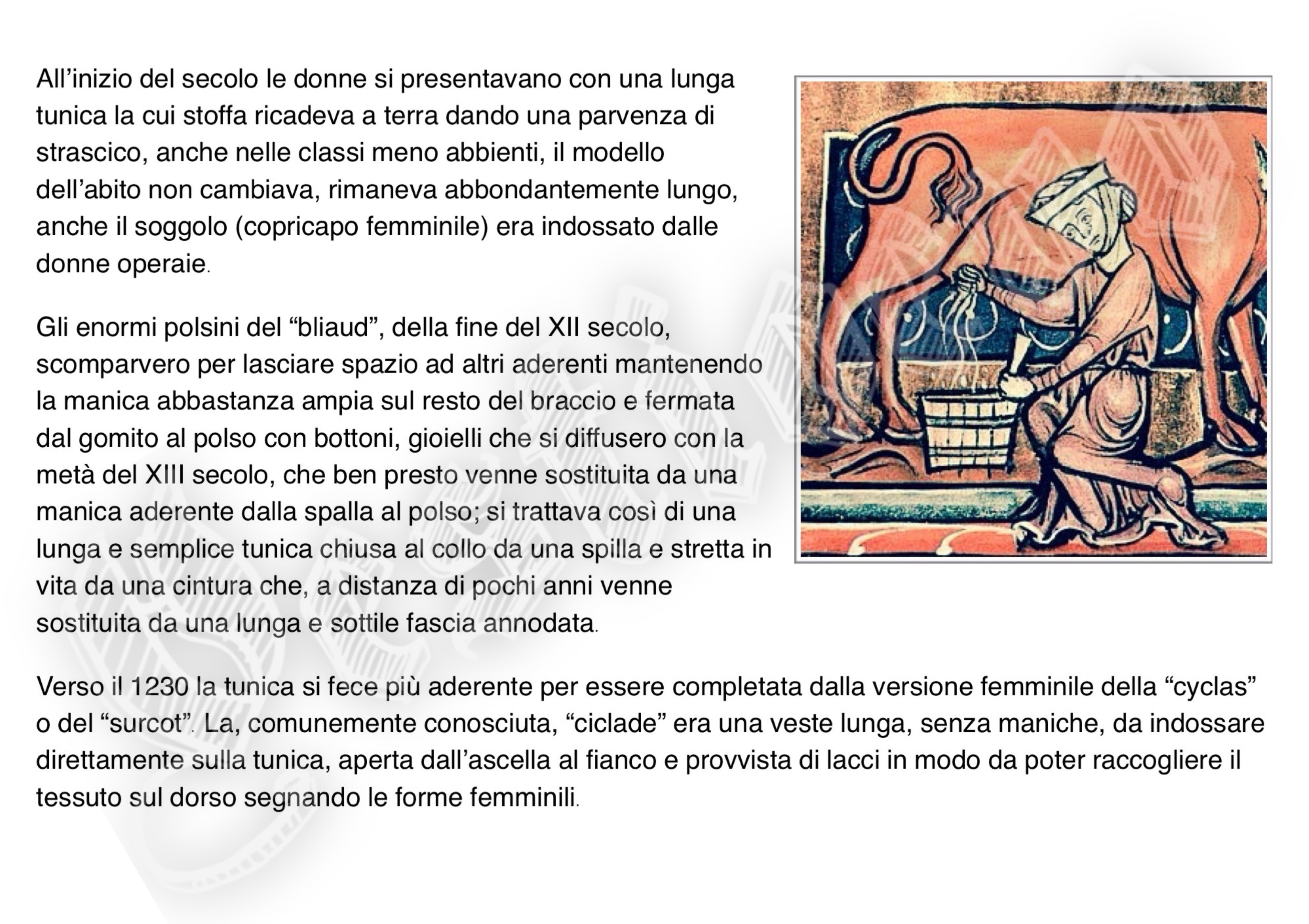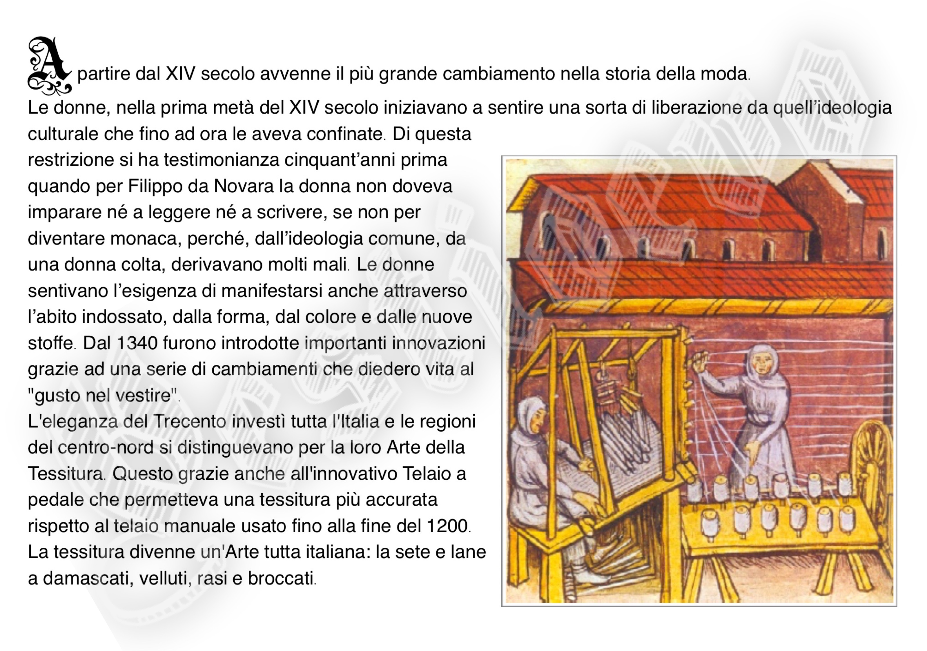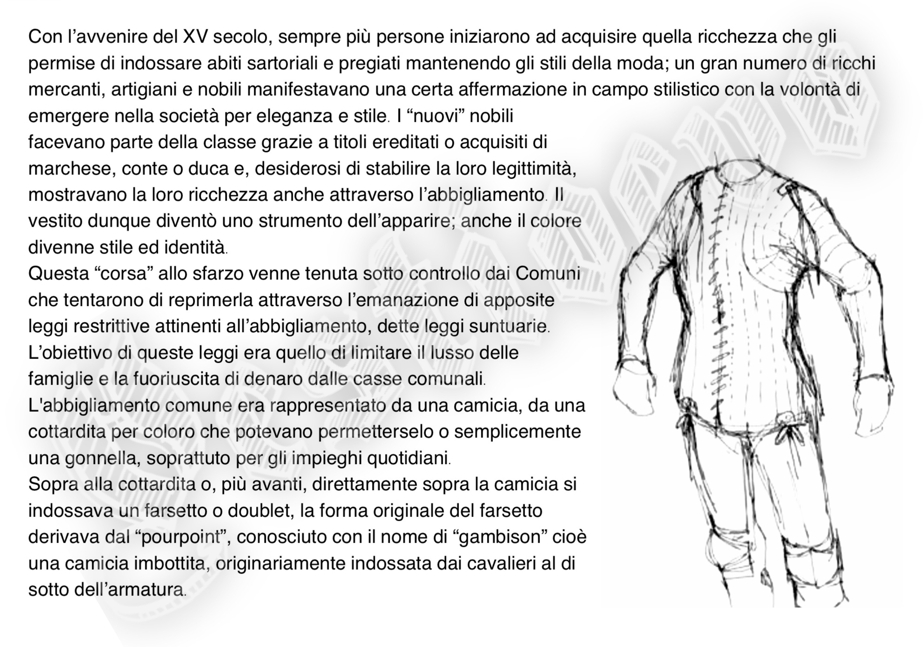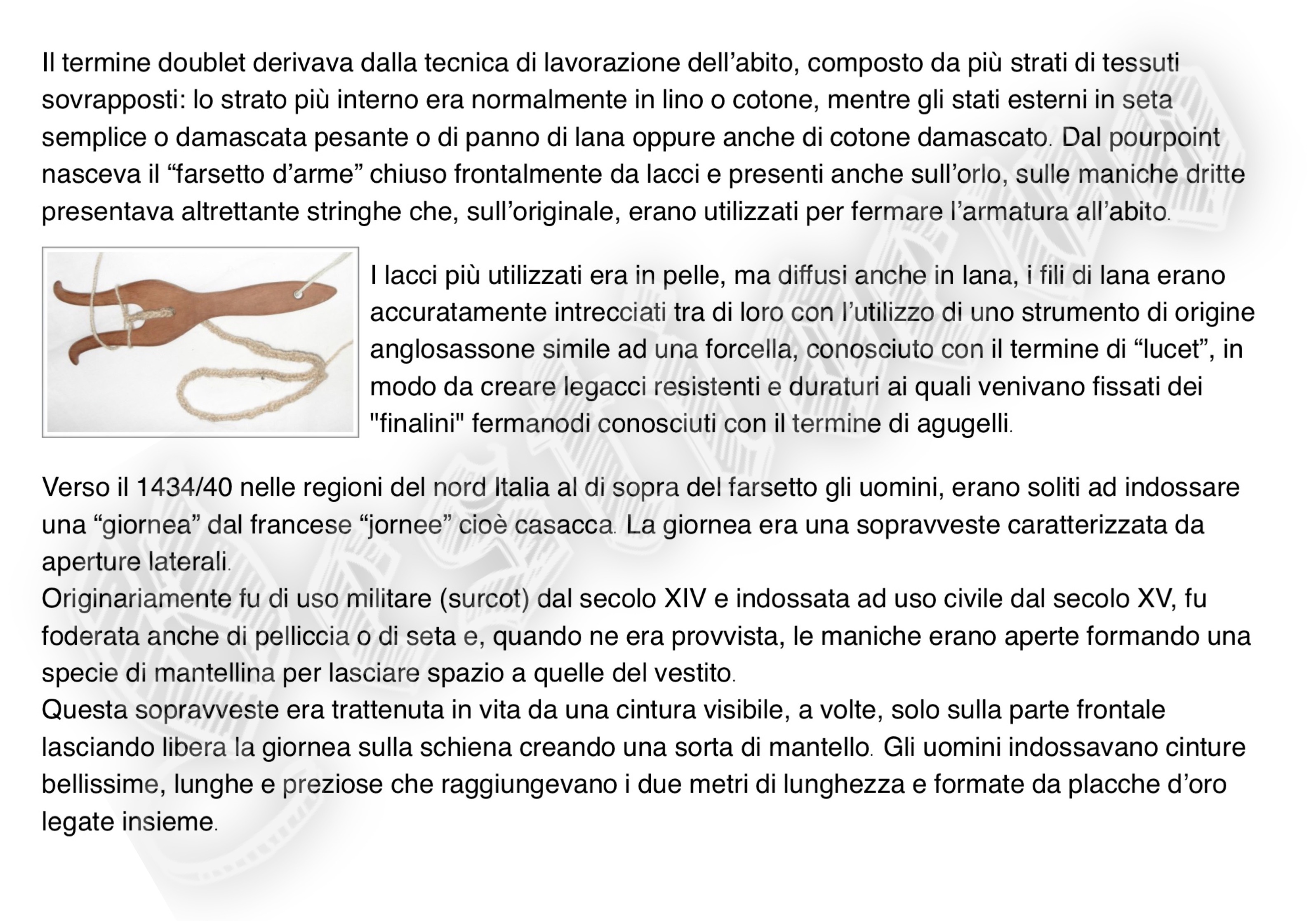 La storia di Fiorenzuola esposta attraverso i cambiamenti e le innovazioni stilistiche medievali, dalle tuniche, bliaut, alle giornee, pellande e farsetti; dalla Via Francigena al Rinascimento con oggetti, abiti, informazioni e curiosità.