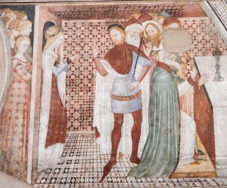 La sezione dei grandi affreschi provenienti dal territorio piacentino offre un’ampia visuale sull’abbigliamento maschile e femminile tra Trecento e quattrocento e la definizione delle immagini permette di notare la lavorazione dei tessuti e le cuciture.