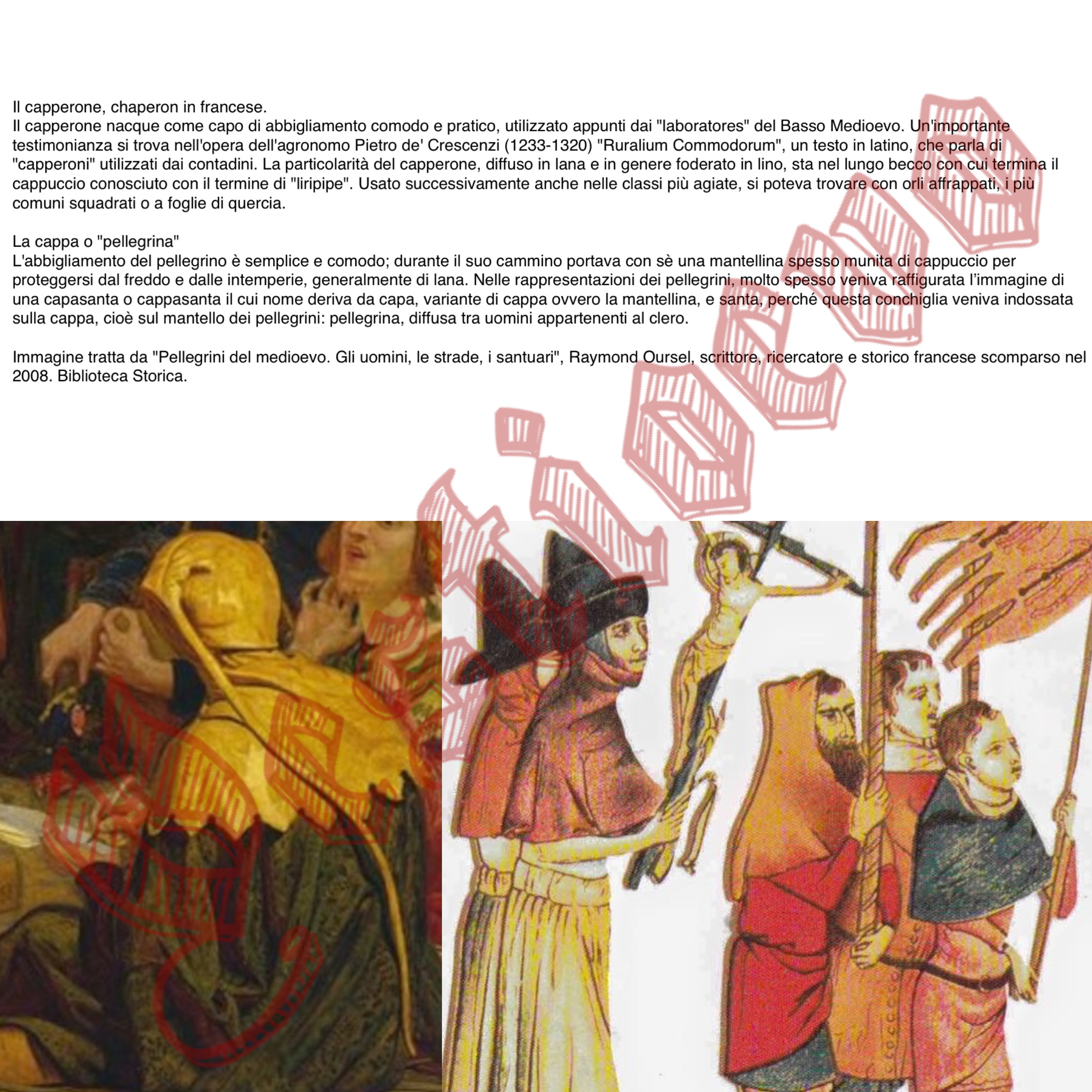 Di seguito copricapi, mantelli, berretti e cappelli. Una domanda porta a fare una digressione sulla differenza tra cappa (conosciuta come “pellegrina” in quanto nei testi si trova tra l’abbigliamento del pellegrino) e capperone, ovvero mantellina con un lungo liripipe chiuso e cucito alla punta del cappuccio, indossato sia come mantellina sia come turbante o cappuccio.
