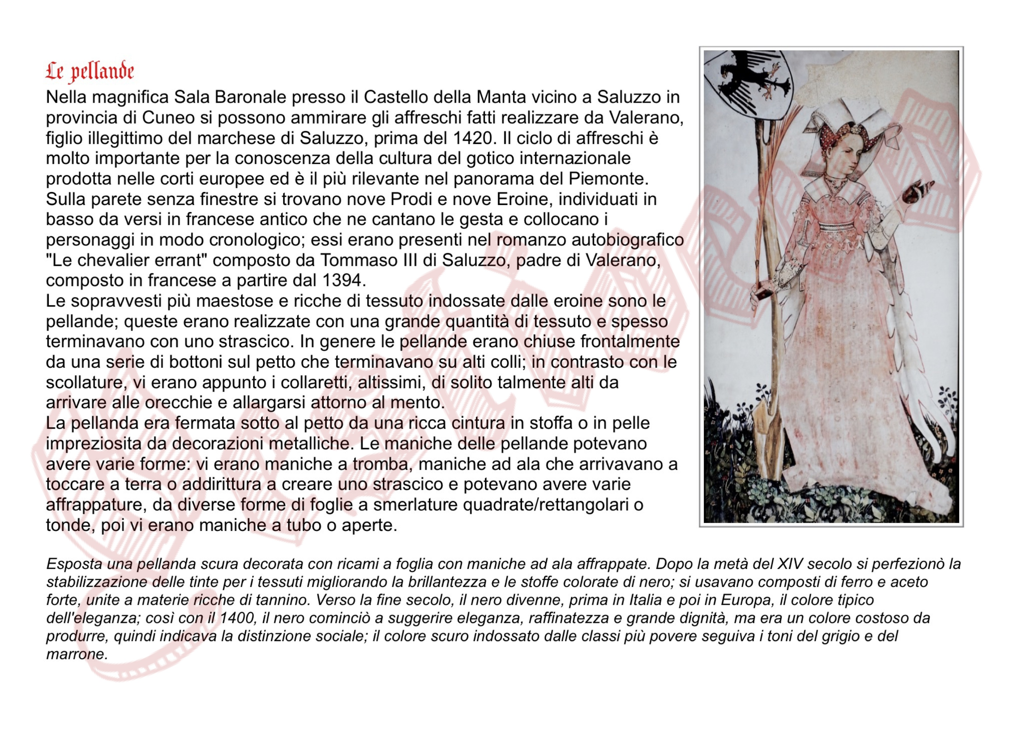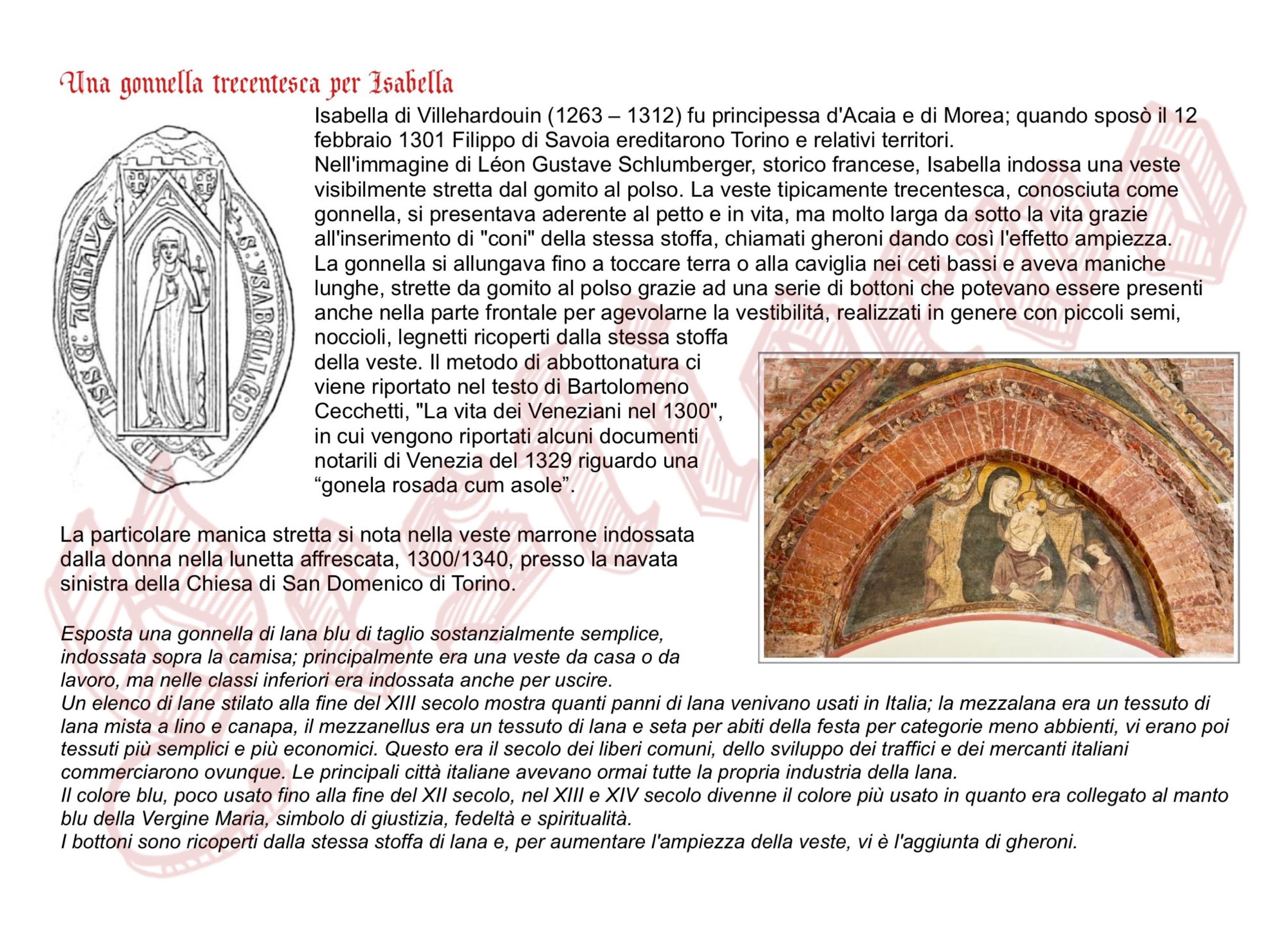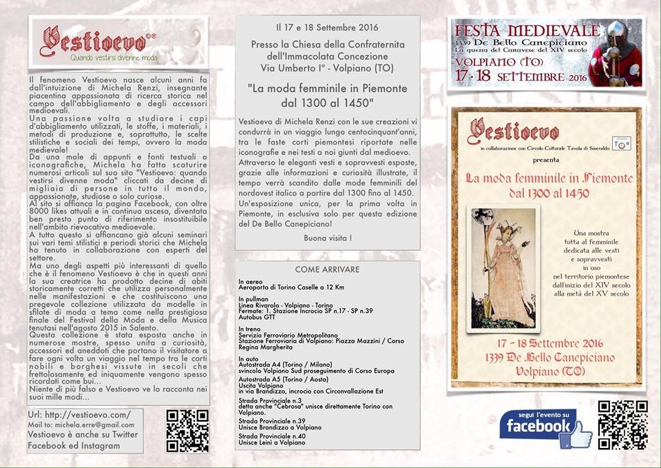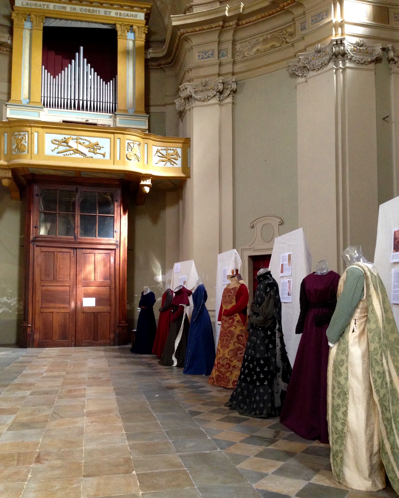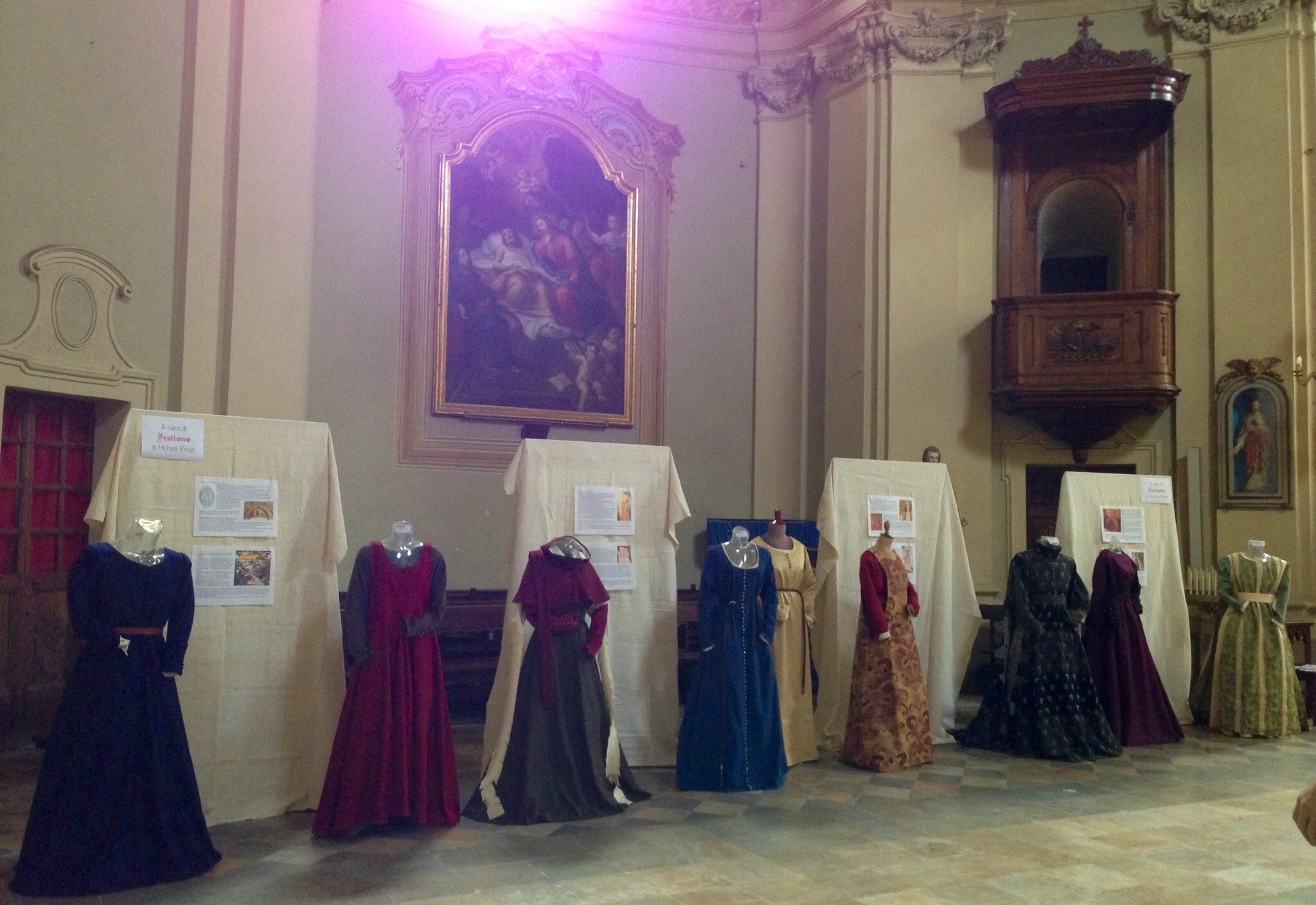In collaborazione con gli organizzatori Somà e Furlini di Castrum Vulpiani e Tavola di Smeraldo, in occasione dell’evento “1339 – De Bello Canepiciano – La guerra in canavese”, nei giorni 17 e 18 settembre, è stata allestita una mostra tutta al femminile dedicata alle vesti e sopravvesti in uso nel territorio piemontese dall’inizio del XIV secolo alla metà del XV secolo a cura di Michela Renzi di Vestioevo, presso la Chiesa della Confraternita dell’Immacolata Concezione in via Umberto I, in centro paese.