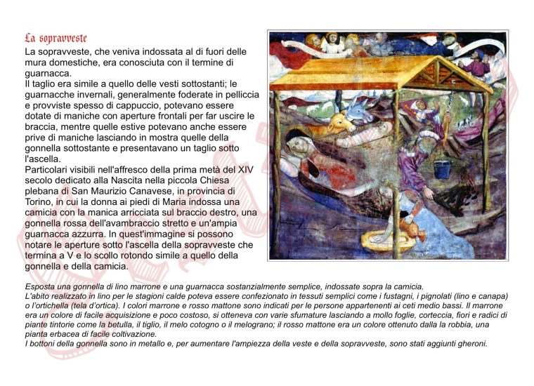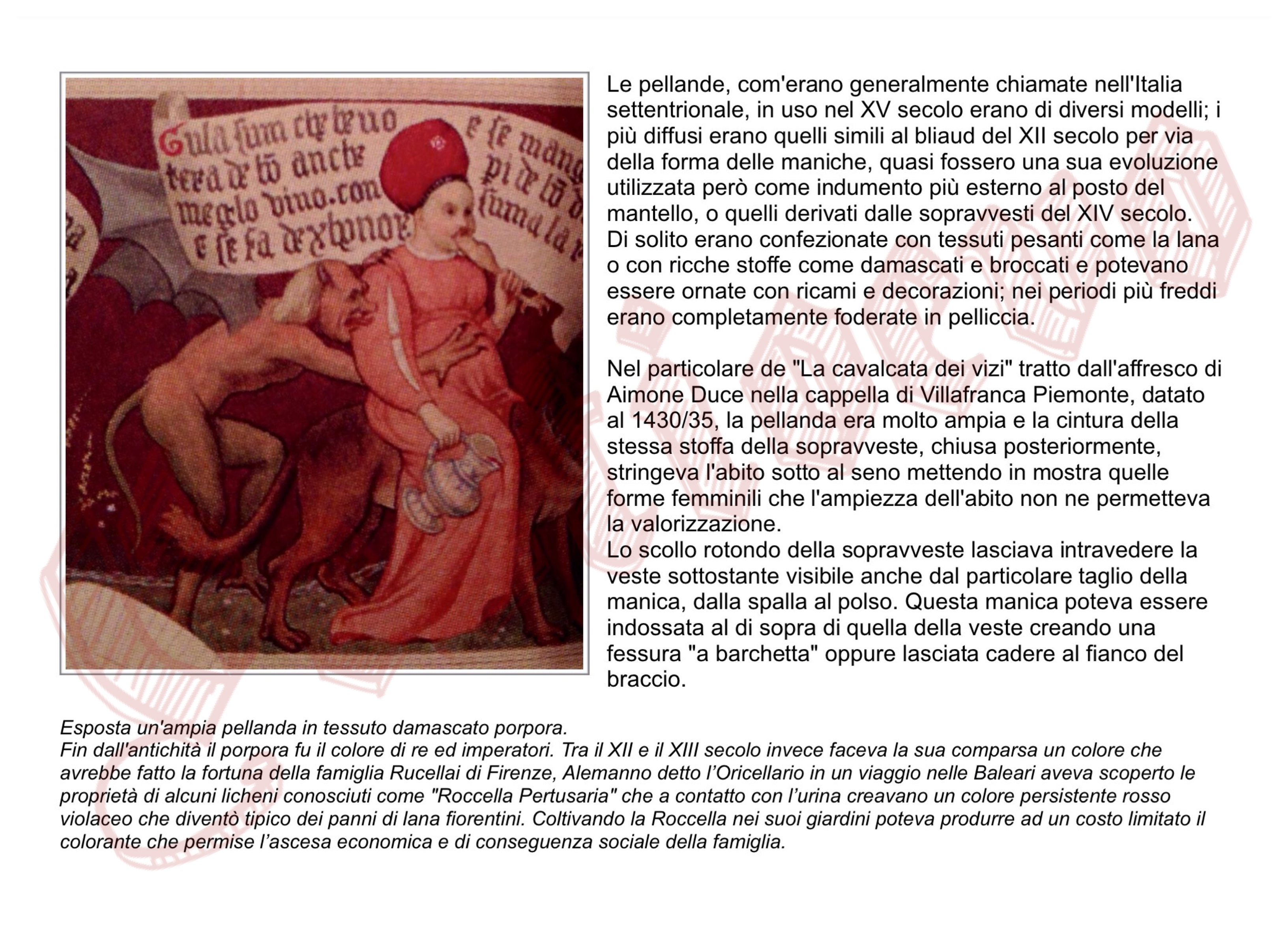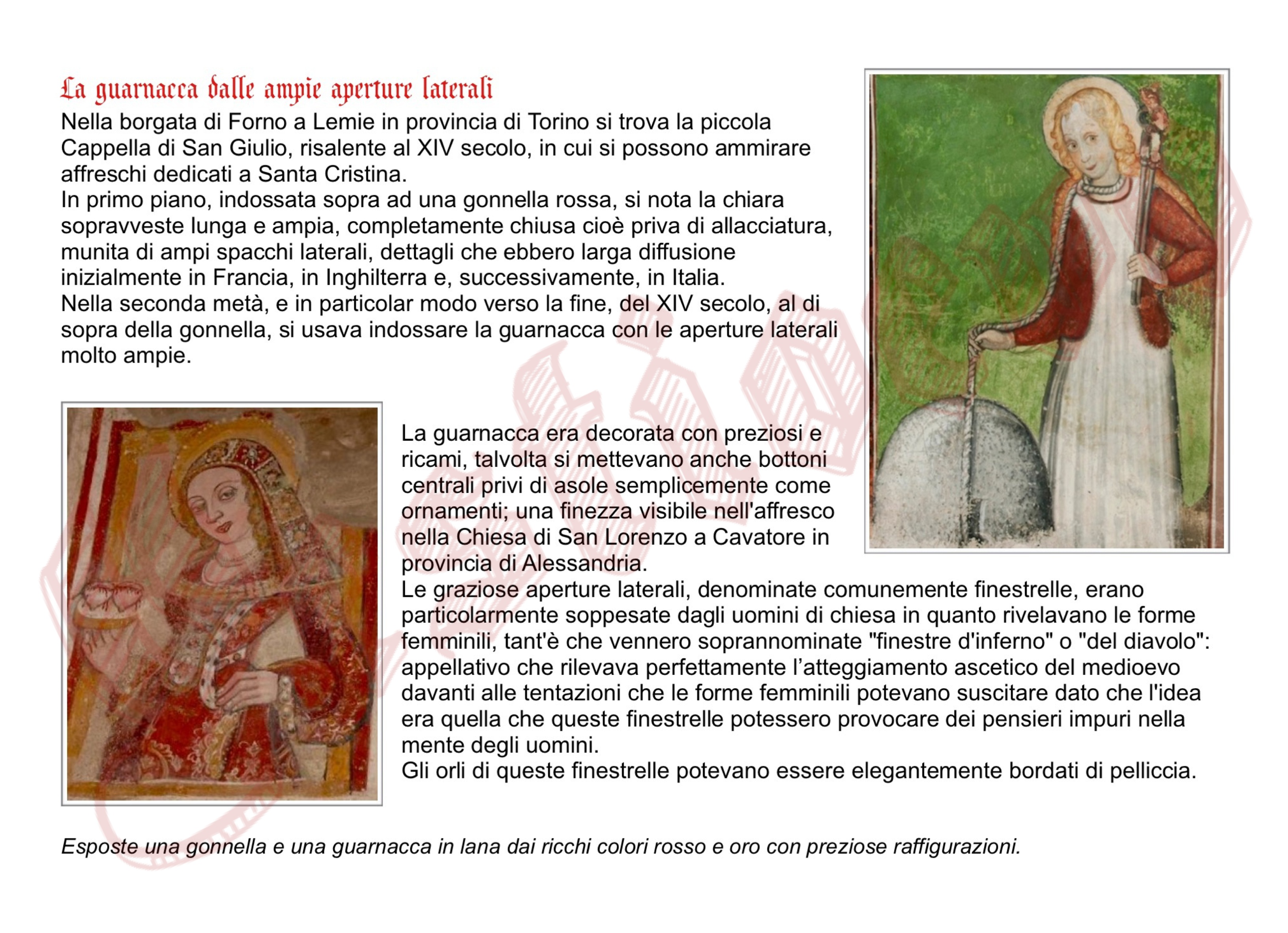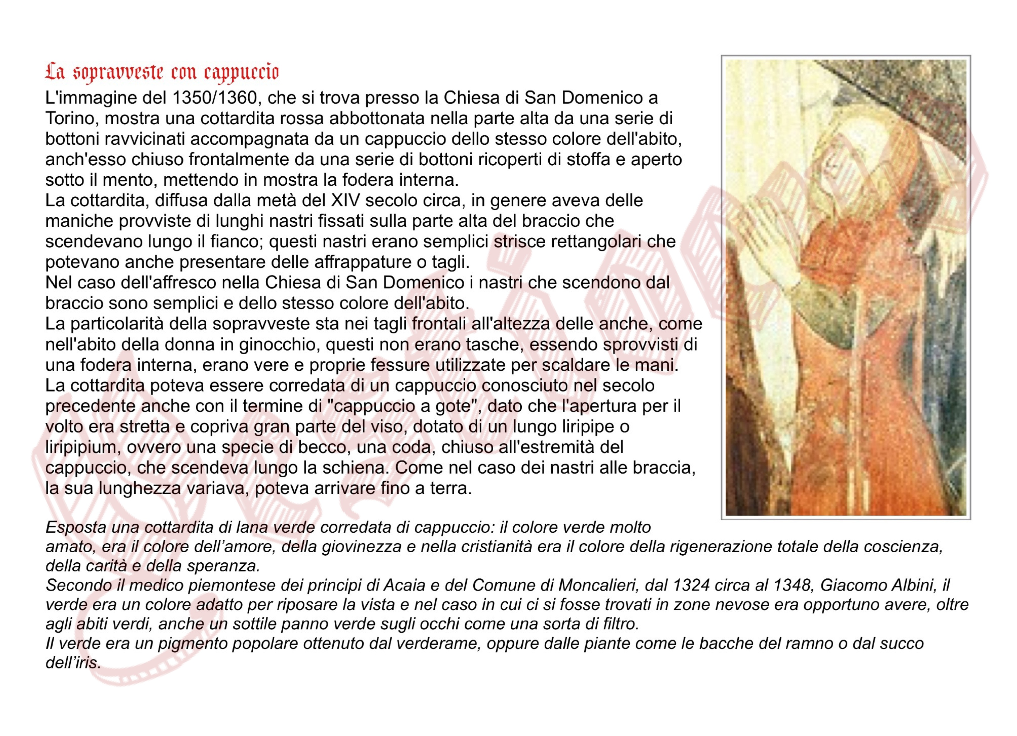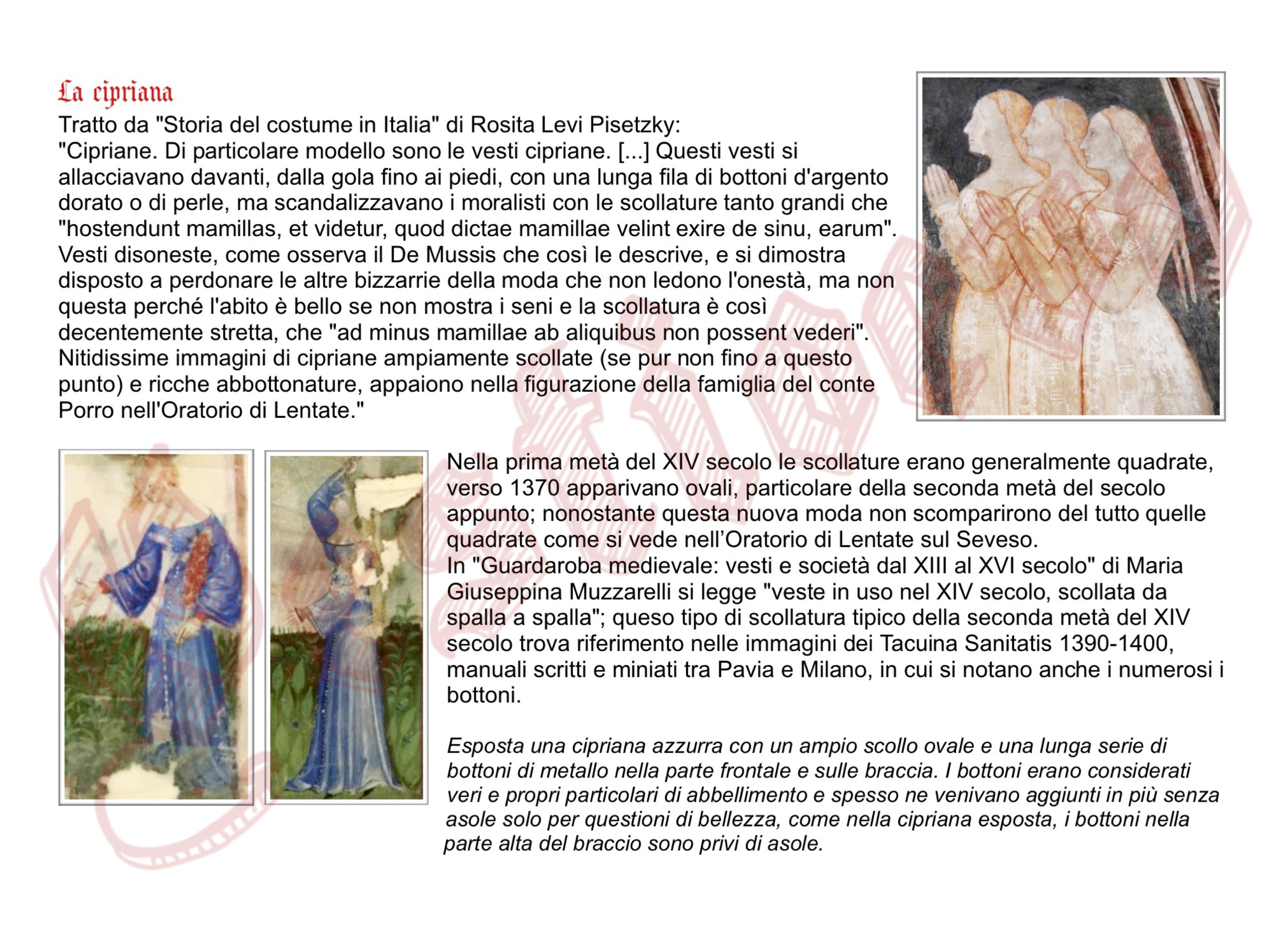 In collaborazione con gli organizzatori Somà e Furlini di Castrum Vulpiani e Tavola di Smeraldo, in occasione dell’evento “1339 – De Bello Canepiciano – La guerra in canavese”, nei giorni 17 e 18 settembre, è stata allestita una mostra tutta al femminile dedicata alle vesti e sopravvesti in uso nel territorio piemontese dall’inizio del XIV secolo alla metà del XV secolo a cura di Michela Renzi di Vestioevo, presso la Chiesa della Confraternita dell’Immacolata Concezione in via Umberto I, in centro paese.