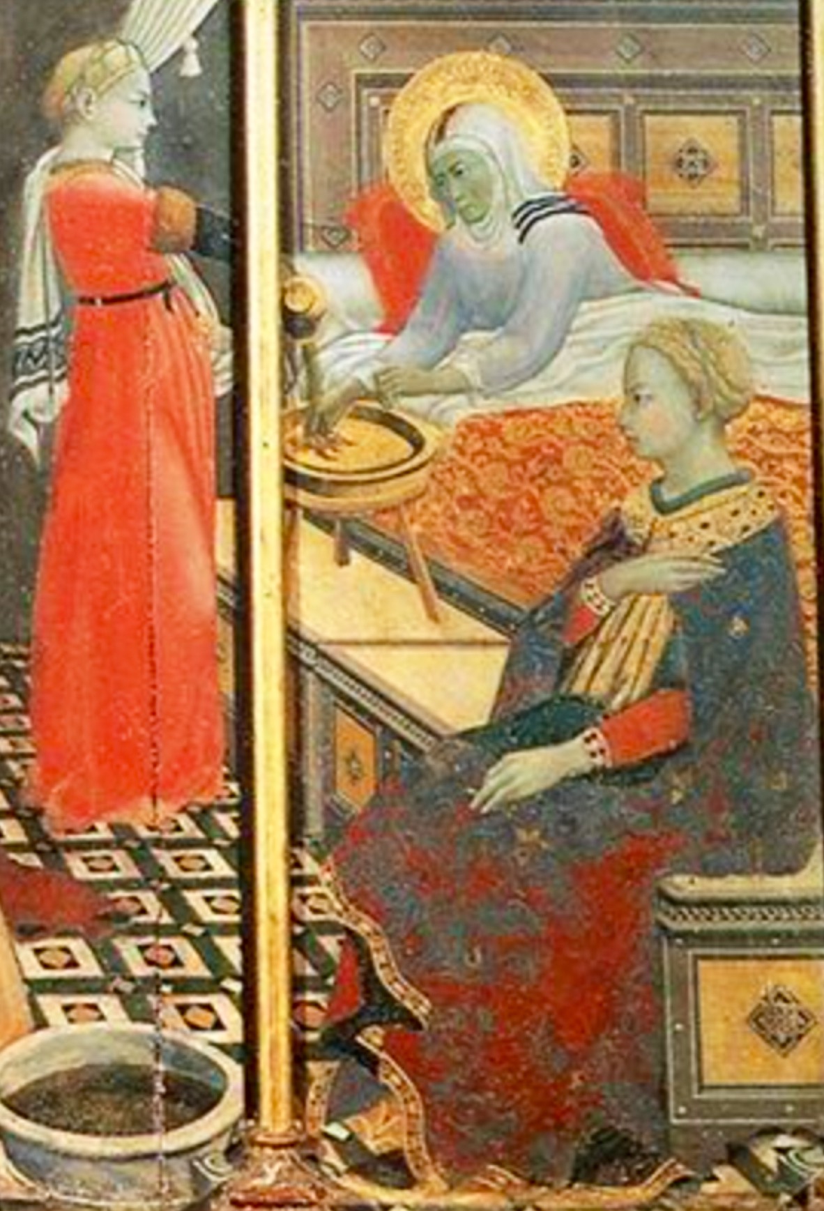 L’autore raffigura nell’opera numerosi dettagli di vita quotidiana in un ambiente domestico della Siena di allora. La scena principale mostra Sant’Anna che ha appena partorito, mentre si sta riposando in un letto coi cassoni, una donna, che scosta la tenda attorno al letto, le porta dell’acqua per lavarsi le mani in un bacile, ed altre due si stanno occupando della bambina, lavandola in una tinozza e avvolgendola in panni puliti e scaldati al fuoco del camino; un’altra donna sta portando qualcosa da mangiare.