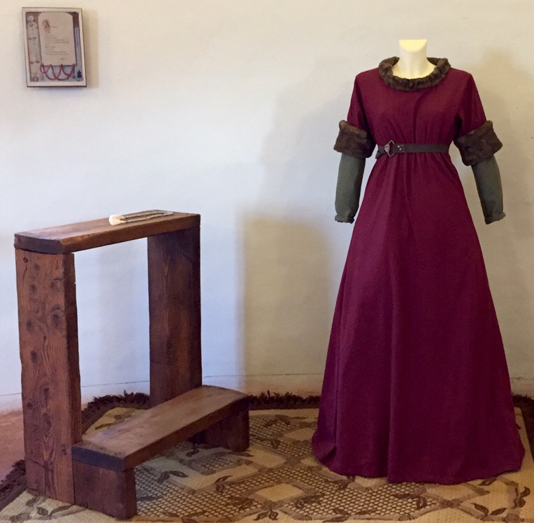 La donna in piedi a lato del letto indossa una cioppa rossa foderata in pelliccia stretta sotto al seno da una cintura in cuoio.