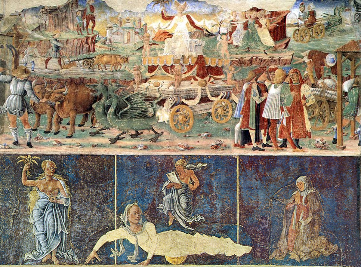 Da http://www.artecultura.fe.it/378/il-salone-dei-mesi: “Autore del programma iconografico – una sorta di grande calendario nel quale si mescolano le esigenze celebrative di Borso, la mitologia antica e l’astrologia araba – è Pellegrino Prisciani, astrologo e bibliotecario di corte. Per quanto attiene invece l’ideatore artistico questo è stato a lungo identificato in Cosmè Tura. Si tratta, in realtà, di una notizia destituita di qualsiasi fondamento e le poche certezze relative all’autografia delle decorazioni si riferiscono alla parete est, dove fu attivo Francesco del Cossa, come prova una lettera che egli stesso indirizzò a Borso nel marzo del 1470.”