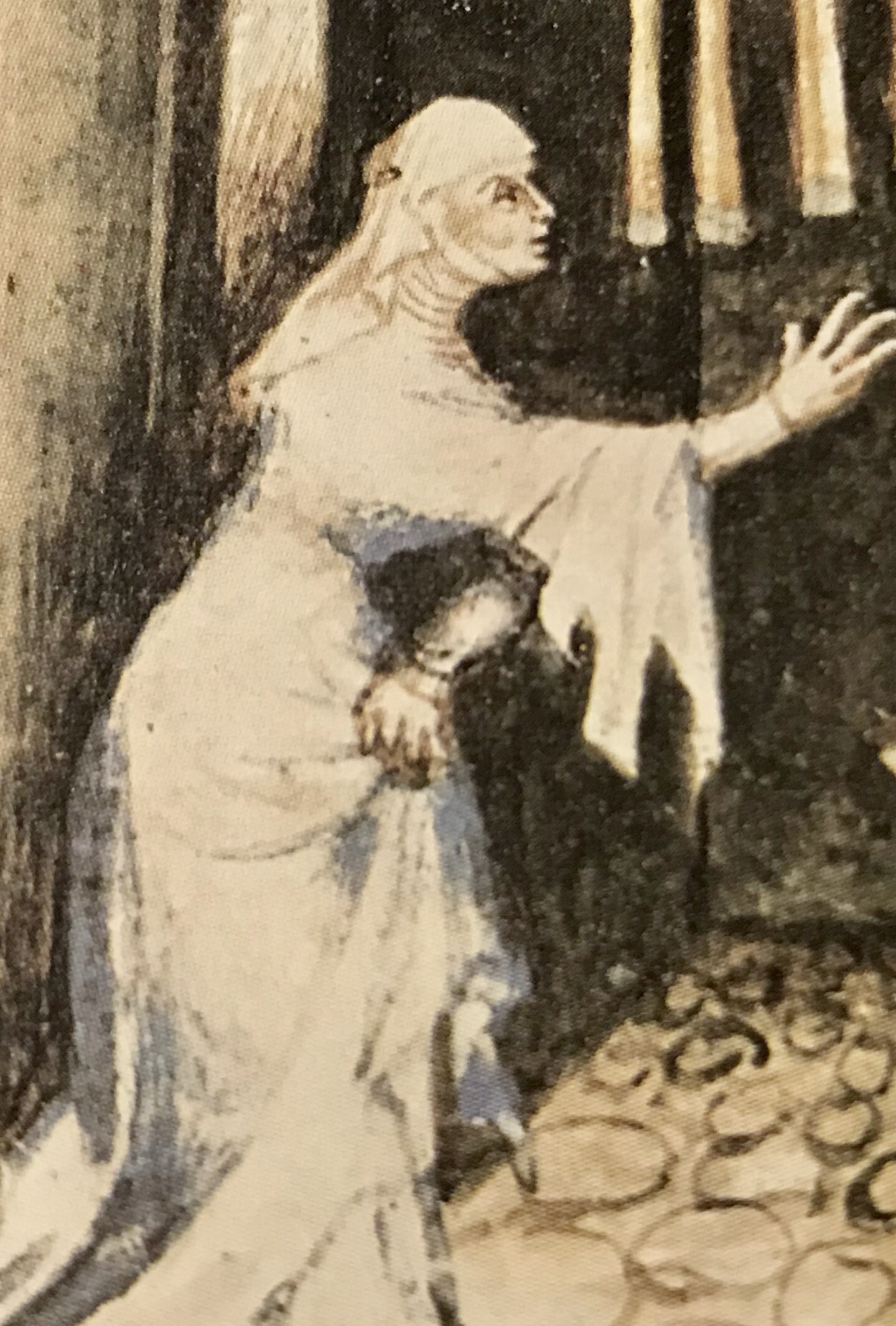 Da notare invece il particolare delle maniche nell’uomo, il braccio destro ha il taglio con il braccio largo e l’avambraccio stretto. Ovviamente, dopo la metà del XIV secolo, l’uso dei bottoni era diffuso in tutte le classi sociali dunque per creare questa aderenza sono stati utilizzati una serie di bottoni sull’avambraccio.