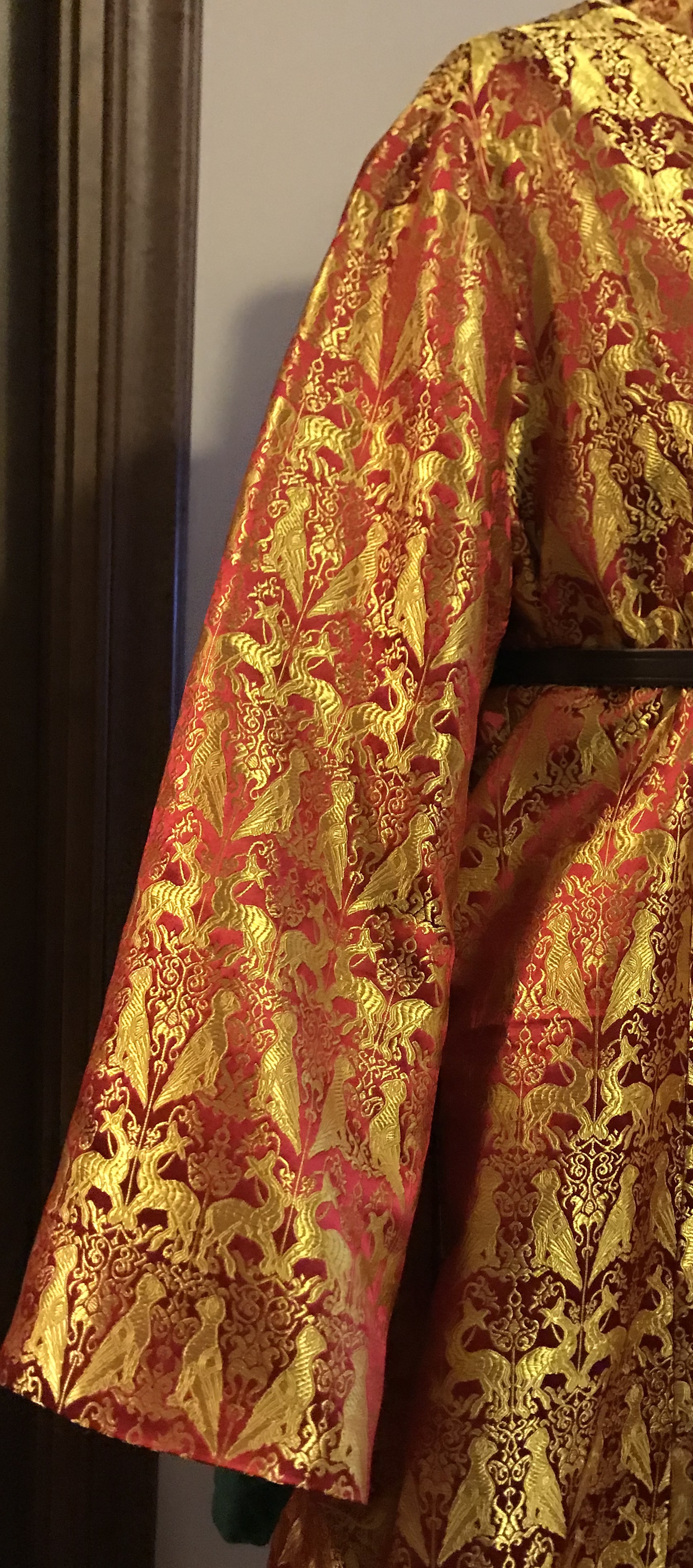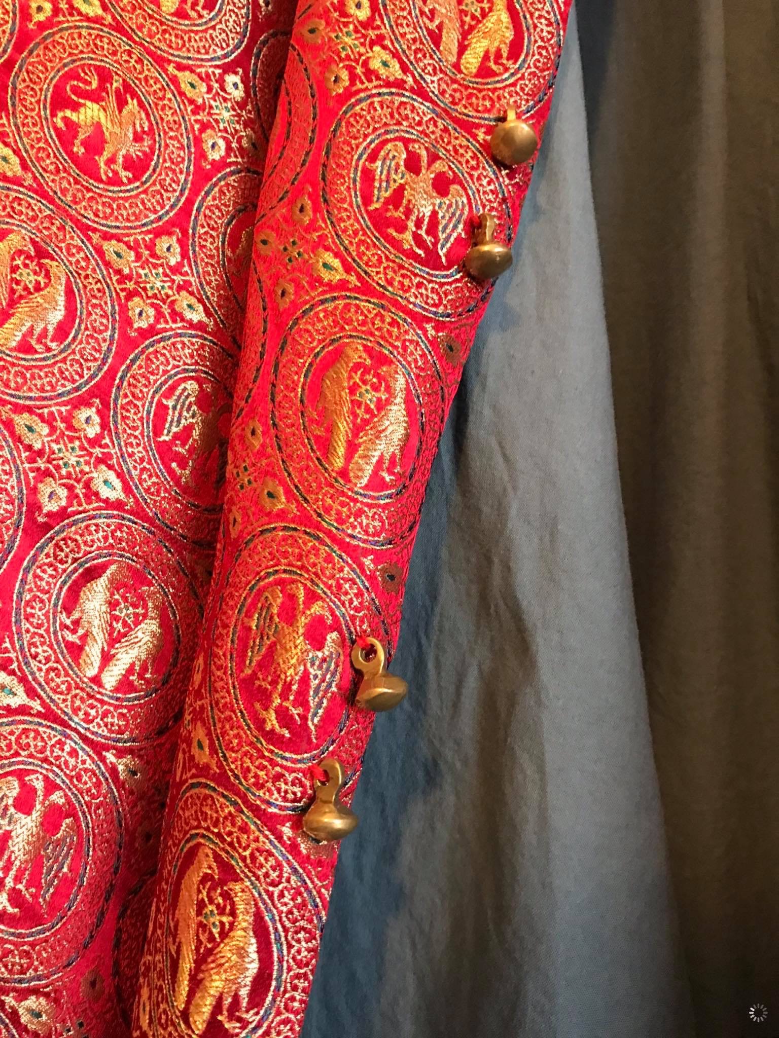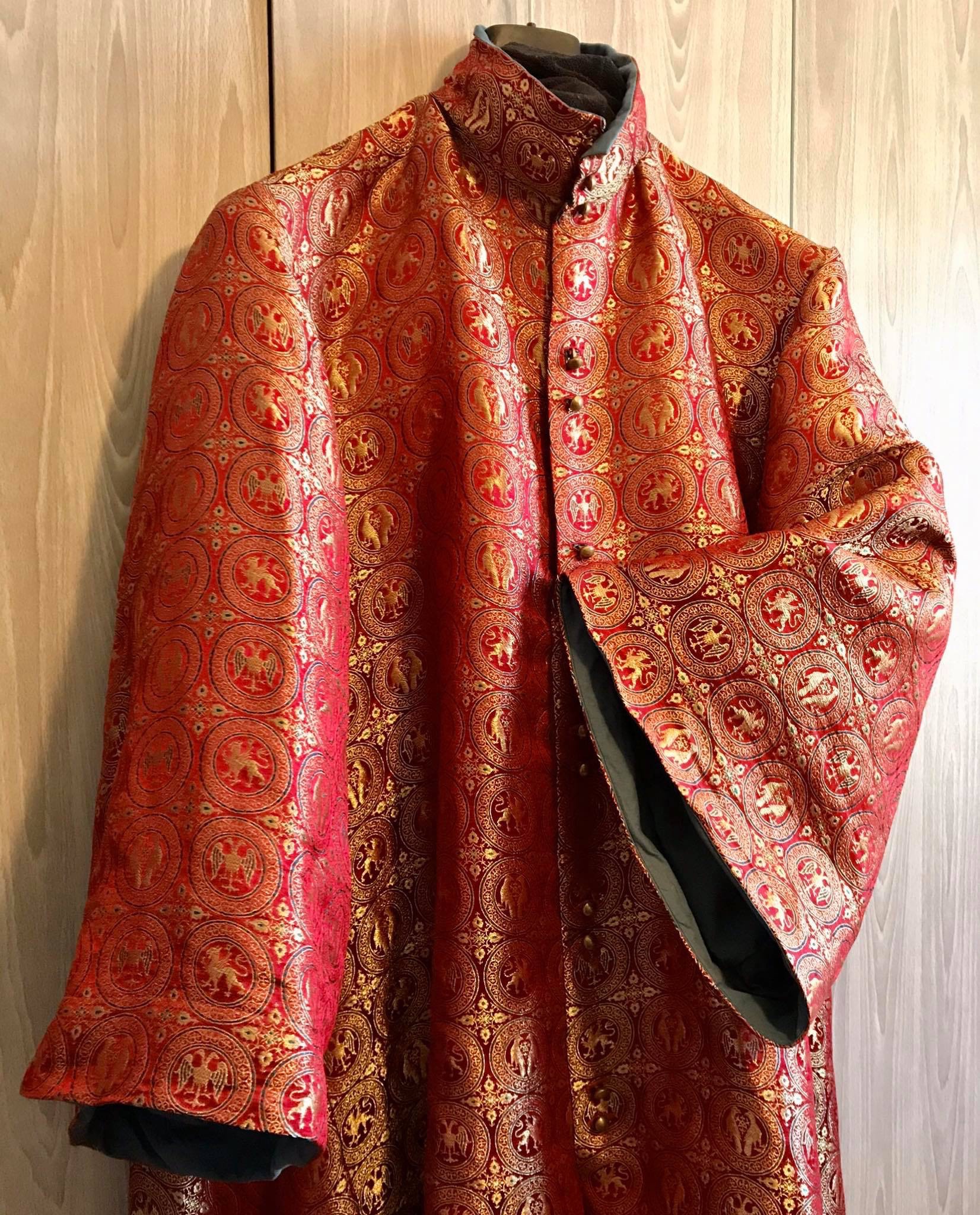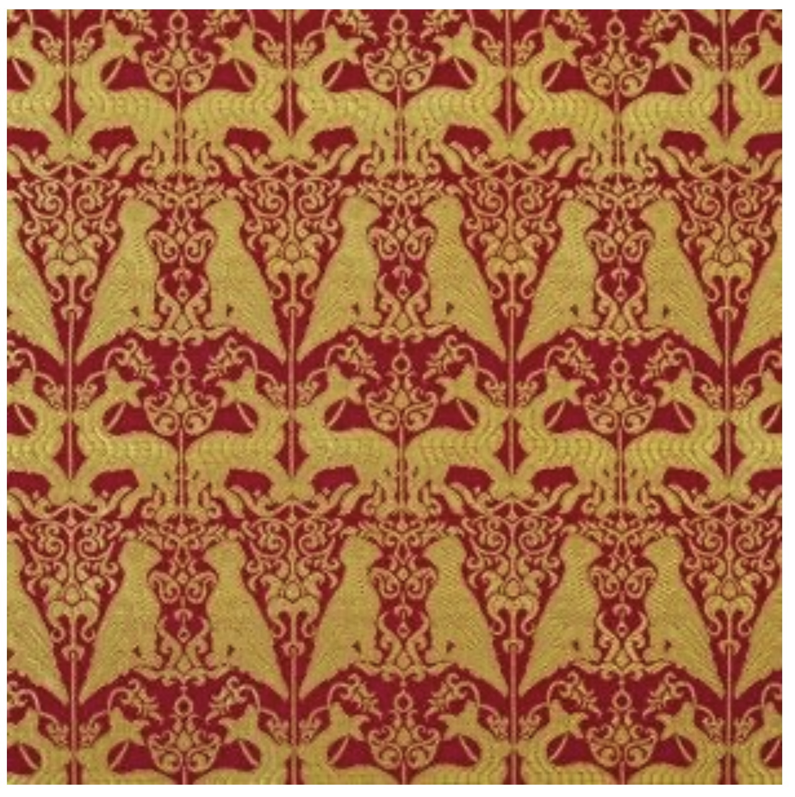 Questo broccato è una replica di una seta bizantina del XII secolo che fu trovata a Palermo, in Sicilia, nella tomba di Enrico VI, imperatore del Sacro Romano Impero e re di Sicilia.