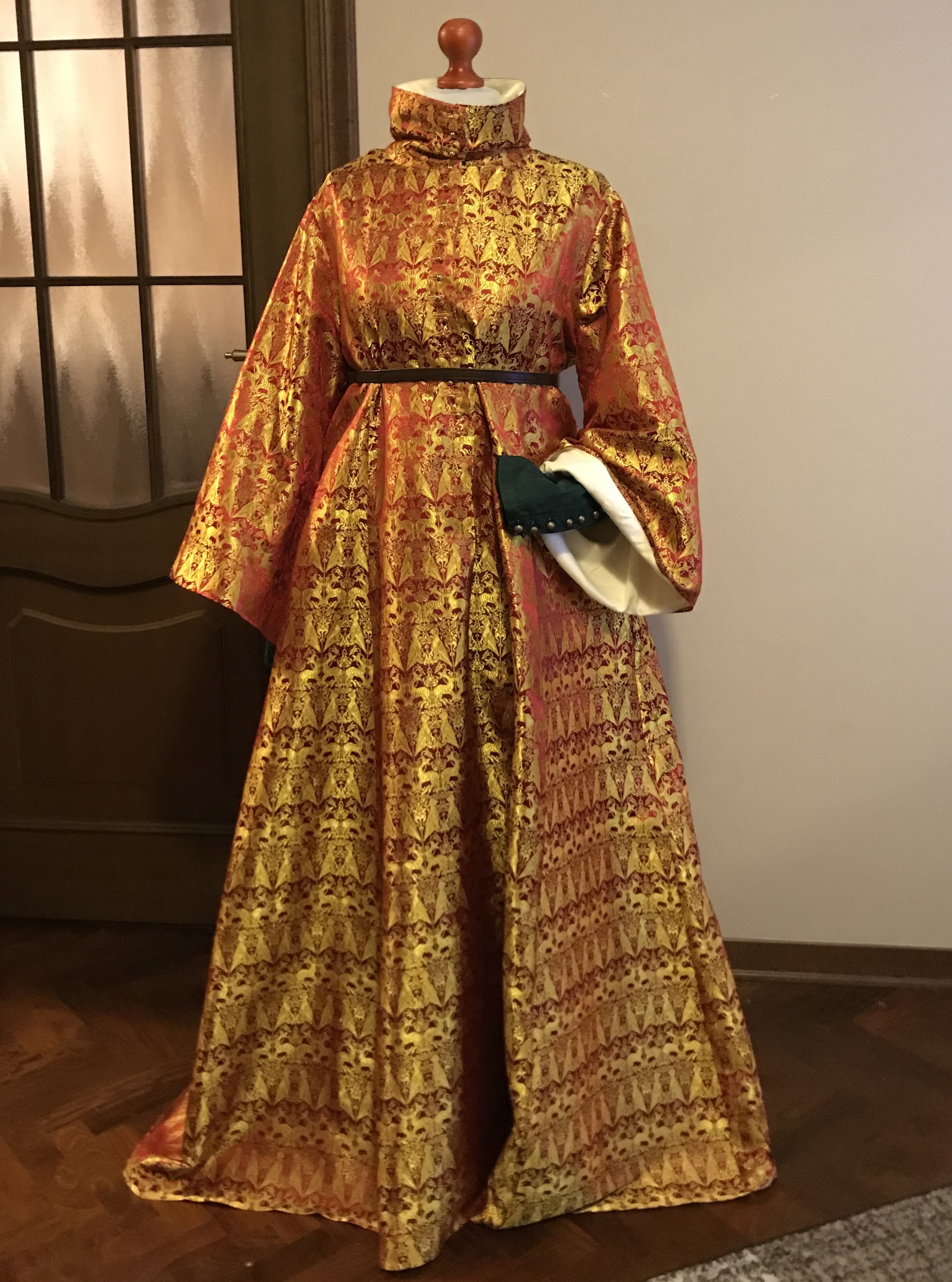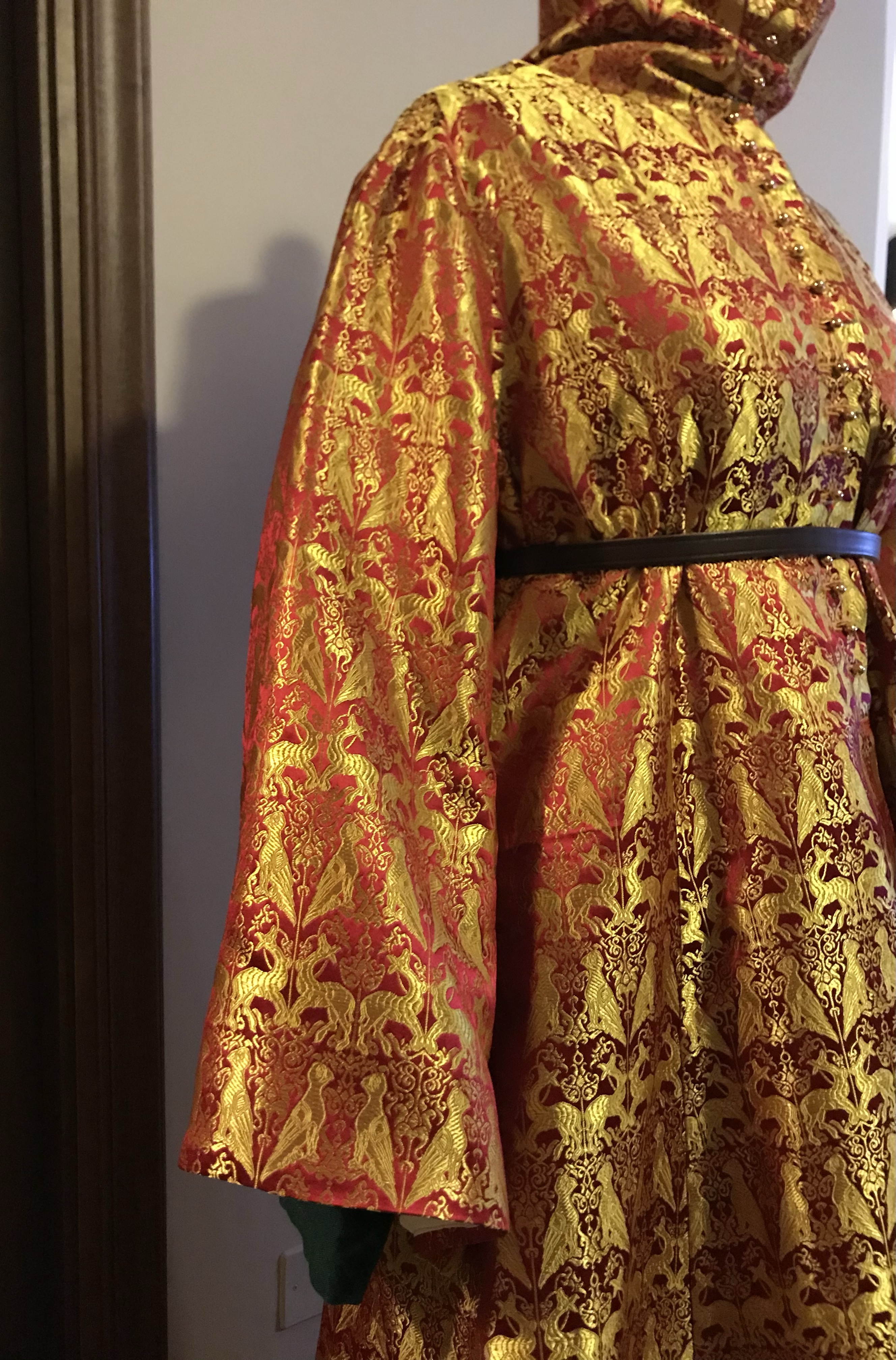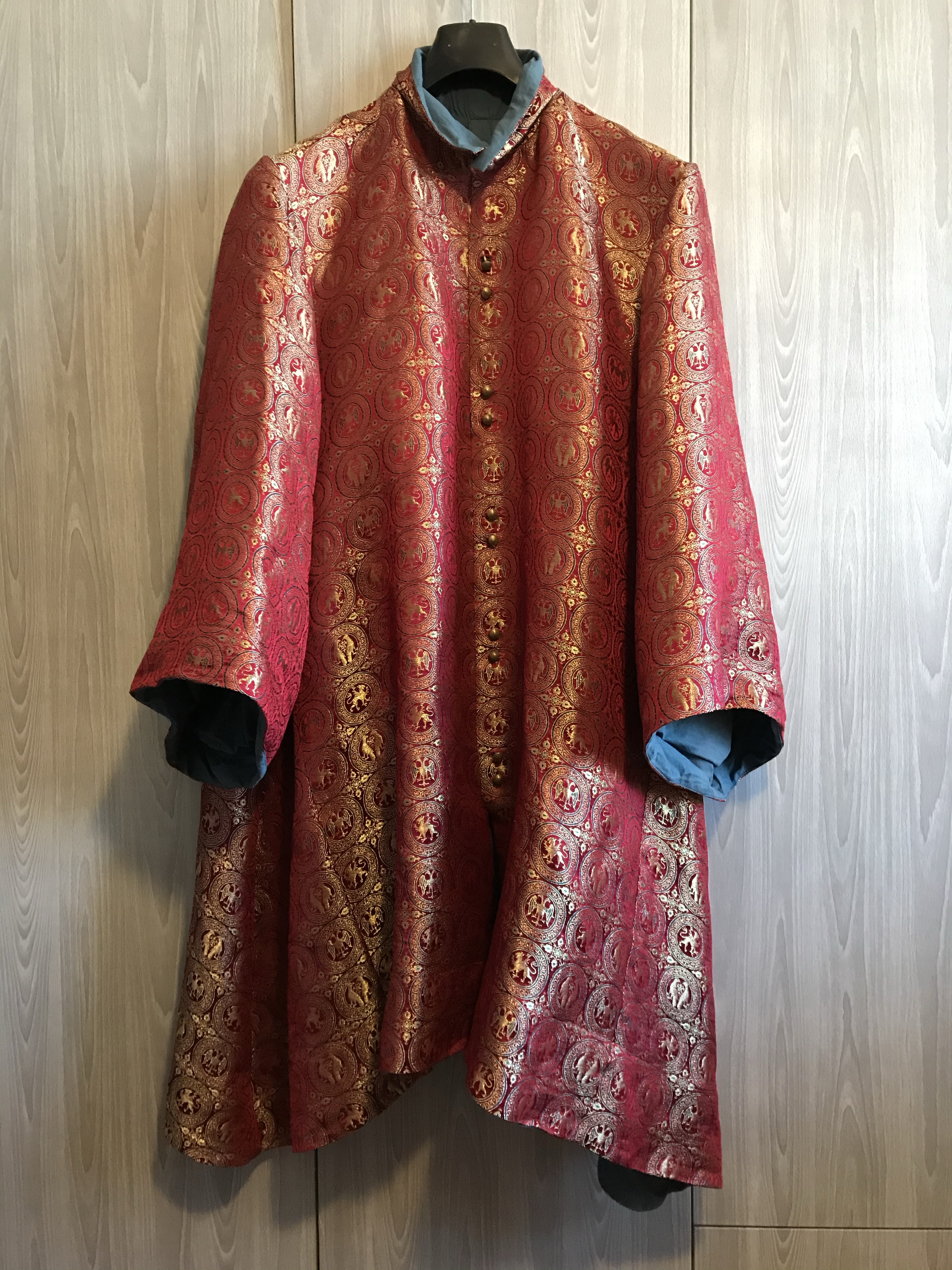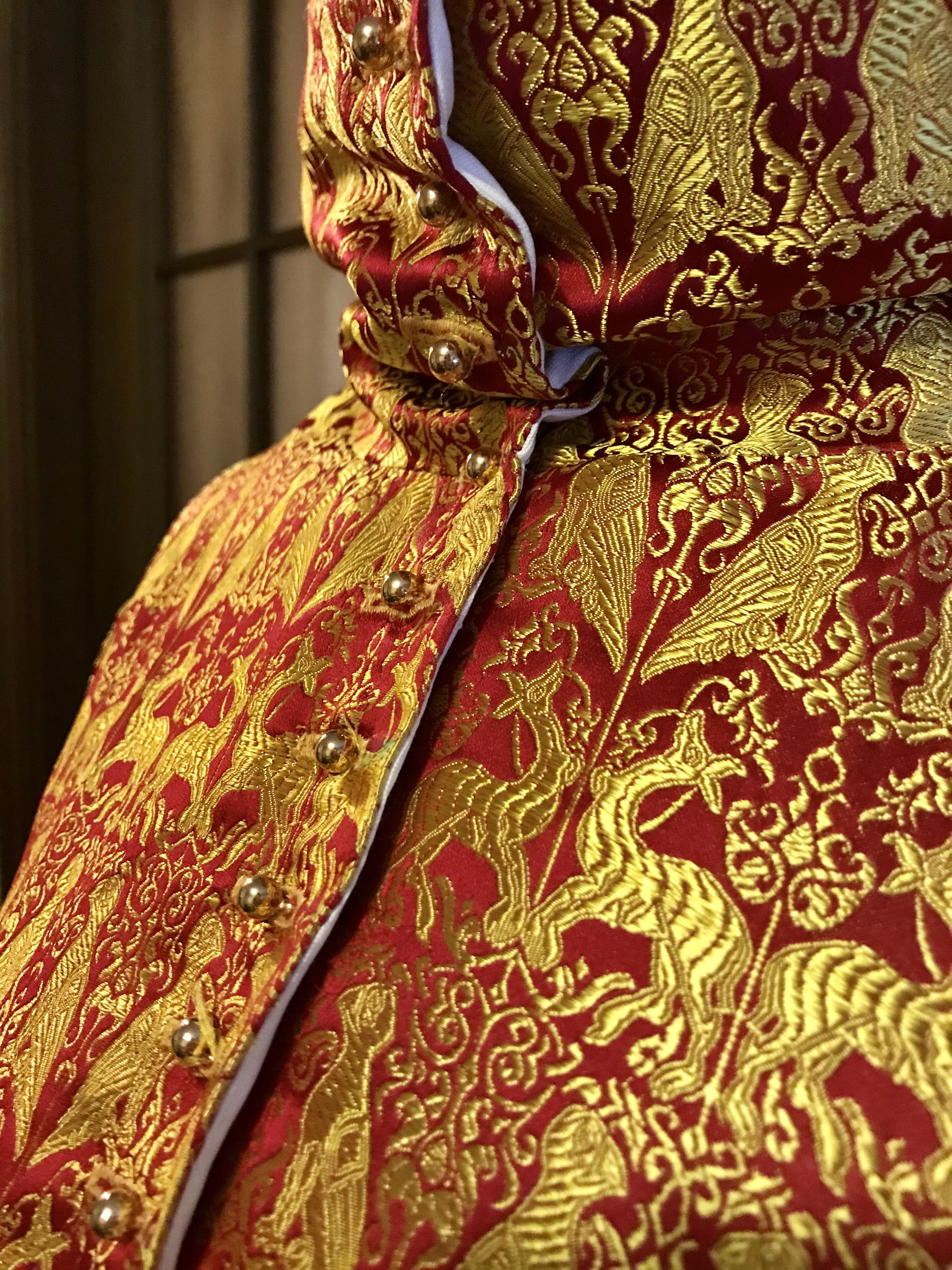 Questo broccato è una replica di una seta bizantina del XII secolo che fu trovata a Palermo, in Sicilia, nella tomba di Enrico VI, imperatore del Sacro Romano Impero e re di Sicilia.